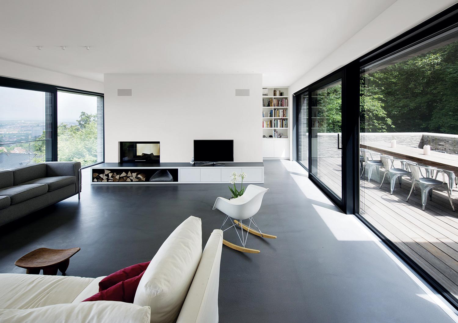 Darüber hinaus harmoniert der graue Klinker mit den Sichtbetonflächen, welche in Form von Fertigteilen auch sämtliche Fenstersimse, Terrassenbrüstungen und Attiken bilden. Das Wohnhaus beinhaltet eine 240 qm große Bauherrenwohnung über zwei Etagen sowie eine 125 qm große Einliegerwohnung im Gartengeschoss. Der Hauseingang befindet sich auf einer Zwischenebene und wird zum Bindeglied der beiden Wohnungsetagen. Eine konisch zulaufende Sichtbetontreppe mit flachen, großen Stufen führt ins offene und lichtdurchflutete Wohngeschoss. Diagonal versetzte Terrasseneinschnitte zonen die offene Küche und den Wohnbereich mit der Arbeitsbibliothek aus. Von der südorientierten Wohnterrasse aus, mit Walaba-Stauseeholz-Dielen belegt, gelangt man über eine ins Gebäude integrierte Wendeltreppe auf die Dachterrasse. Großflächige, raumhohe Holz-Aluminium Schiebefenster erlauben eine größtmögliche Transparenz und thematisieren das Durchwohnen. Eine eingestellte, umlaufbare Wandscheibe mit offenem Kamin trennt die Bibliothek vom Wohnraum.