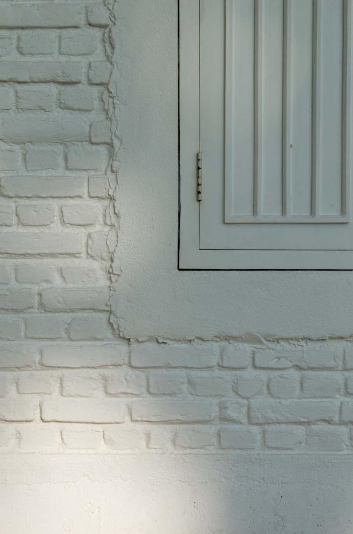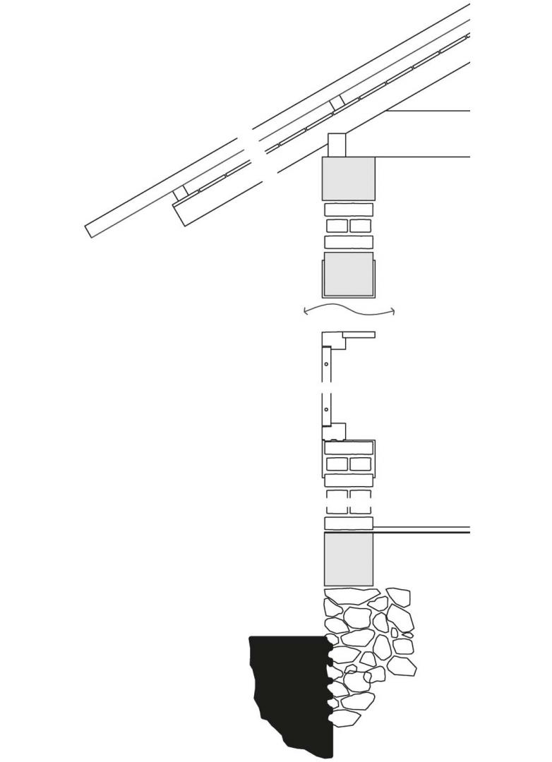Auf den Backsteinwänden liegt ein Stahlbeton-Spannbalken, der für die nötige strukturelle Stabilität sorgt. Der Spannbalken wurde direkt auf dem Mauerwerk gegossen, sodass der Beton durch die Verschalung an den Backsteinen heruntertropfen konnte. Durch den Blockverband wird das rustikale Aussehen der Backsteine noch verstärkt. Da die Binder- und die Läuferschicht unterschiedlich breit sind, wirkt die Fassade leicht wellig. Auch die taktilen Eigenschaften der Fassade werden auf diese Art weiter hervorgehoben.