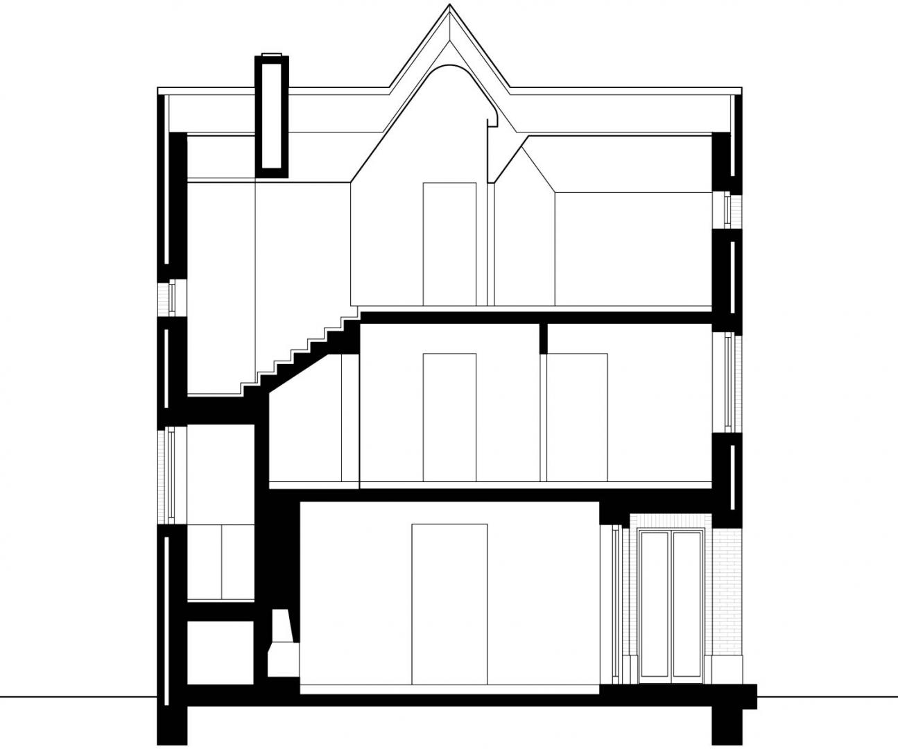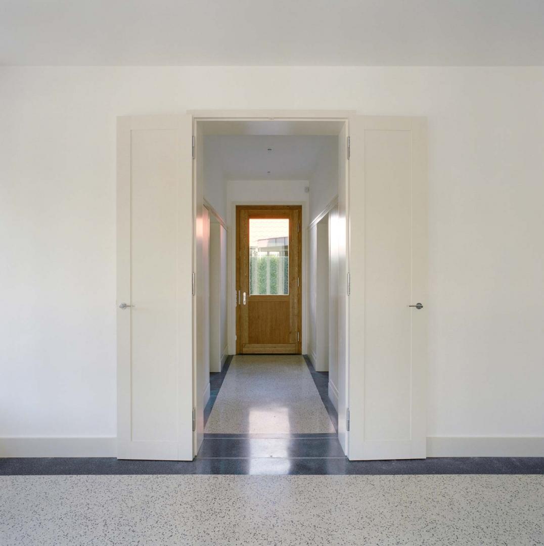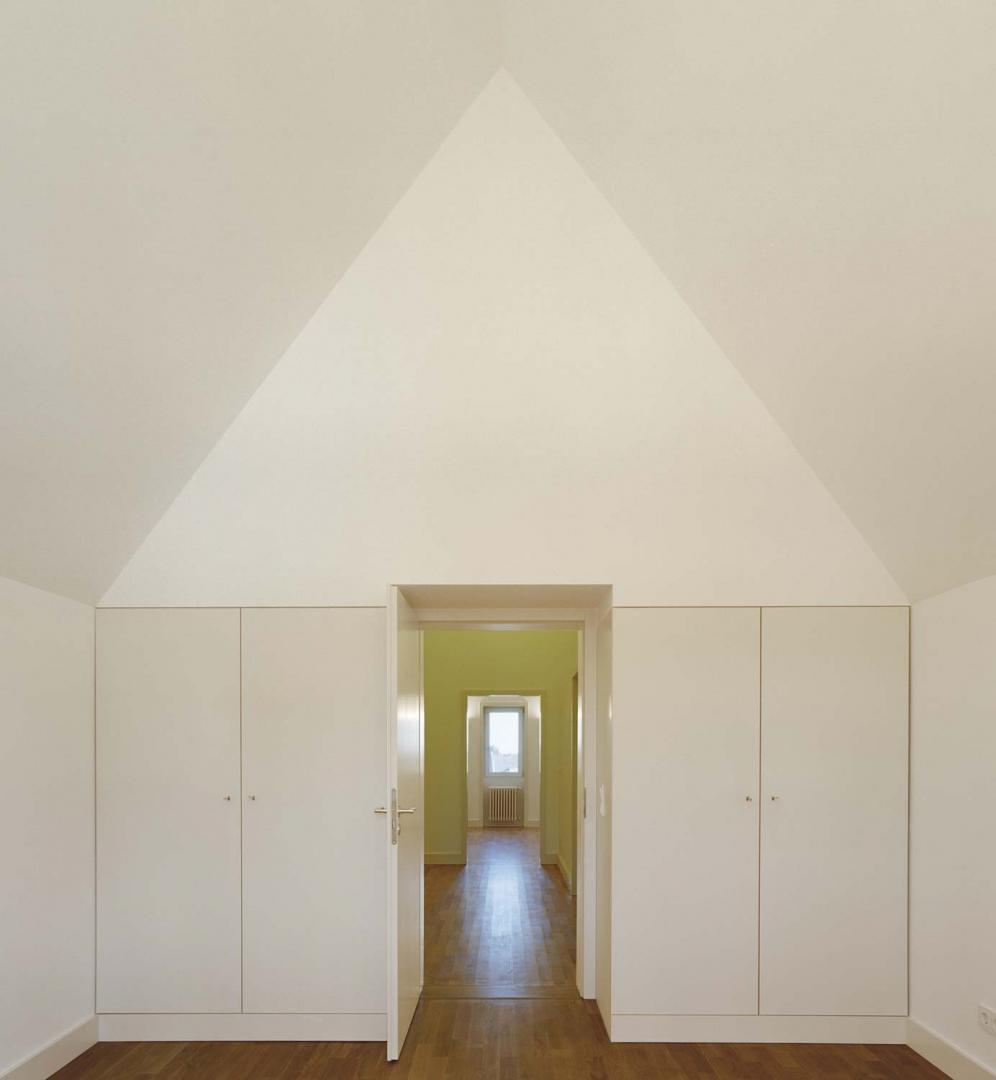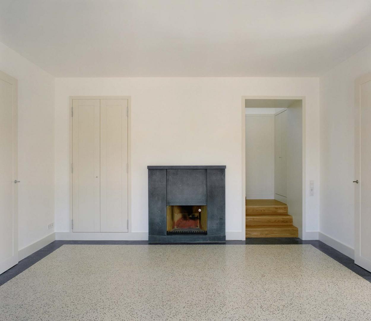 Sie haben Terrazzofußböden, welche in den Haupträumen Entree, Halle und Wohnraum mit Randfries ausgeführt sind. Türen und Wandbekleidungen sind mit Rahmen und Füllung gefertigt. Die Treppe liegt als Pendant der Loggia im Rücken der Halle. Sie führt hinauf ins Obergeschoss mit dem Schlaf- und dem Arbeitszimmer und dann weiter ins Dachgeschoss mit den Gästezimmern. Dem Erdgeschoss entsprechend werden auch die Zimmer in den Obergeschossen über eine zentrale Halle erschlossen. In der Gästeetage ist die Dachform innenräumlich erlebbar. Die Räume erhalten dadurch trotz der formalen Einheit mit dem übrigen Haus einen individuellen Charakter.