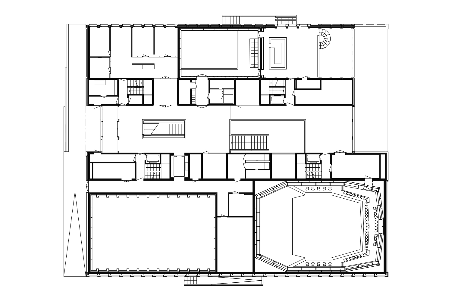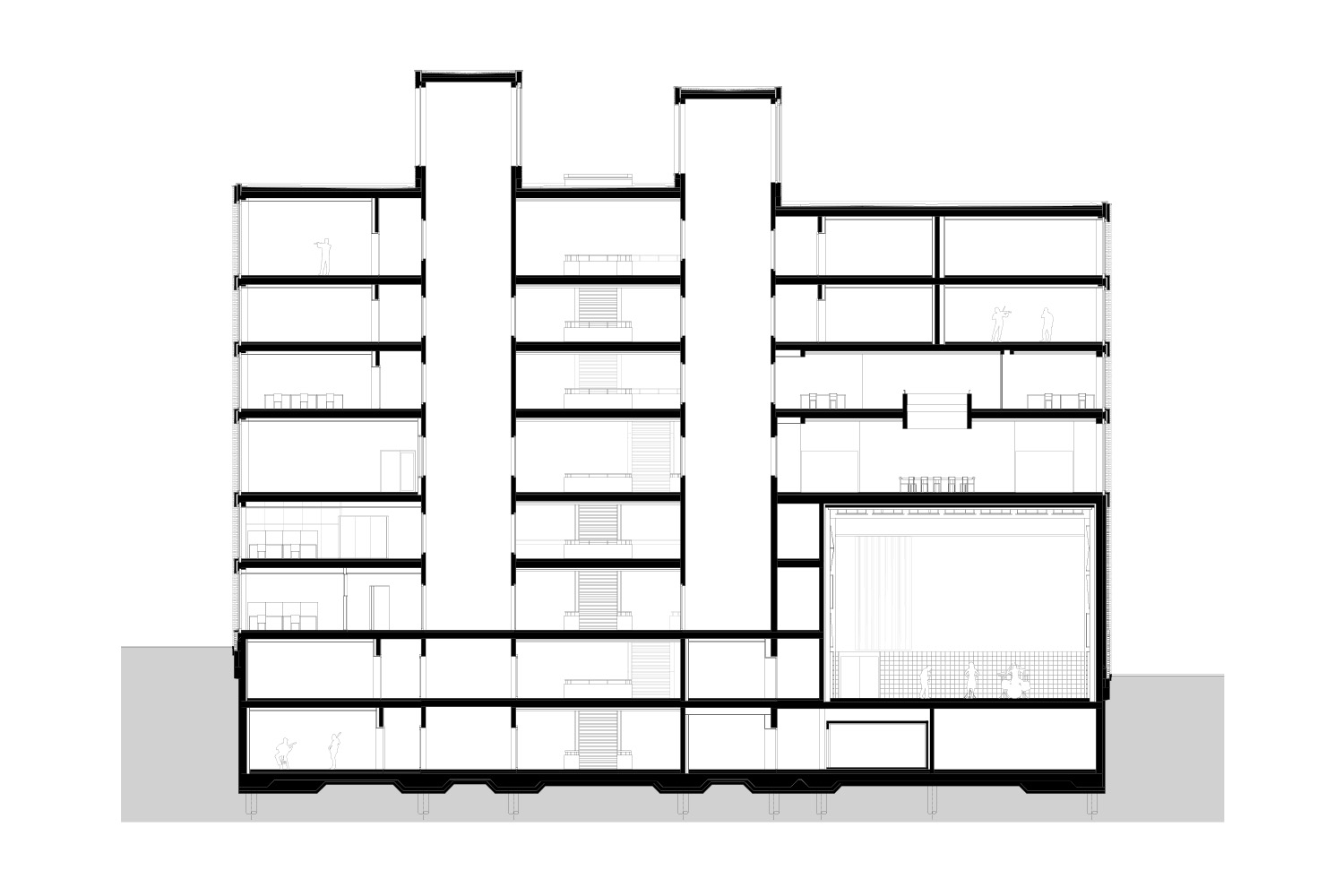 Der Grundriss ist in Schichten aufgebaut. Das Gebäude wird dabei als fünfgliedrige, gerichtete Anlage organisiert. Eine zentrale Längshalle als urbaner Innenraum oder „Stadt in der Stadt“ erschließt großzügig die Geschosse. Sie wird beidseits flankiert von zwei schmalen Infrastrukturstreifen, welche die Fluchttreppenhäuser, Lifte und Nebenräume aufnehmen. Vier Aufbauten stoßen auf dem Dach wie Kamine aus dem Gebäude. Die Lichthöfe darunter durchdringen das ganze Haus und dienen als Klangtürme. Im Parterre reagiert ein zweiseitiger Zugang zur Haupteingangshalle sowohl auf die übergeordnete Adressbildung als auch auf die unterschiedlichen Bedürfnisse an Öffentlichkeit und die damit verbundenen Betriebsabläufe. Die Hauptsäle wie der Kammermusiksaal, die Blackbox und der Jazzclub sind hier zentral angeordnet. Grundsätzlich ist an die zwei gleichwertigen Erschließungsschichten je ein Bund Räume mit der notwendigen Feinverteilung angefügt. Eine Vielzahl von Ensembleräumen und Einzelunterrichtszimmern folgt so in den Obergeschossen. Der räumliche Aufbau erzeugt vielfältige und spannende Raumabfolgen. In den allermeisten Fällen sorgen „Raum in Raum“ Konstruktionen für die Erfüllung der bauakustischen Anforderungen.