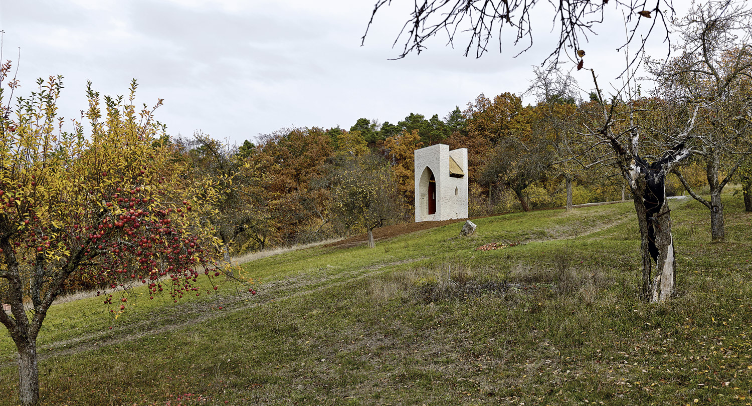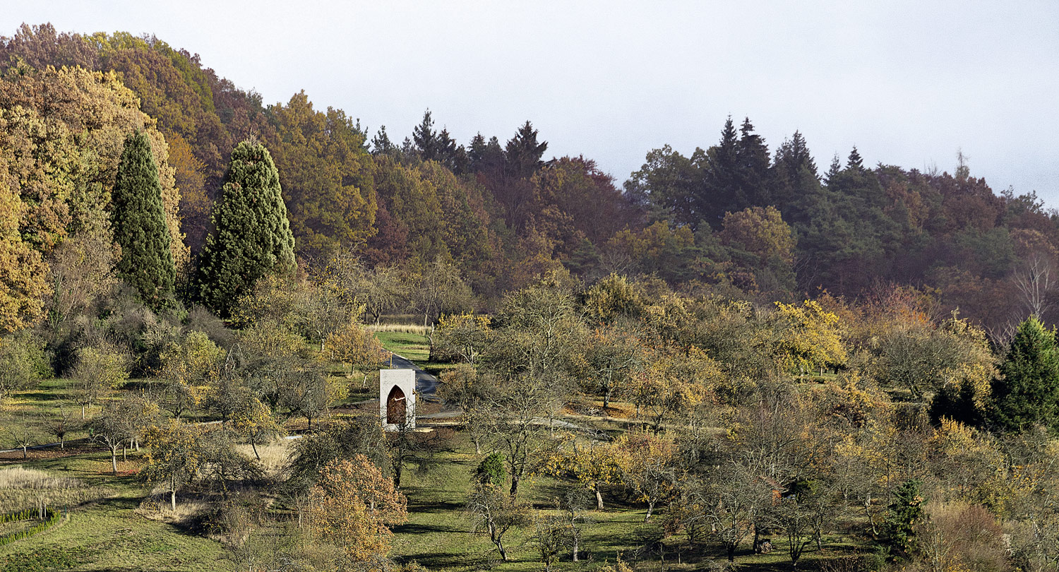 Auf einer für das Remstal typischen Streuobst wiese steht der Hochzeitsturm, dessen Ausgangspunkt ein lokaler Ritus aus dem 18. Jahrhundert ist: Paare pflanzen nach der Eheschließung einen Obstbaum auf einer „Hochzeitswiese“. Dieser Sitte wurde mit dem Turmbau ein architektonischer Rahmen gegeben: Die Außenhülle des Turms aus weiß engobiertem Ziegel kontrastiert mit rotem, brandbelassenem Backstein im Inneren. Gestalt und Ausstattung des Turms haben den Brauch um weitere Elemente erweitert: Die frisch vermählten Paare finden dort einen Spaten und einen Einwurf für Glücksmünzen. Dieser alt-neue Brauch hat jetzt einen romantischen Ort, der Tradition und Zukunftsgewandtheit mit einem räumlich-rituellen Erlebnis verbindet.