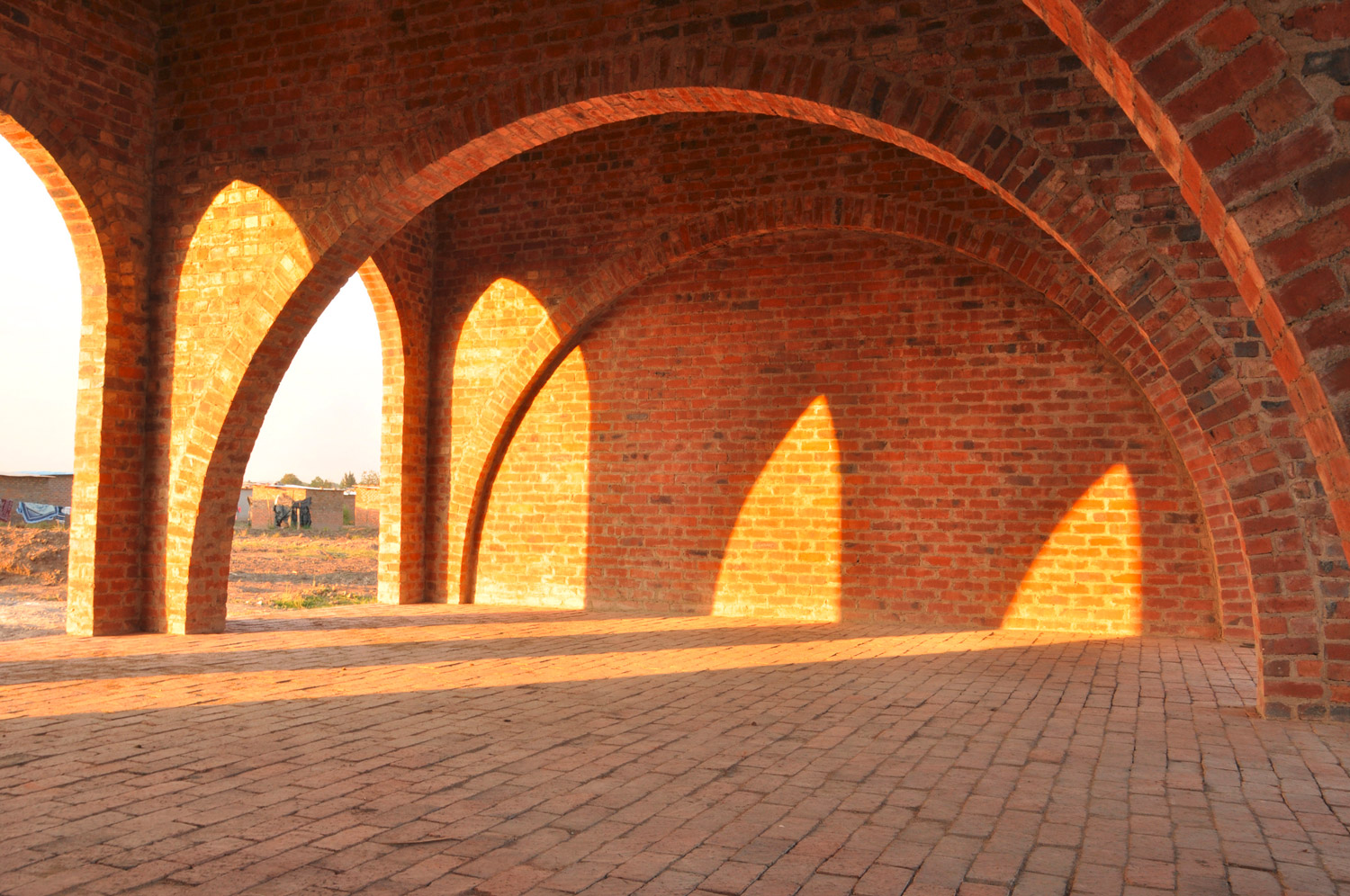 Lehmziegel sind das Hauptbaumaterial in dieser Region. Deshalb weiß jeder der Arbeiter mit Ziegeln zu bauen. Das Bausystem besteht aus zehn 35 Zentimeter starken Wandscheiben mit zwei Rundbögen. Große Bögen überspannen die Klassenzimmer, kleine Bögen überdachen einen außenliegenden Gang. Die Klassenräume sind von dem vor Sonne und Regen geschützten Bogengang durch eine Stahl-Glasfassade getrennt. Zur Außenseite schützt eine massive Mauerwerkswand. Die Öffnungen in Fassade und Außenwand sorgen für natürliche Querlüftung. Ein doppeltes Dach schafft ein angenehmes Klima in den Klassenräumen. Die Ebene zwischen Decke und Dach ermöglicht eine natürliche Belüftung. Die durch das Dach eintretende Sonnenstrahlung wird durch die durchströmende Luft direkt nach außen geführt. Notwendige Details für das natürliche Lüftungssystem sind in die Architektur eingearbeitet. Ein weiterer Hauptaspekt während des Baus ist die Unterstützung lokaler Geschäfte und Arbeiter. Alle Arbeiter kommen aus der unmittelbaren Umgebung der Schule.