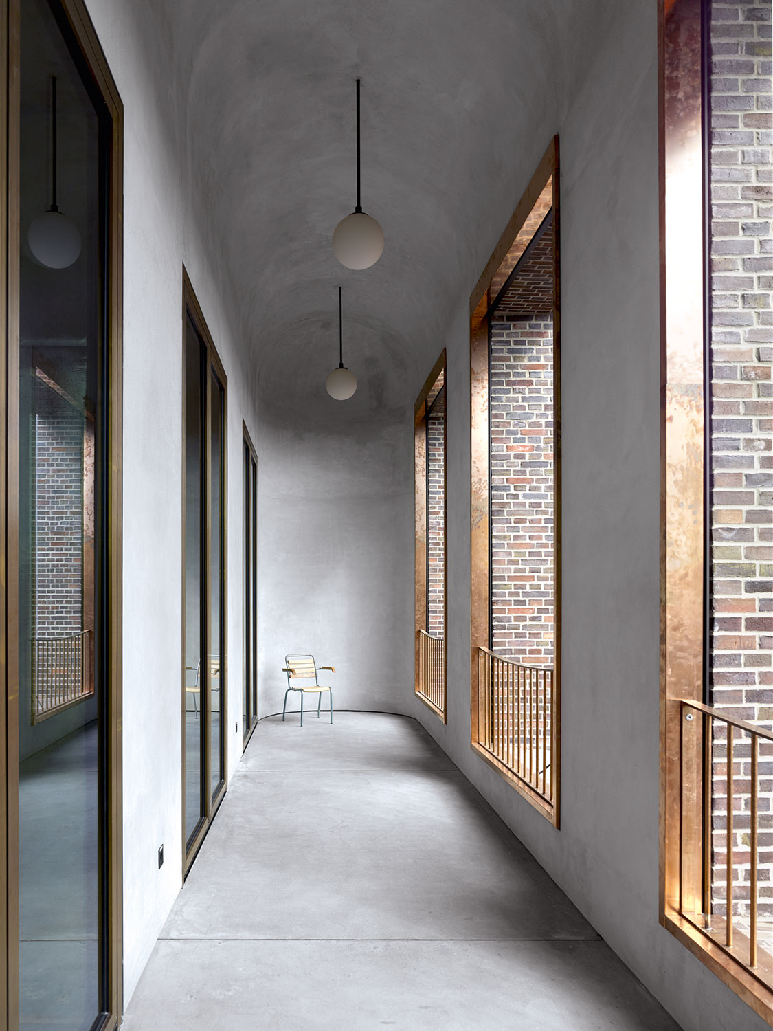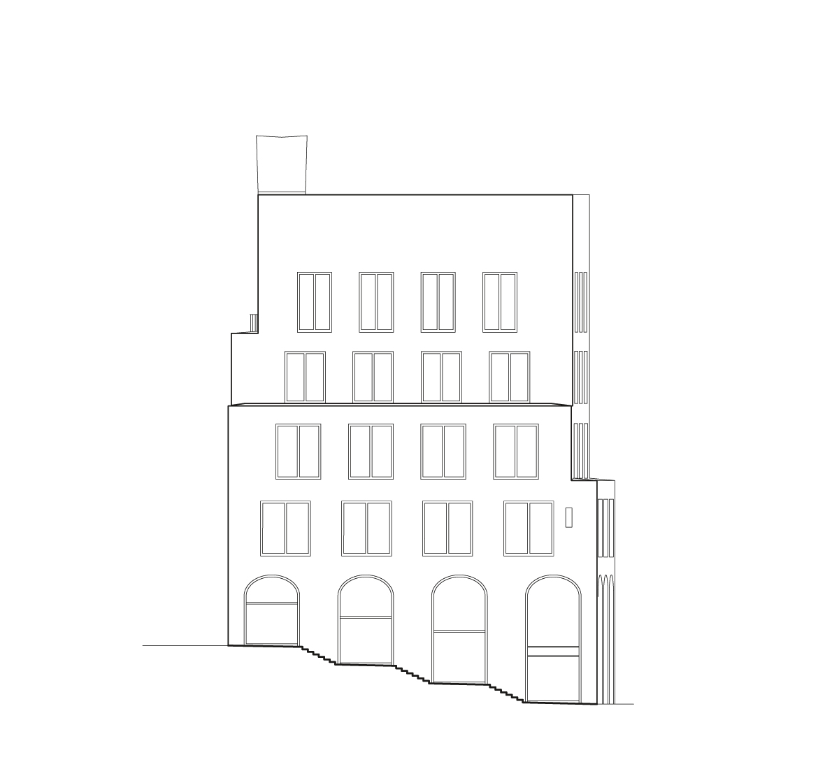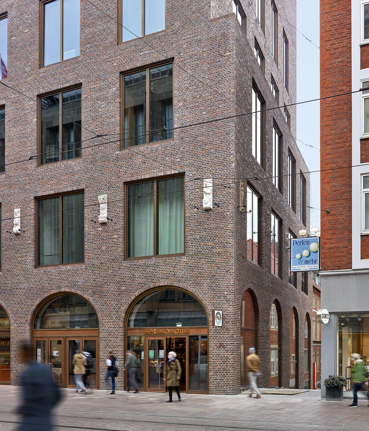Bogenförmige Schaufenster leiten die Passanten von der Einkaufsstraße über die Treppe in der Gasse zum neuen Quartiersplatz. Das hofseitige Portal der Stadtwaage wurde denkmalgerecht restauriert und zum neuen Platz geöffnet. Ähnlich wie die Stadtwaage als historisches Baudenkmal Weser-Renaissance und Wiederaufbau zu einem homogenen Ganzen vereint, so transformiert auch der Neubau ortstypische Motive und bauzeitliche Bezüge zu einem zeitgenössischen Bremer Stadthaus.