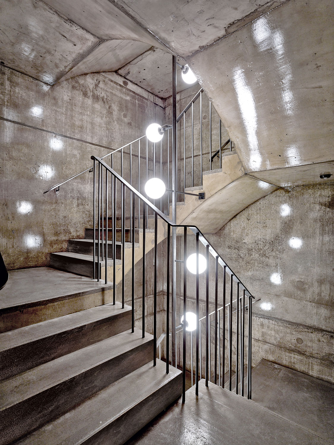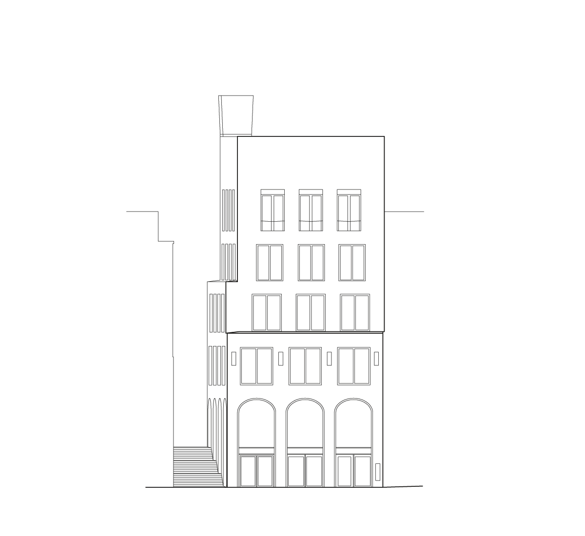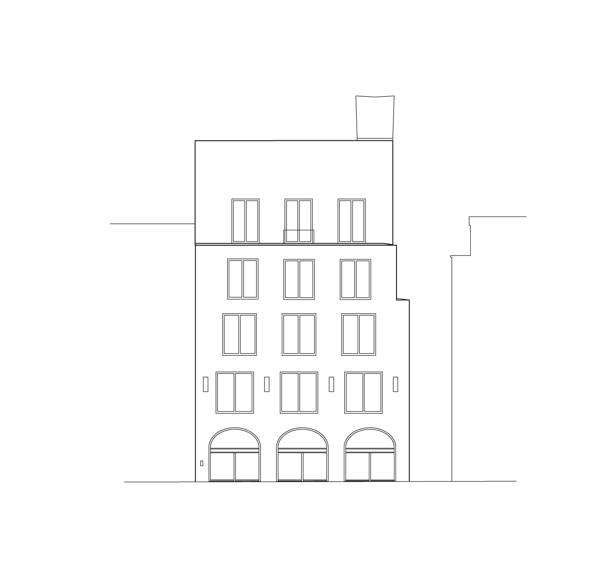 Bogenförmige Schaufenster leiten die Passanten von der Einkaufsstraße über die Treppe in der Gasse zum neuen Quartiersplatz. Das hofseitige Portal der Stadtwaage wurde denkmalgerecht restauriert und zum neuen Platz geöffnet. Ähnlich wie die Stadtwaage als historisches Baudenkmal Weser-Renaissance und Wiederaufbau zu einem homogenen Ganzen vereint, so transformiert auch der Neubau ortstypische Motive und bauzeitliche Bezüge zu einem zeitgenössischen Bremer Stadthaus.