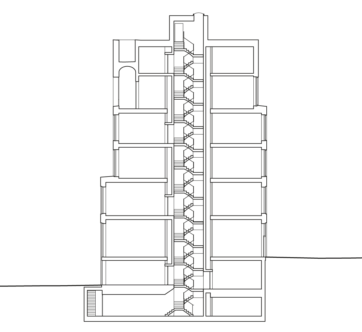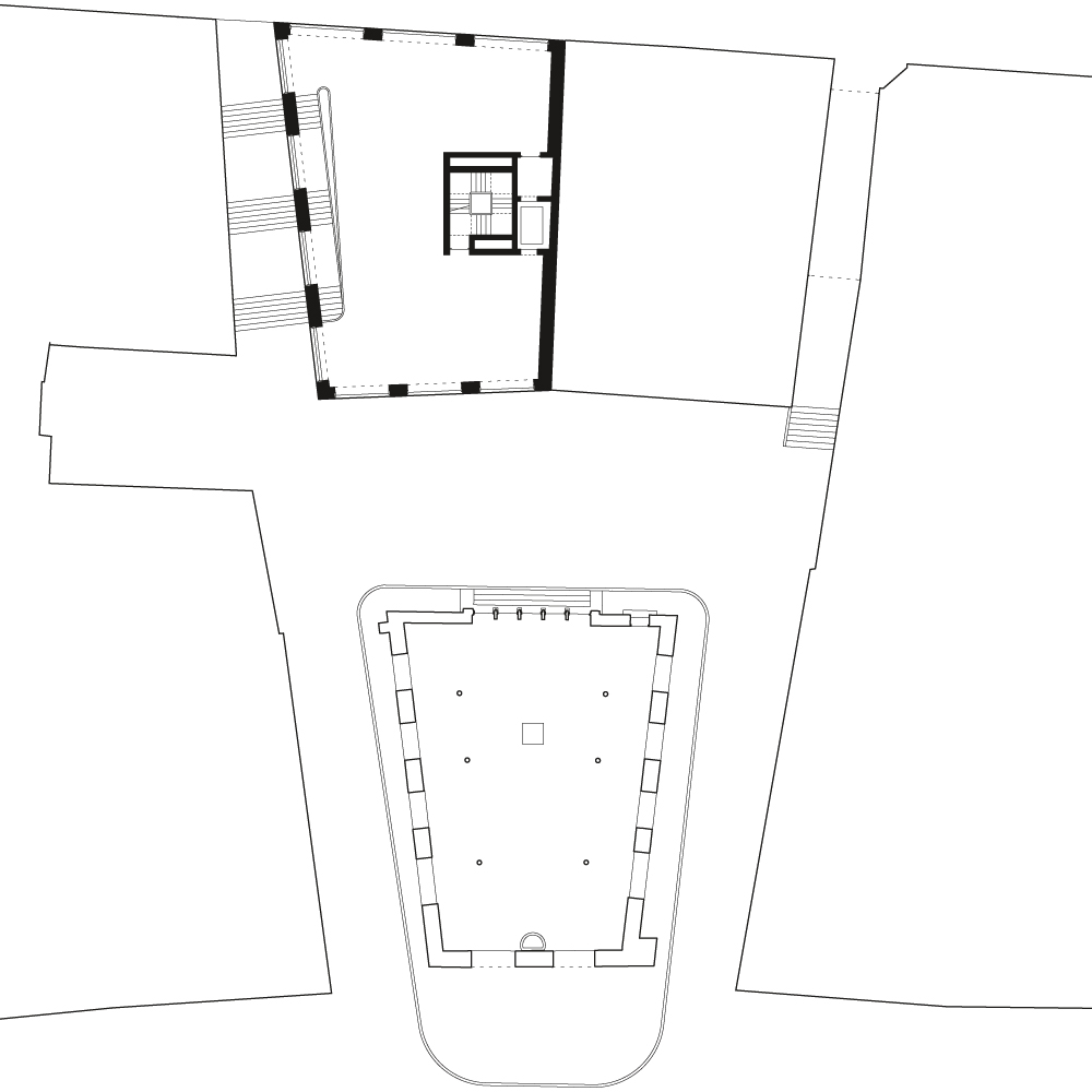 Das dreidimensionale Betonscheibentragwerk prägt maßgeblich die Gestalt des Hauses. Es ermöglicht Stützenfreiheit und somit langfristige Flexibilität. Erschließung und Konstruktion sind zugunsten der offenen und dreiseitig belichteten Räume auf das Wesentliche reduziert. Die Materialität und Farbigkeit der Altstadt findet sich in der Vormauerung mit erdfarbenen Wasserstrichziegeln und sandfarbenen Fugen wieder. Die Sandsteinfiguren des Vorgängerbaus sind in die Fassade des Neubaus integriert.