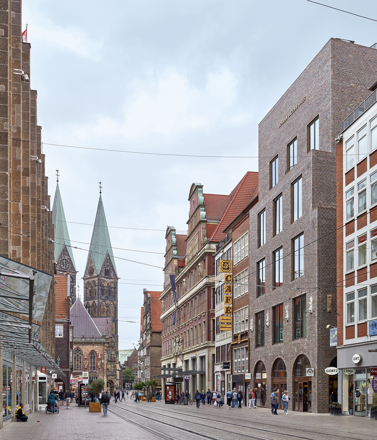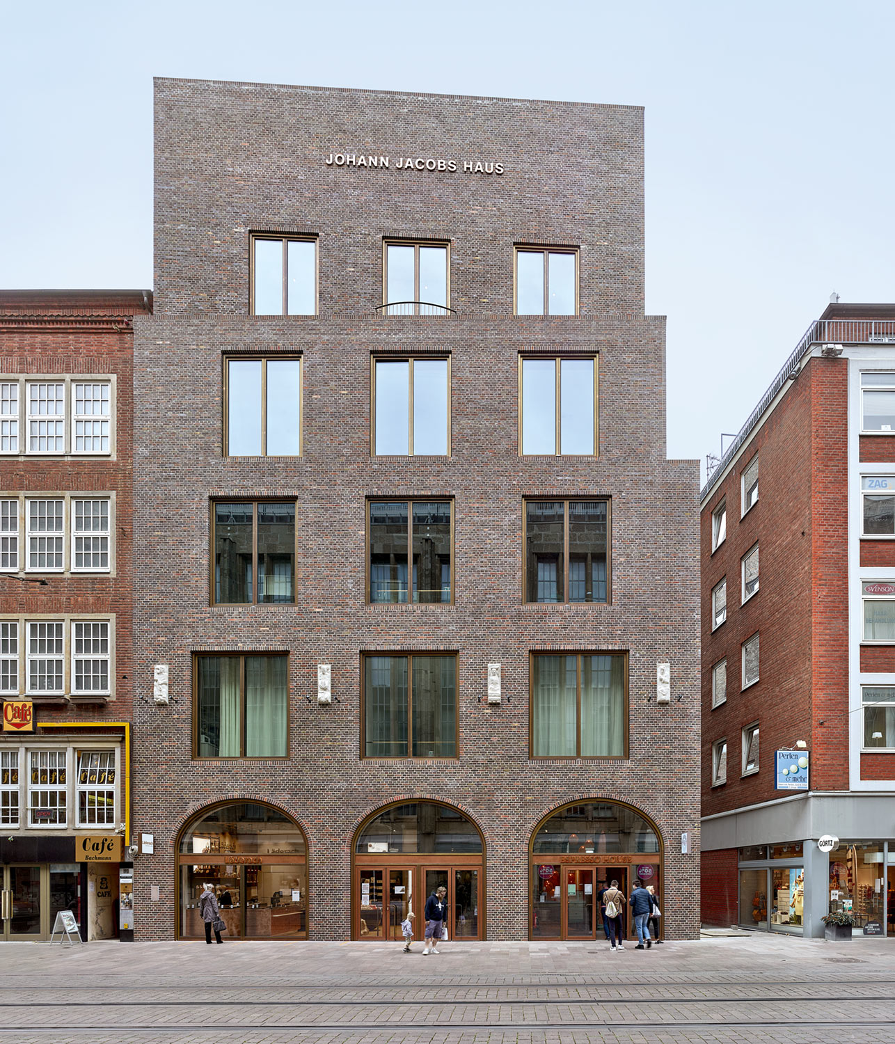 Als erster Baustein einer innerstädtischen Quartiersentwicklung ersetzt das neue Johann Jacobs Haus das alte Stammhaus des Kaffeeunternehmens Jacobs aus der Zeit des Wiederaufbaus. Es zeigt sich als selbstverständlicher Baustein der Stadt. Das Besondere an seiner Lage im Stadtgrundriss ist seine Dreiseitigkeit. So staffelt sich der Baukörper zu drei Seiten und vermittelt präzise zwischen den Traufkanten der historischen Baudenkmäler. Plastizität und Dreiteilung der Fassade vereinzeln das Gebäude in der Reihe und stellen Bezüge zu hanseatischen Stufengiebeln her.