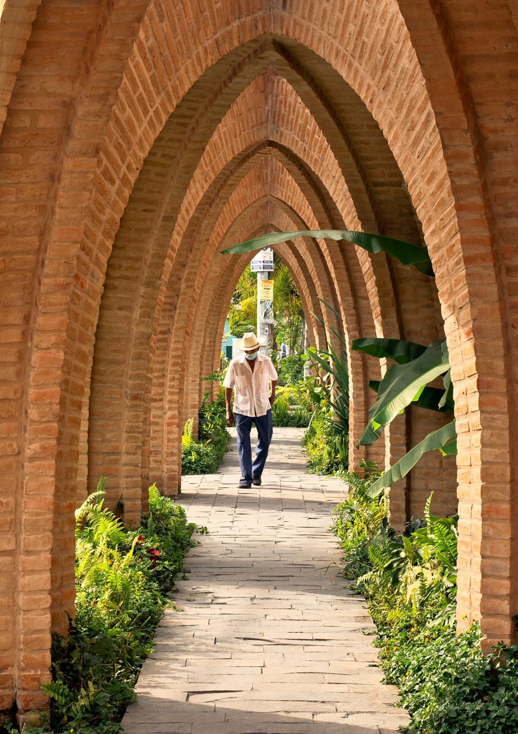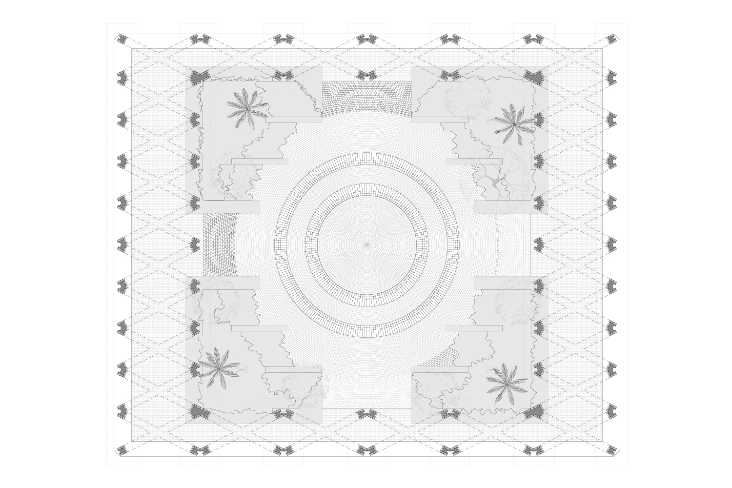 The ochre modular arcade systems not only reorganize the urban plaza and revitalize the historic character of the site through a sensitive reinterpretation of traditional arches, but also create shaded corridors that allow for the natural flows of people, birds, and natural elements; no one remains enclosed or trapped within the spaces. The built structures, along with the reinforced garden areas, promote dynamic and static spaces where humidity naturally increases and temperature decreases.