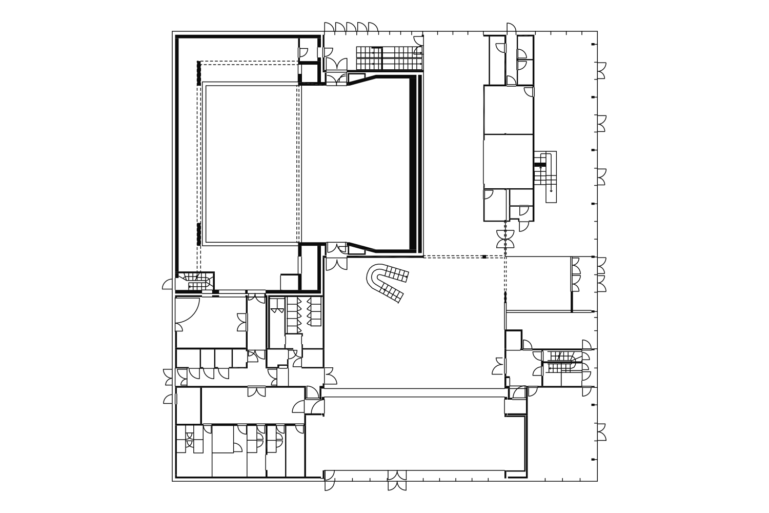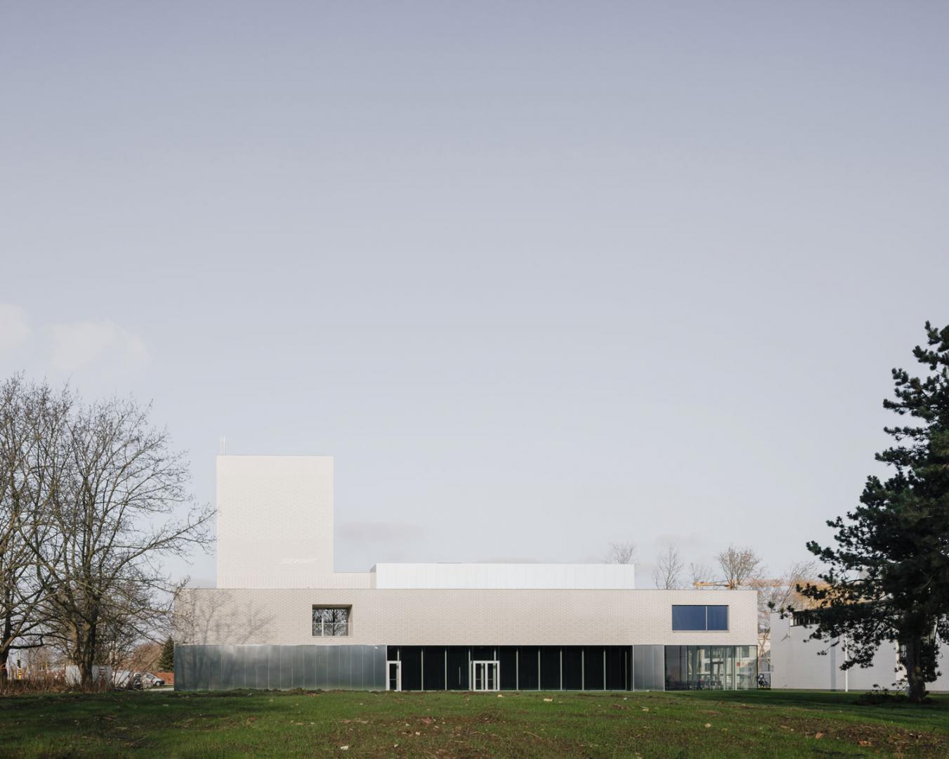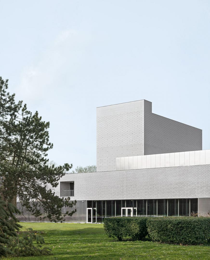 Aus städtebaulicher Sicht tritt das Leietheater einen Schritt zur Seite: Der Standort schafft Platz für einen großen Park, der sich bis zur Leie erstreckt, und legt das Theater auf wichtige Sichtachsen der Stadt. Ein Café an der Ecke aktiviert den öffentlichen Raum an einem Ort, an dem nach Vorstellungsende eine Leere in der städtischen Dynamik entstehen würde. Als abstrakte und zugleich vertraute Erscheinung leuchtet das Theater am Ufer der Leie, wo die Luministen einst in hellem Licht badende Szenen schufen.