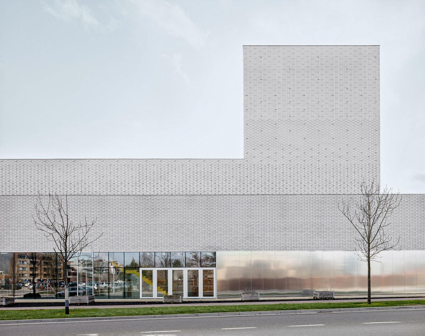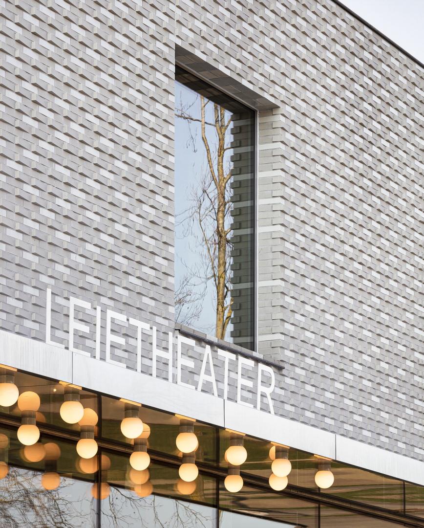 Das Leietheater hat eine einfache Silhouette, die in ein Backstein-Kleid gehüllt ist. Das Kleid besteht aus zwei Arten von Ziegeln: einem flachen, ungeschliffenen weißen Backstein und einem glasierten, glänzenden weißen Backstein. Die beiden Typen sind in sechs Mustern verarbeitet, die sich von flach bis dreidimensional entwickeln. Statt der Gebäudestruktur zu folgen, justieren die Muster das Bild, indem sie den gesamten Baukörper betonen.