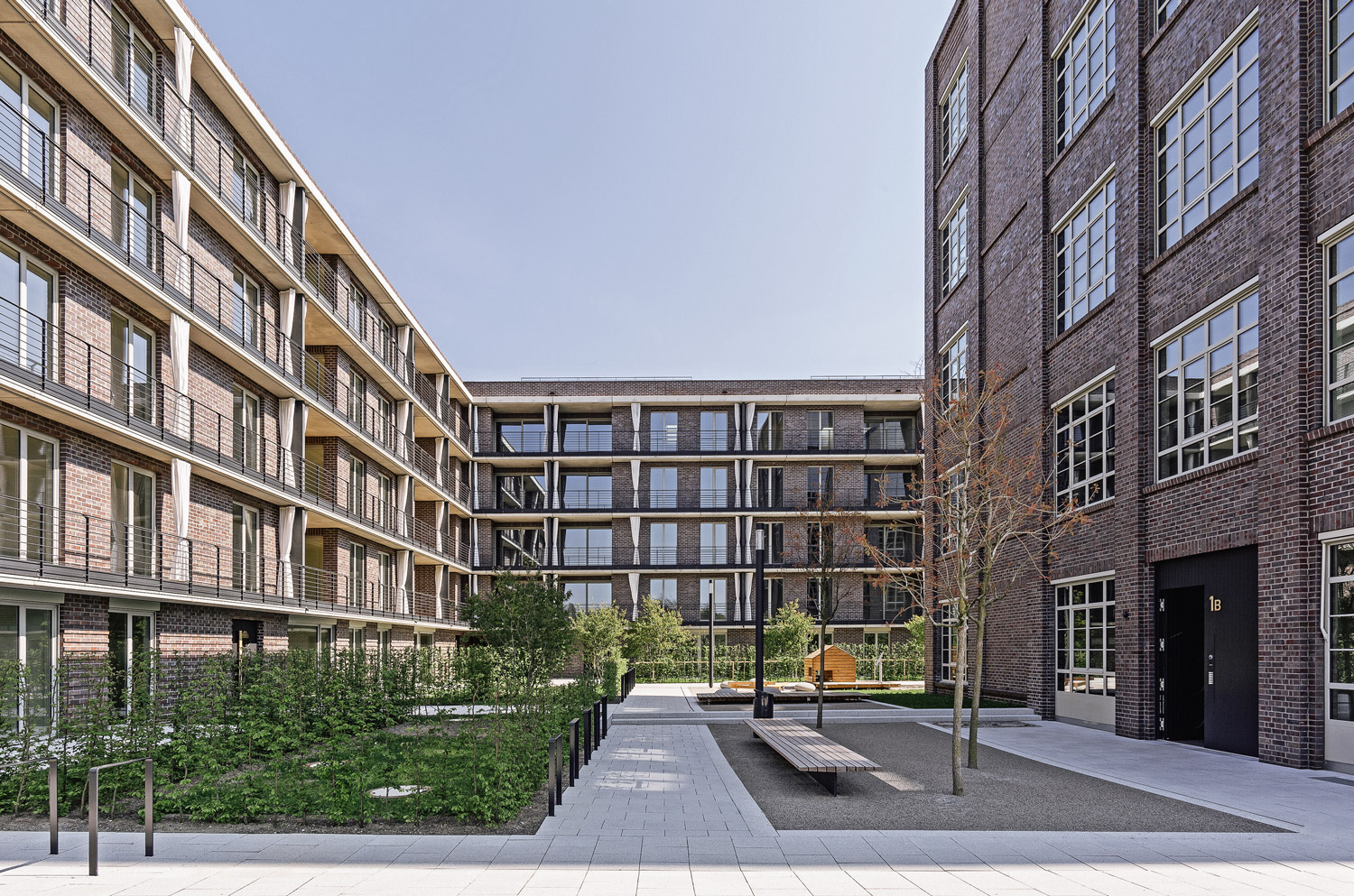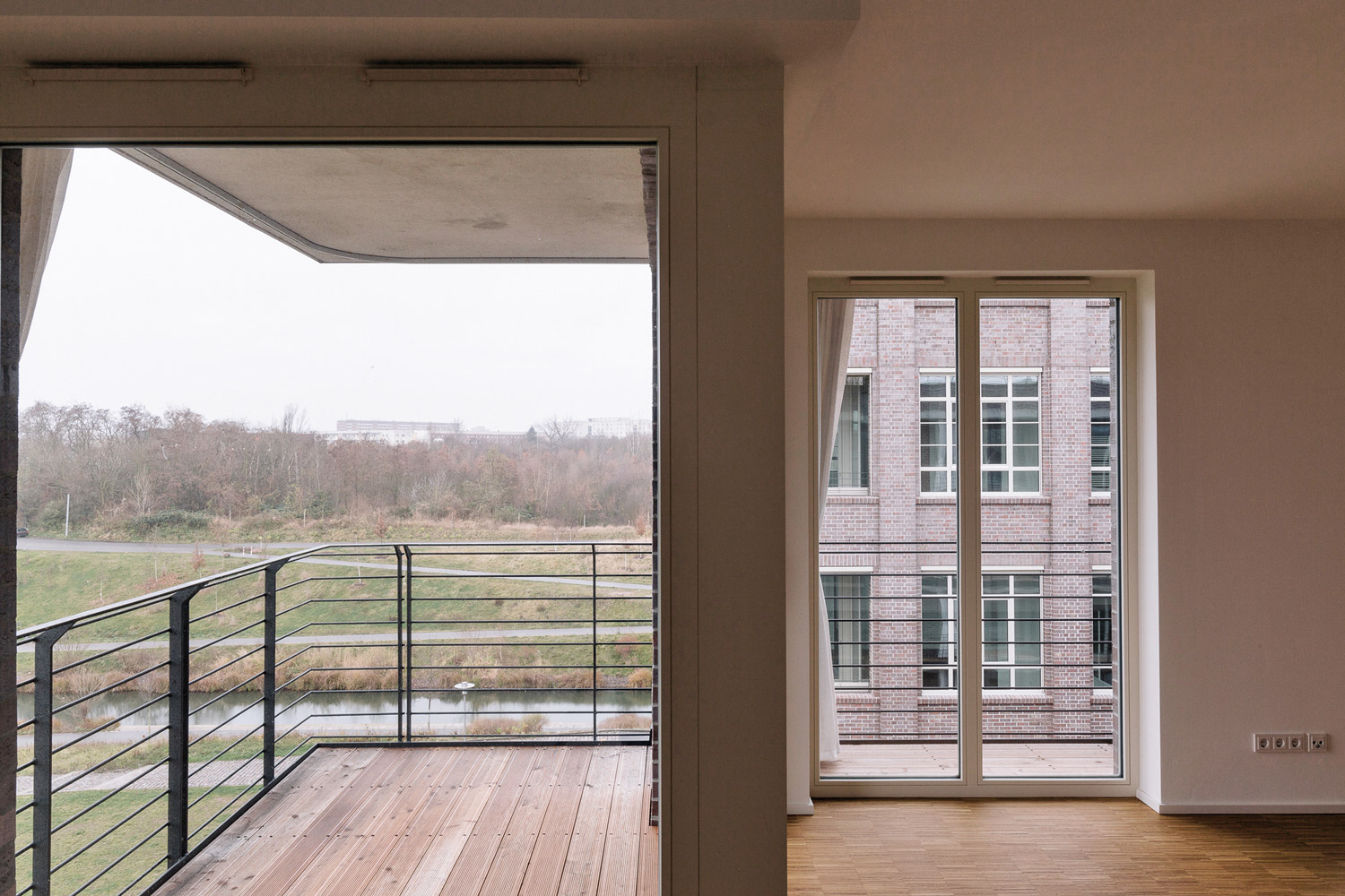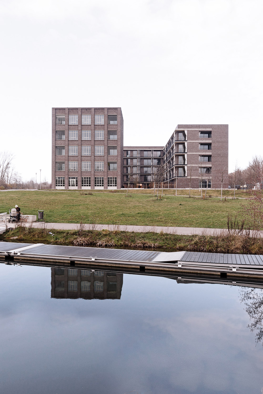 Im Süden öffnet sich das Ensemble hin zum Wasser und schafft gleichzeitig eine klare räumliche Definition des Innenhofs, der in die sich anschließende Promenade und Parkanlage übergeht. Es bildet so eine durchlässige, bauliche Grenze, die der Integration der Baukörper im neuen Quartier zuträglich ist und ein selbstbewusstes Zeichen für moderne Stadtentwicklung setzt. Eine Spielanlage für Kinder sowie Sitzmöglichkeiten schaffen die Grundlage für gemeinsame Freizeitaktivitäten und sind als Treffpunkt für die BewohnerInnen konzipiert. Das Innenraumkonzept des Winkelgebäudes besticht durch eine konsequente Ausrichtung zu den Gewässern und dem landschaftlichen Umfeld. Die Wohneinheiten des Turms zeichnen sich durch den Loftcharakter mit flexiblen Grundrissen aus, die den Ausbau als Atelier und individuelles Wohnen und Arbeiten zugleich ermöglichen. Die Wohnfläche jedes Lofts wird durch den innenliegenden Erschließungskern in Form eines Lastenaufzugs gegliedert. Dieser Kern bietet eine Zonierung in Arbeits- und Wohnbereich. Sämtliche Wohnungen sind barrierefrei, die Wohnungen des Atelierhauses zudem rollstuhlgerecht.