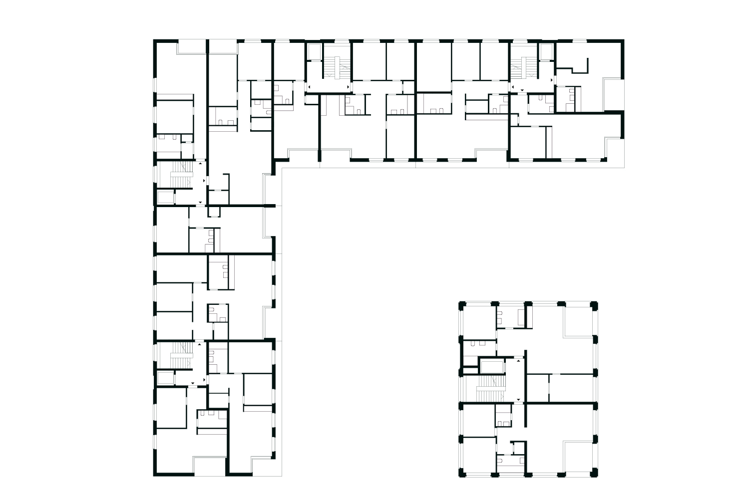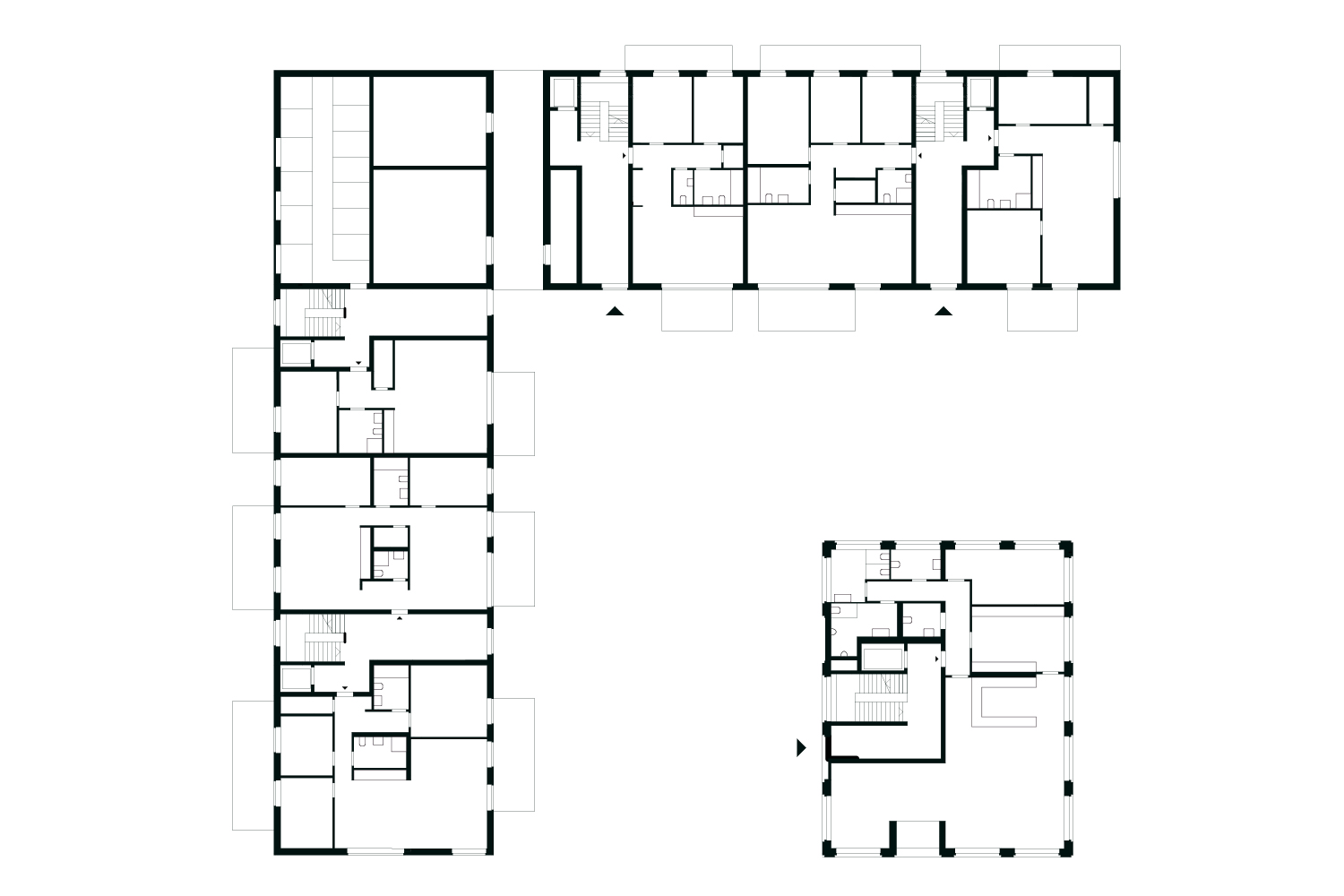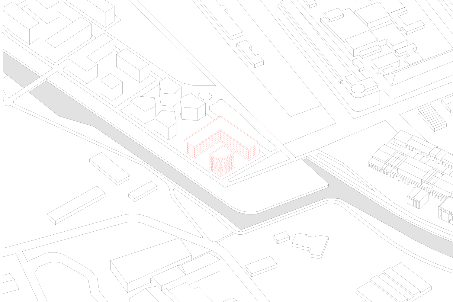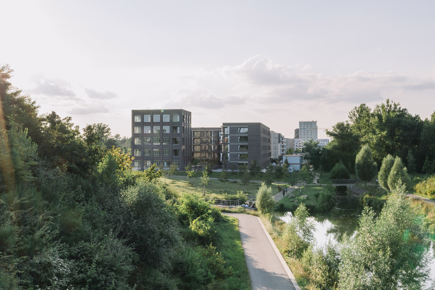 Im Süden öffnet sich das Ensemble hin zum Wasser und schafft gleichzeitig eine klare räumliche Definition des Innenhofs, der in die sich anschließende Promenade und Parkanlage übergeht. Es bildet so eine durchlässige, bauliche Grenze, die der Integration der Baukörper im neuen Quartier zuträglich ist und ein selbstbewusstes Zeichen für moderne Stadtentwicklung setzt. Eine Spielanlage für Kinder sowie Sitzmöglichkeiten schaffen die Grundlage für gemeinsame Freizeitaktivitäten und sind als Treffpunkt für die BewohnerInnen konzipiert. Das Innenraumkonzept des Winkelgebäudes besticht durch eine konsequente Ausrichtung zu den Gewässern und dem landschaftlichen Umfeld. Die Wohneinheiten des Turms zeichnen sich durch den Loftcharakter mit flexiblen Grundrissen aus, die den Ausbau als Atelier und individuelles Wohnen und Arbeiten zugleich ermöglichen. Die Wohnfläche jedes Lofts wird durch den innenliegenden Erschließungskern in Form eines Lastenaufzugs gegliedert. Dieser Kern bietet eine Zonierung in Arbeits- und Wohnbereich. Sämtliche Wohnungen sind barrierefrei, die Wohnungen des Atelierhauses zudem rollstuhlgerecht.