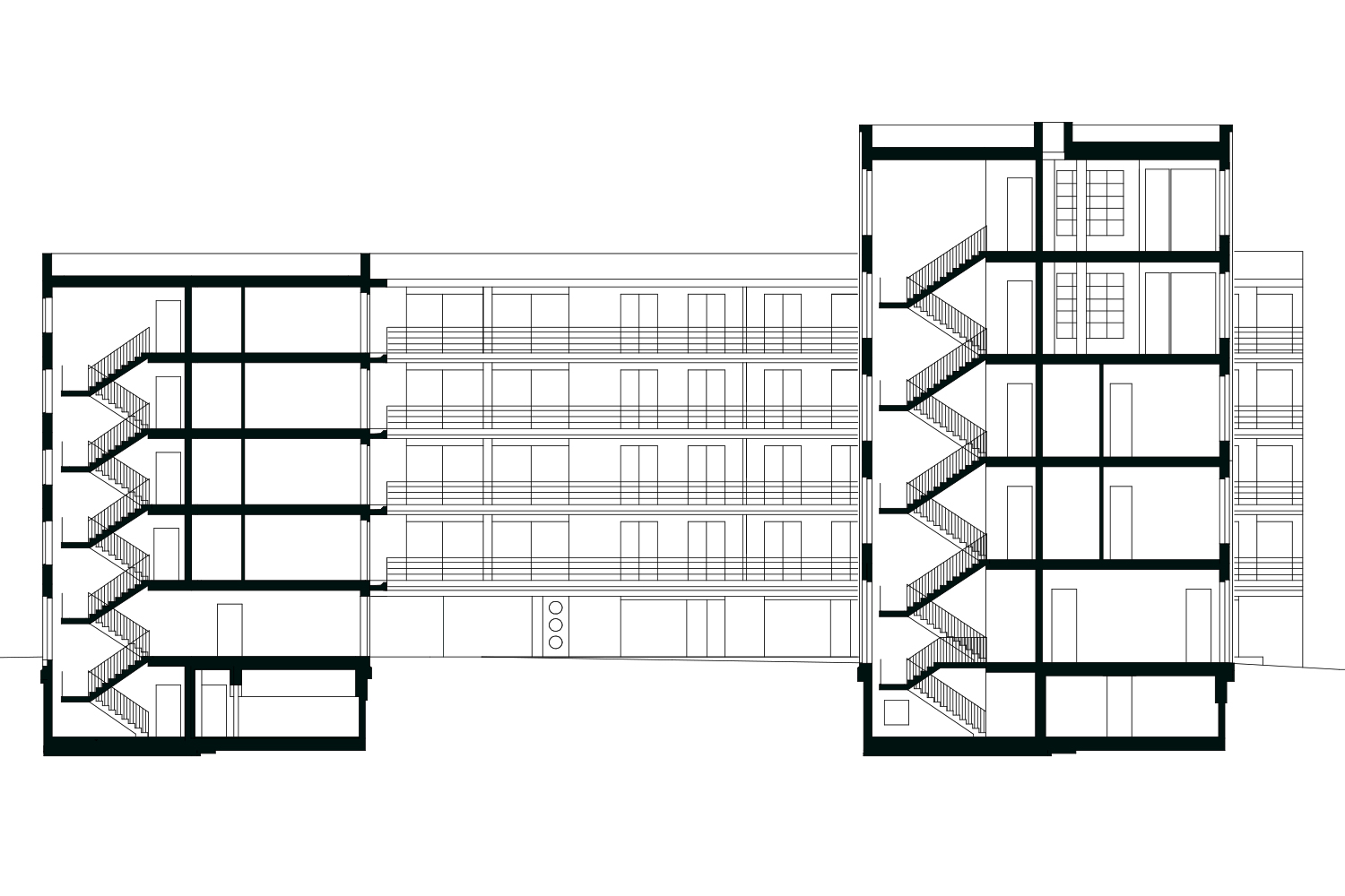 Diese herausgehobene Position setzt sich in der architektonischen Gestaltung konsequent fort. Der Turm zeigt klare Kante: alle Öffnungen – Fenster ebenso wie Loggien – sind in der gleichförmigen Rasterung integriert und werden von der präzisen, geradlinigen Kubatur gerahmt. Dagegen tritt die hofseitige Fassade des Winkelbaus hinter der Gebäudekante zurück.