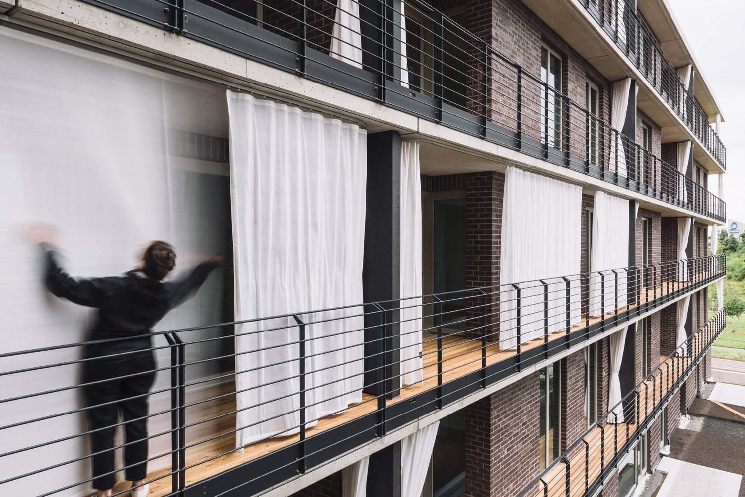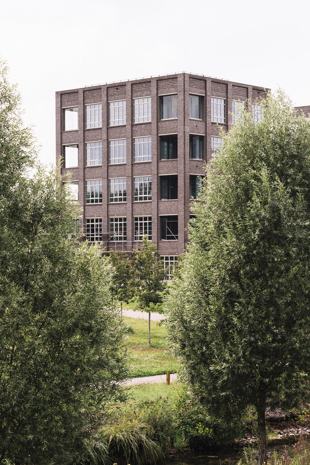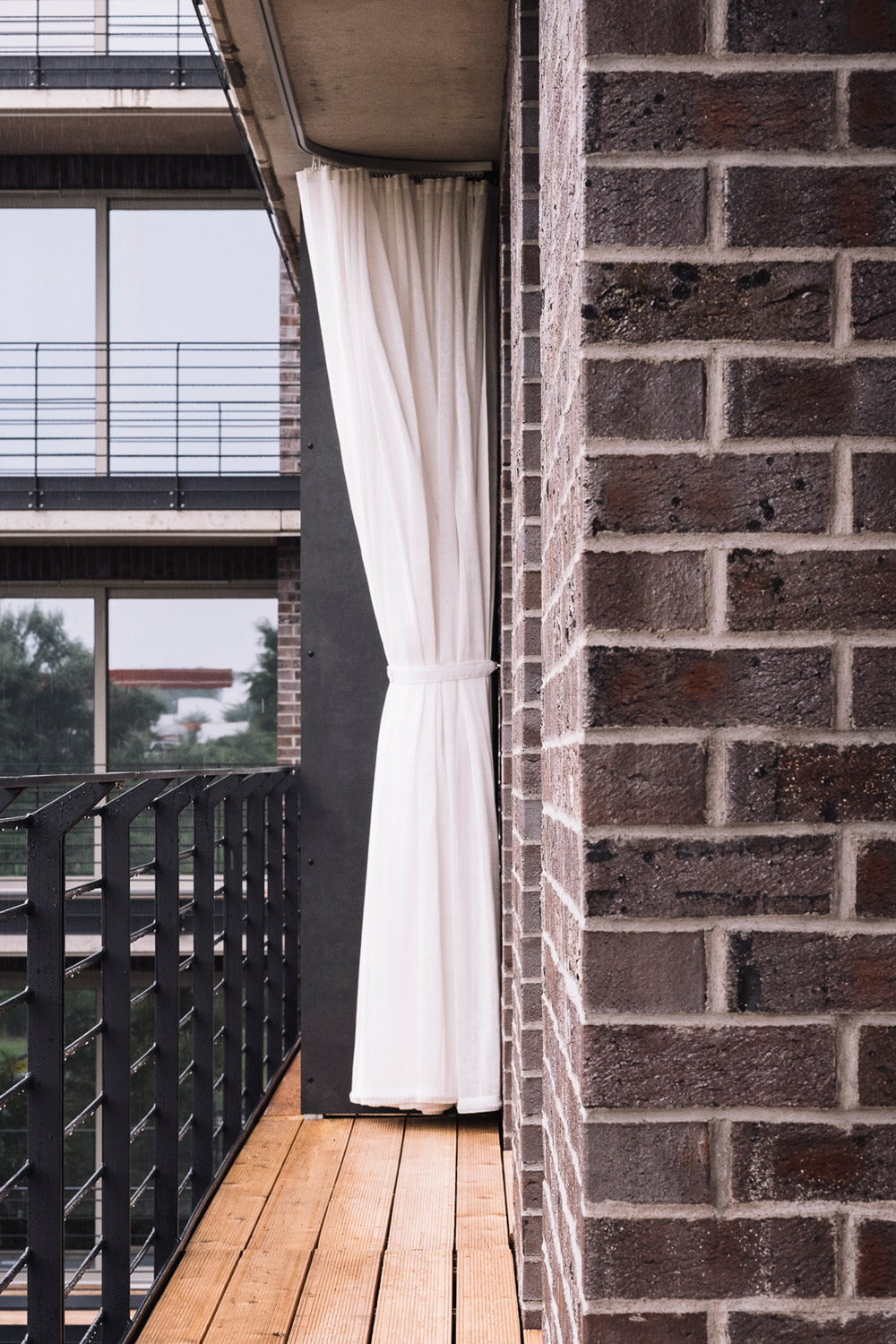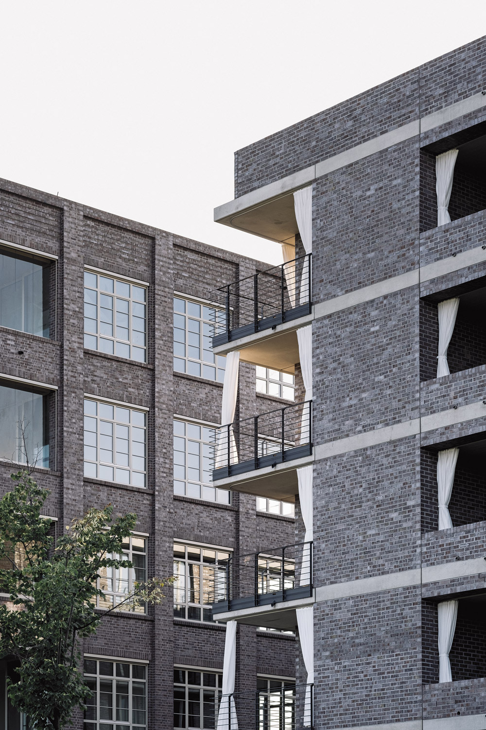Die rotbraune Klinkerfassade greift die Materialität der gründerzeitlichen Fabrikbauten in der Umgebung auf. Im Besonderen zeigt sich die industriell geprägte Formensprache in Referenz zur Industriearchitektur Fritz Högers – führender Vertreter des norddeutschen Backsteinimpressionismus und Architekt des Flaggschiffs der Leipziger Konsumzentrale – durch ausgewählte maritim anmutenden Details, wie filigrane Brüstungsgeländer, Bullaugenfenster und außenliegende, geschosshohe Vorhänge. Dieser schiffssegelartige Sicht- und Sonnenschutz kann individuell angepasst werden und wird so zum interaktiven Element der Fassade.