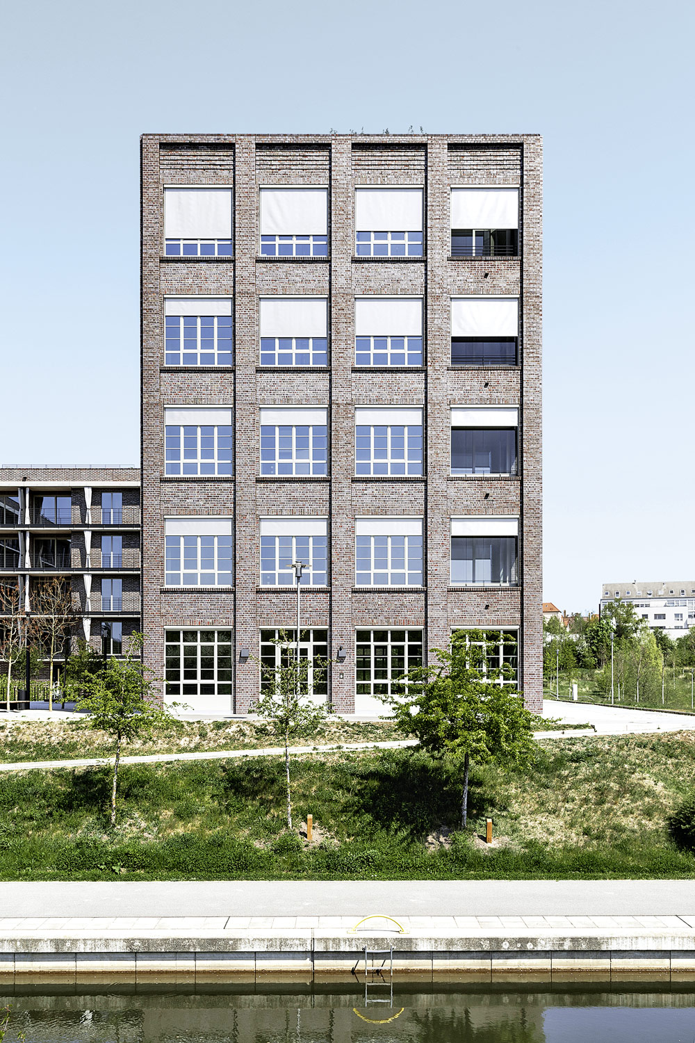 Nur 4 km westlich des Stadtzentrums, zwischen eindrucksvoller Industriearchitektur und direkt angrenzend an den Leipziger Stadtteil Plagwitz, entstand ein vielfältiges Stadtquartier am Lindenauer Hafen. Städtebaulicher Auftakt des neuen Wohnviertels ist der Hafenkopf von W&V Architekten. Dieser gliedert sich in ein 5-geschossiges Winkelgebäude und einen überhöhten 5-geschossigen Solitär mit insgesamt 56 Wohnungen. Das Ensemble besticht nicht nur durch die exponierte Lage am Wasser: Wohltuend bricht der Turm die gleichförmige Höhenlinie des Hafenquartiers und zieht die Verbindung zu den historischen Hafenspeichergebäuden im Nordosten.