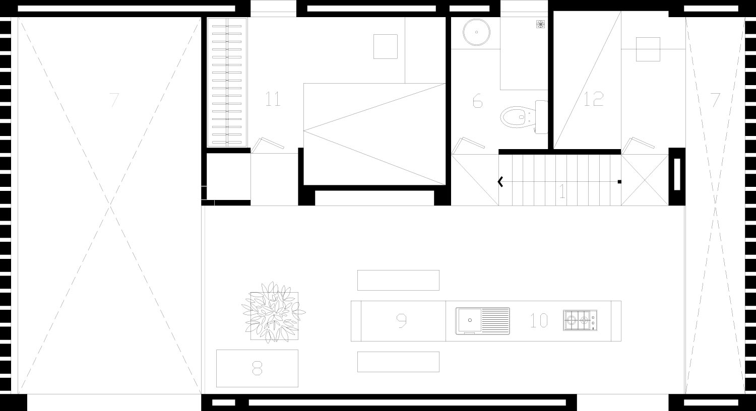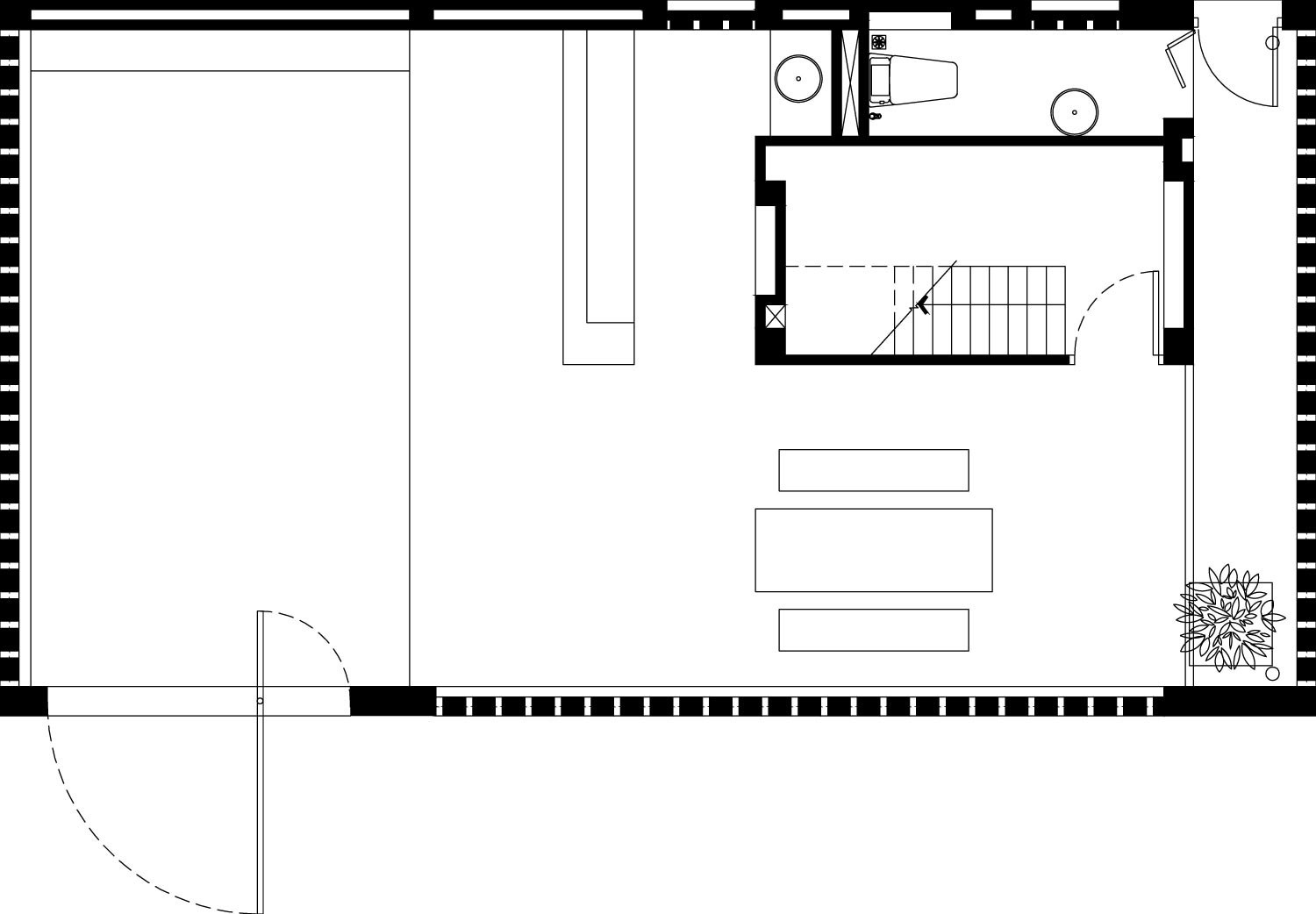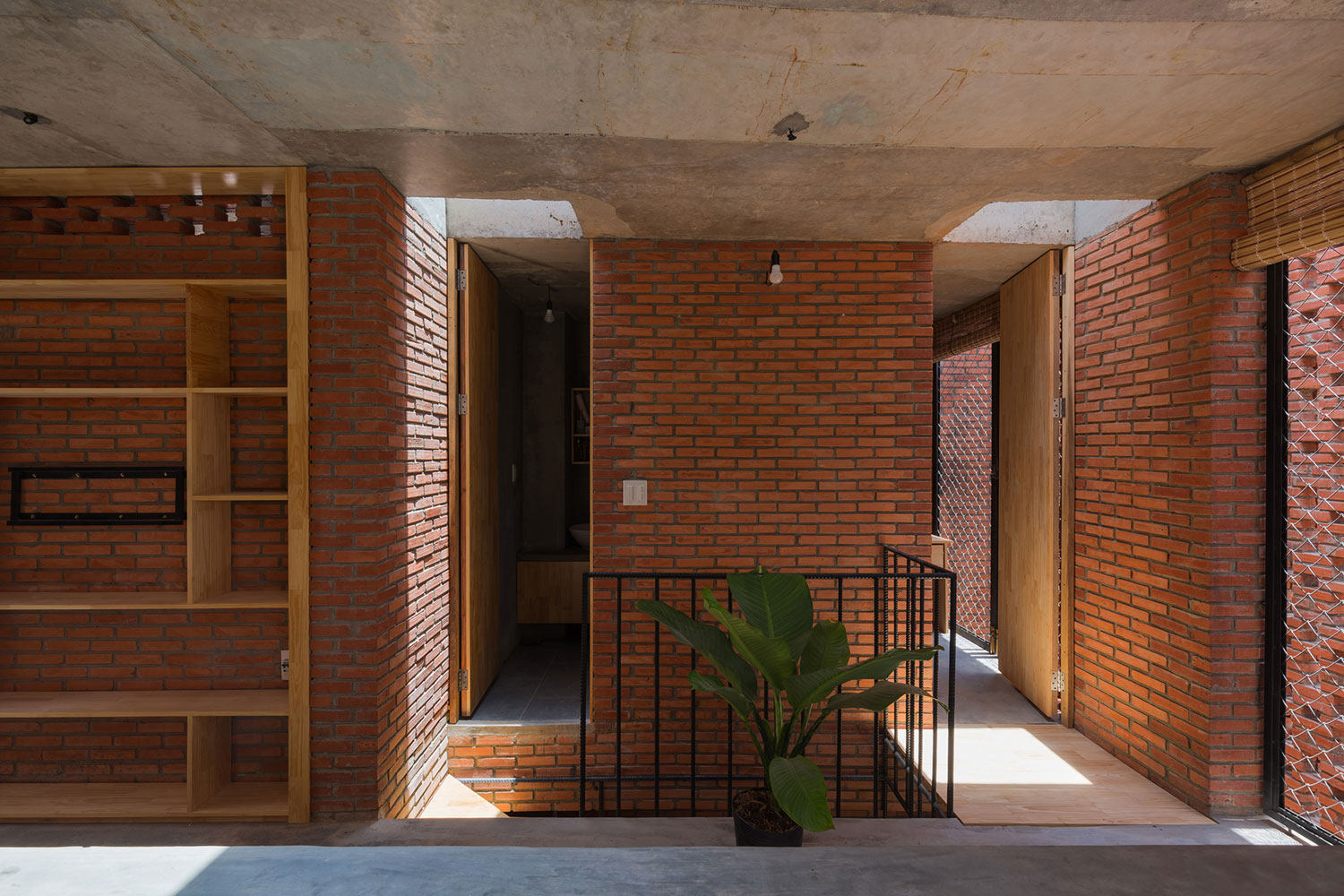 Angesichts der beschränkten Flächenmaße wollten die Architekten die privaten Bereiche auch gemeinschaftlich nutzbar gestalten, um mehr Platz zu schaffen. Die Einrichtung ist schlicht und einfach herzustellen. Um Kosten zu sparen, hat der Besitzer die Materialien eingekauft und die Möbel alle selbst hergestellt. Damit konnten die Kosten in diesem Bereich deutlich gesenkt werden. Vorgarten und Hinterhof dienen als Pufferräume, um die von außen kommende Hitze zu reduzieren. Der Vorgarten ist ein Bereich zum Entspannen, beispielsweise beim Morgenkaffee. Hier treffen Wind, Sonnenlicht und der Schatten der Ziegelmauer aufeinander. Das Erdgeschoss ist ein Multifunktionsbereich. Es wird sowohl für Treffen mit Freunden als auch künftig für ein kleines Café genutzt.