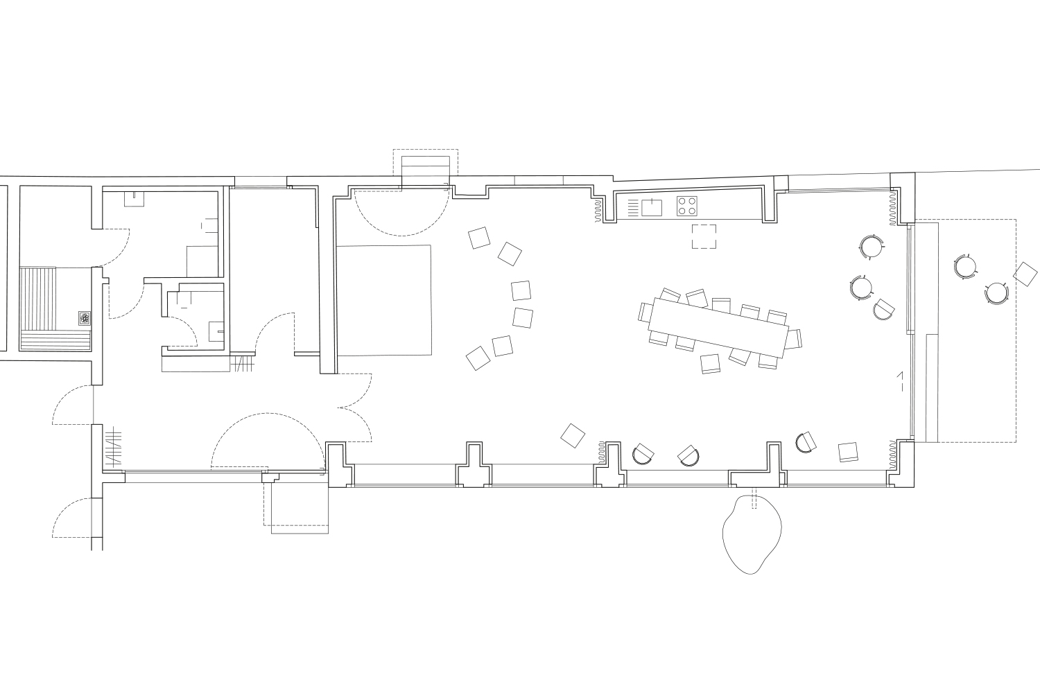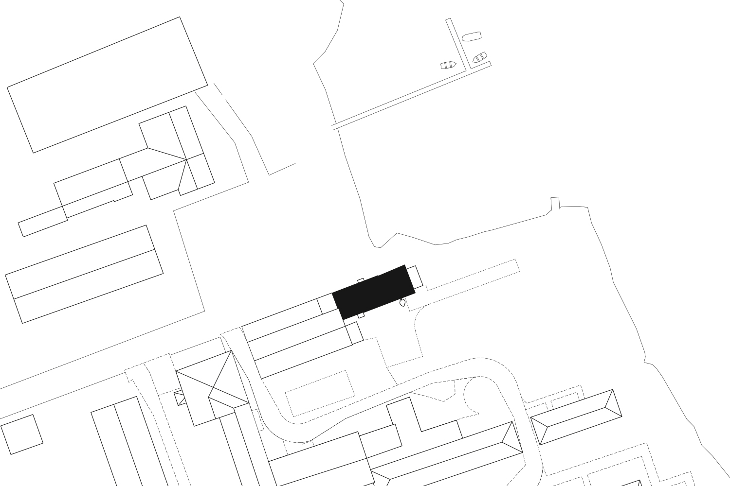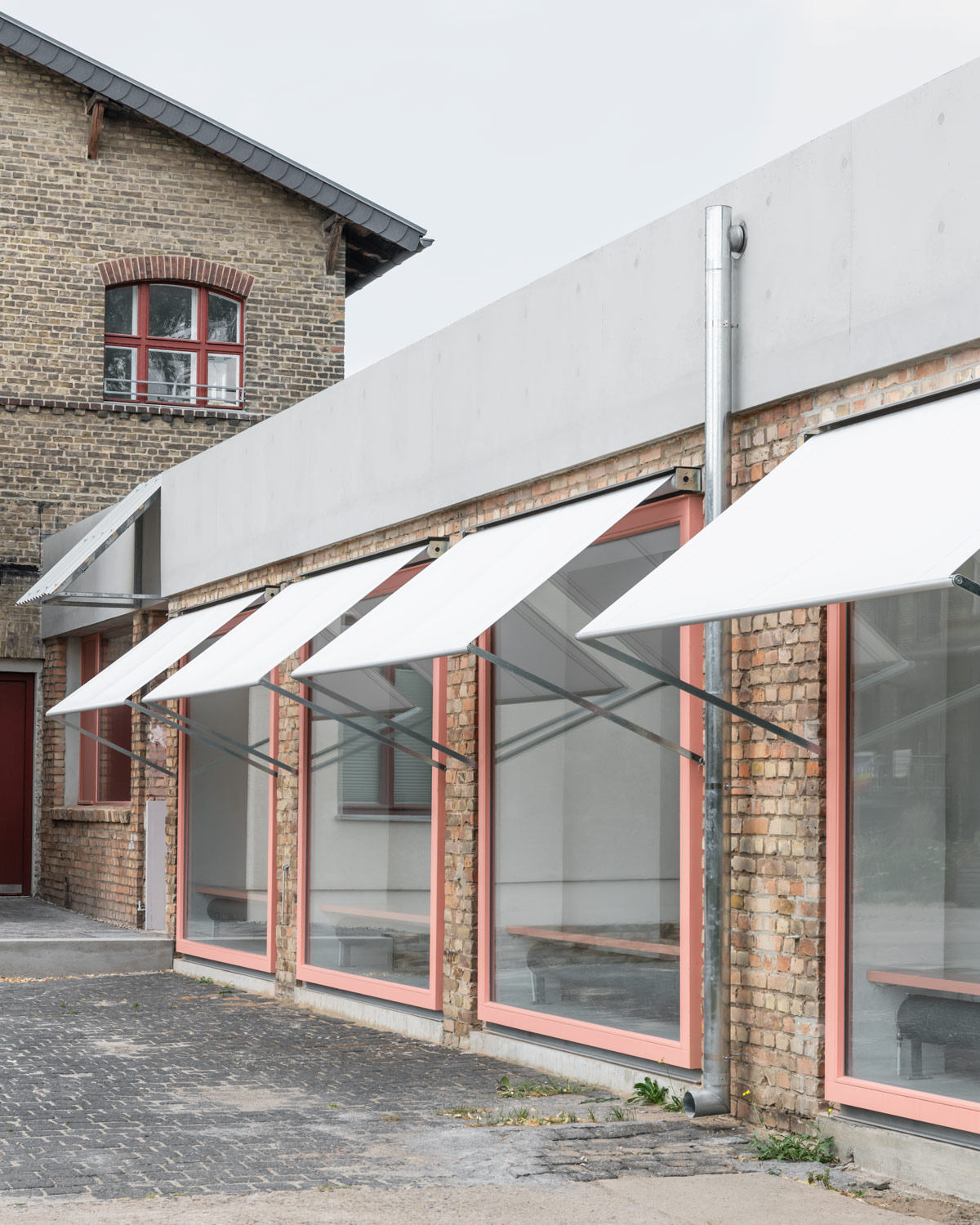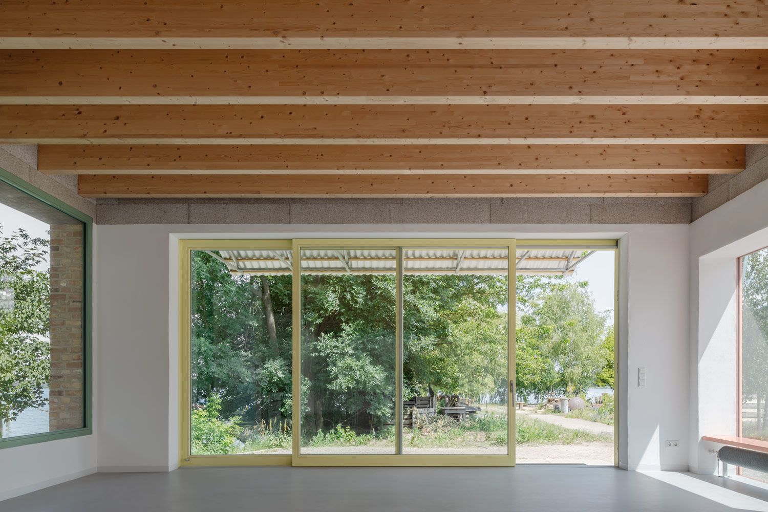 The existing building was left in its heterogeneity and only structurally repaired or supplemented with reused material. The new roof with its visible wooden beam ceiling and ring beam contrasts with the existing structure both internally and externally. The former garages remain identifiable through the wall panels and structure the large common room. This opens through a large sliding window to the east onto the terrace and the adjacent river.
