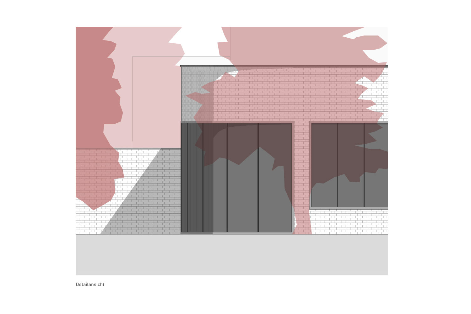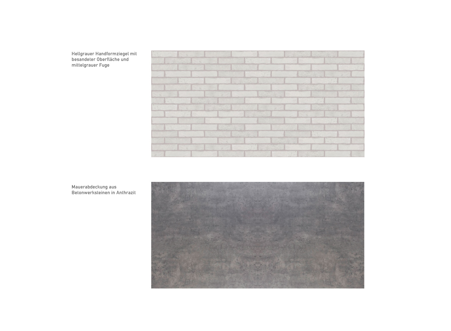 Die Fassade der zweischaligen Wand mit Kerndämmung ist mit einem cremebeige bis hellockerfarbigen Vormauerstein im Läuferverband gemauert. Die Einfriedungsmauer bindet sich durch den Verband in die Fassade ein und bringt das gesamte Grundstück in ein einheitliches Erscheinungsbild. Zusammen mit der sandfarbenen Fuge passt sich die Farbgebung der Umgebungsbebauung an. Die Attikaabdeckung, sowie die Fensterbänke innen und außen, sind aus marmoriertem, anthrazitgefärbten Betonwerkstein, der mit 52 Millimeter dieselbe Stärke wie die Vormauersteine aufweist. Die Laibungen der Fenster und die Stürze dienen als Anschlag und überdecken somit die Fensterrahmen. Im Innenraum sind die Möbel und das Parkett aus Buchenholz gefertigt, die Wände sind mit einem Glattputz versehen und mit signalweißer Farbe bestrichen. Die Decke ist abgehängt und mit einer umlaufenden Schattenfuge ausgeführt.