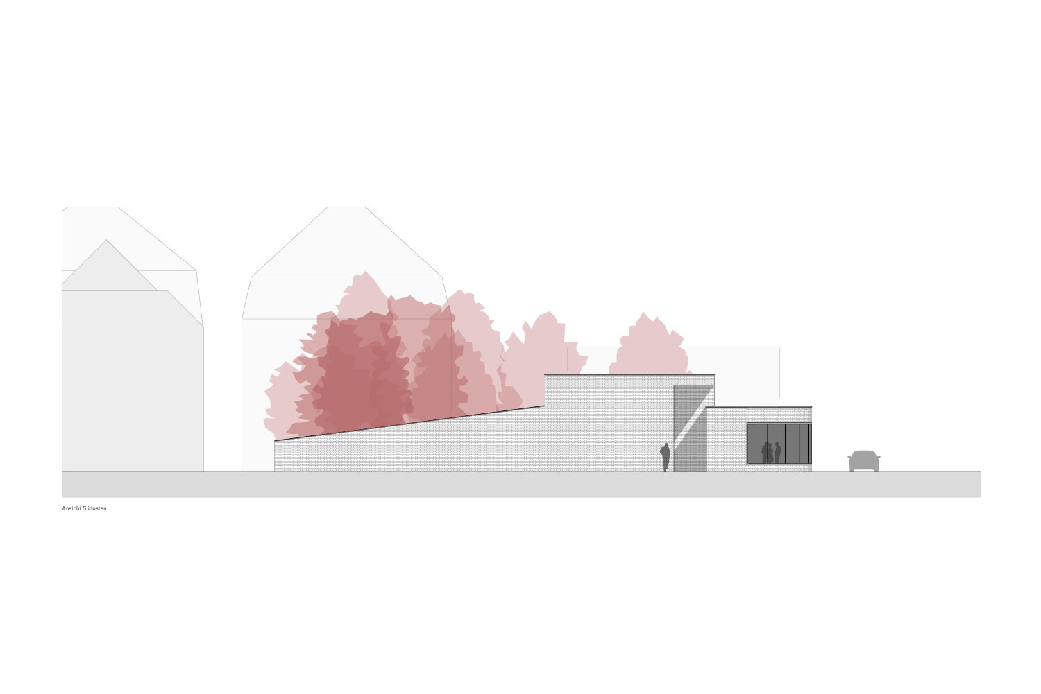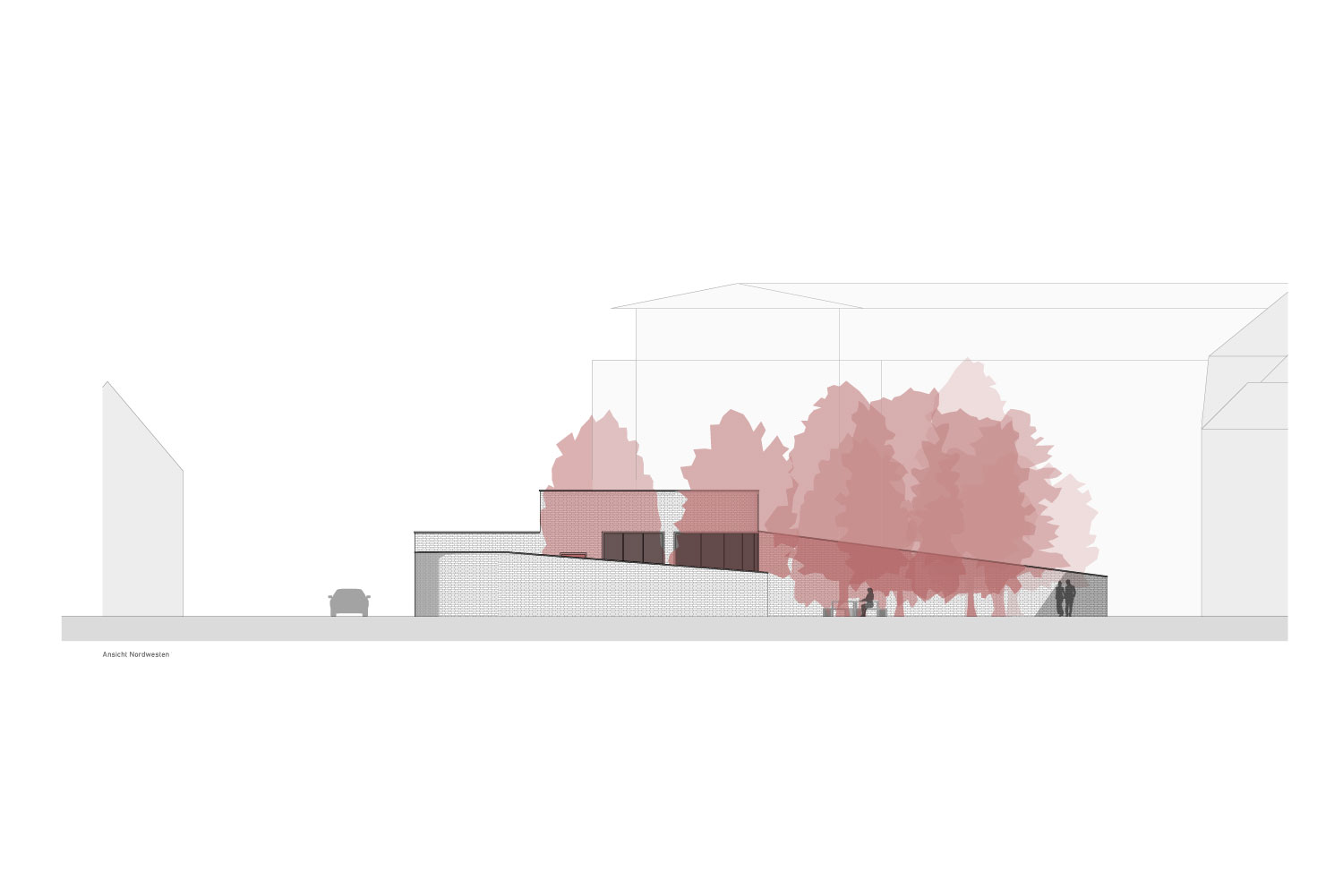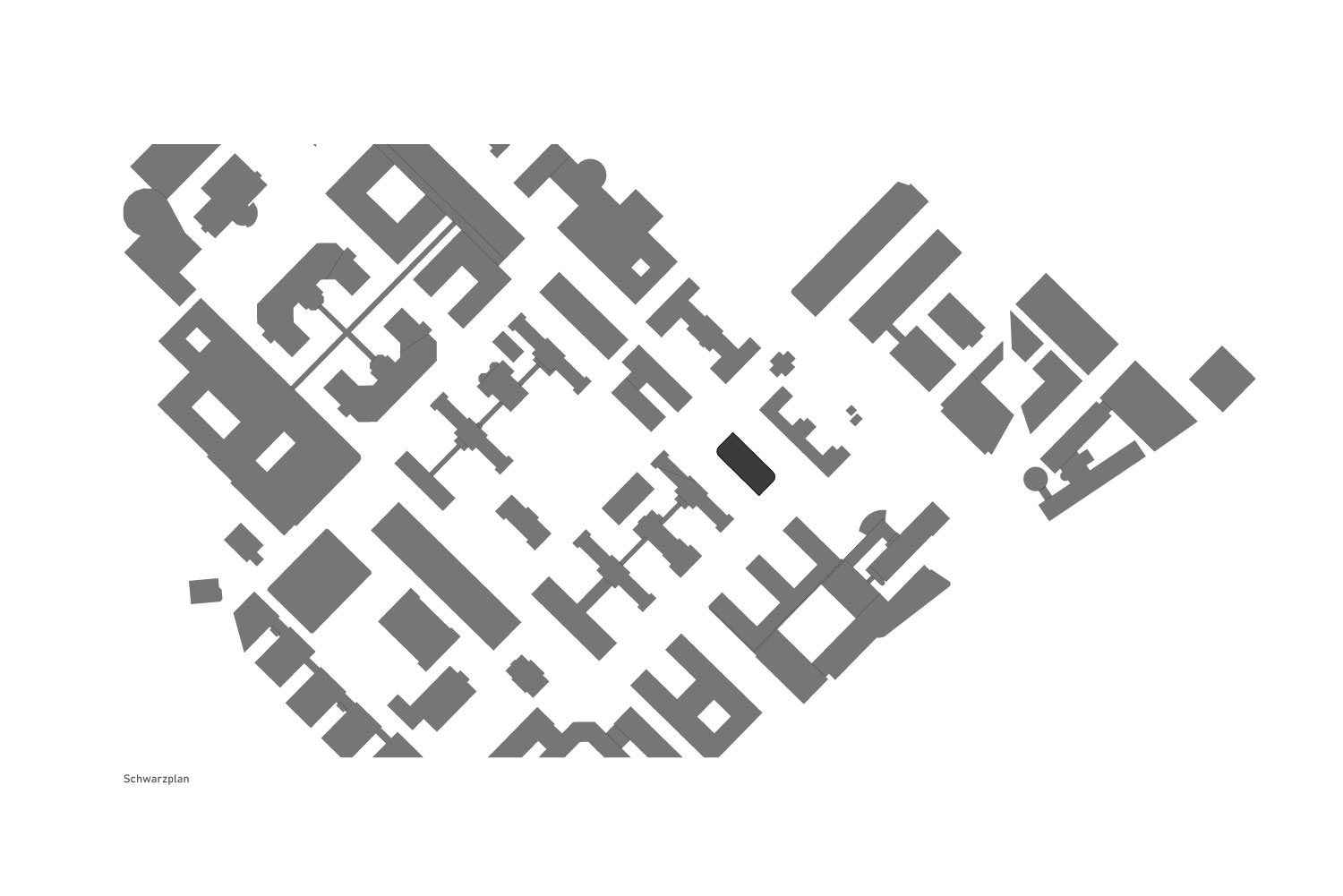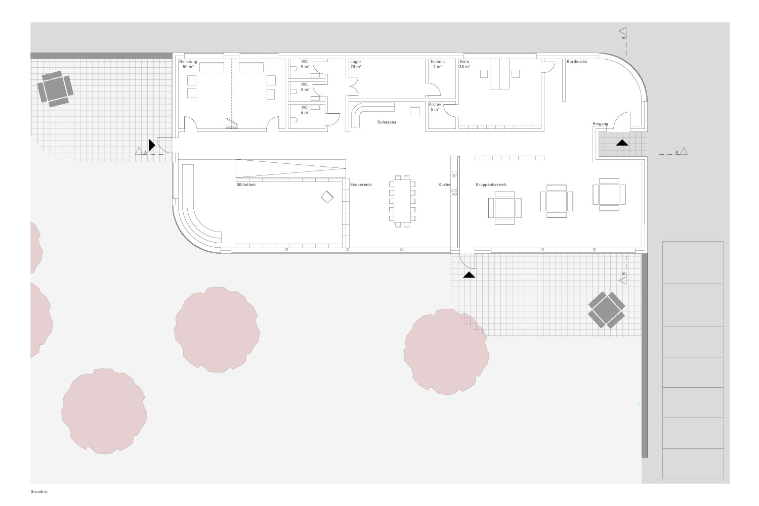 Das Grundstück befindet sich auf dem Gelände der Uniklinik. Der Baukörper sitzt an der Grundstücksecke und nimmt deren Rundung auf. An der Grundstücksgrenze verläuft eine Mauer, die auf den nahen Park verweist. Die beiden Rundungen an den Gebäudeecken bilden eine Achse zum Grünen. Der Grundriss ist in zwei Bereiche geteilt. Im geschlossenen befinden sich private Räume und im offenen die öffentlichen. Der Gemeinschaftsbereich hat große Raumhöhen und ist großzügig befenstert.