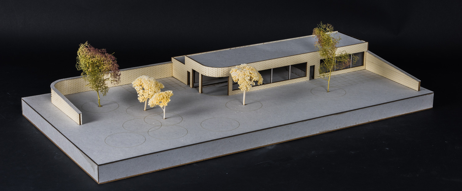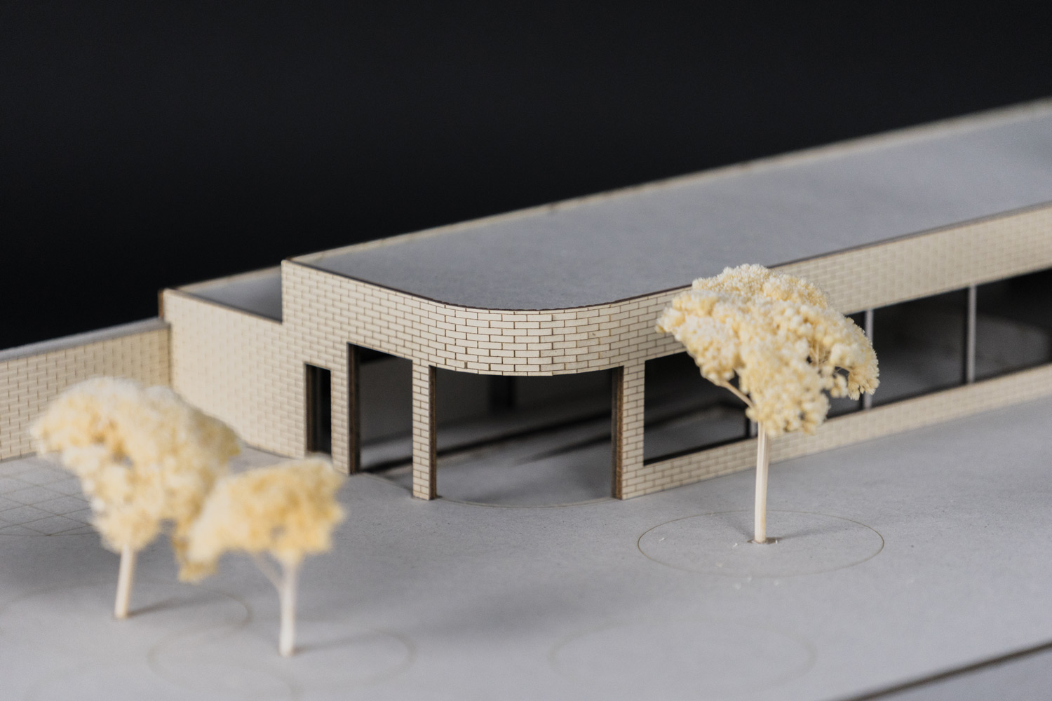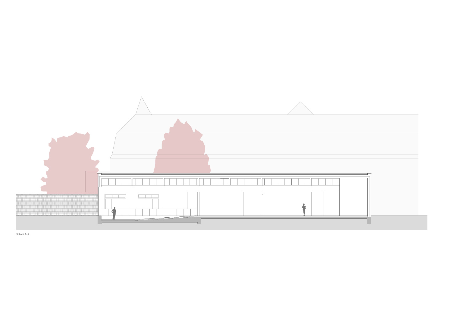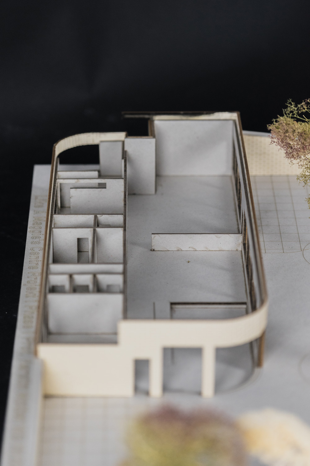 Das Grundstück befindet sich auf dem Gelände der Uniklinik. Der Baukörper sitzt an der Grundstücksecke und nimmt deren Rundung auf. An der Grundstücksgrenze verläuft eine Mauer, die auf den nahen Park verweist. Die beiden Rundungen an den Gebäudeecken bilden eine Achse zum Grünen. Der Grundriss ist in zwei Bereiche geteilt. Im geschlossenen befinden sich private Räume und im offenen die öffentlichen. Der Gemeinschaftsbereich hat große Raumhöhen und ist großzügig befenstert.