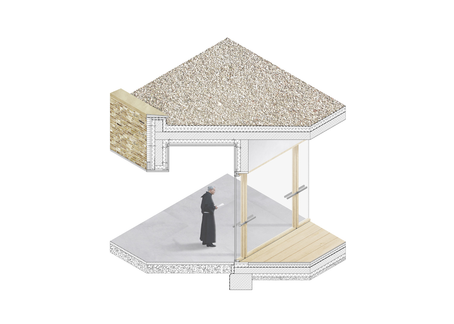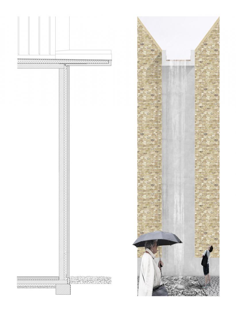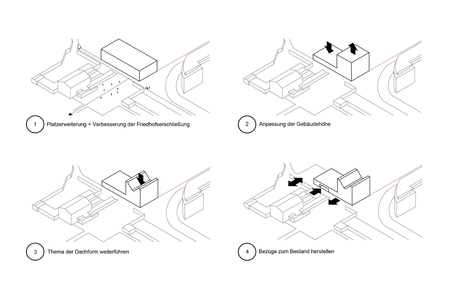 Für den Entwurf wurde ein Grundstück gewählt, das außerhalb der Friedhofsmauern doch in unmittelbarer Nähe zur vorhandenen Trauerhalle liegt. Die zentrale Frage, die sich mir stellte, war: Wie sieht eine multikonfessionelle Aussegnungshalle aus? Obwohl der Bau für die verschiedenen Zeremonien frei von konfessionsgebundenen Symbolen und Bauformen sein muss, ist mir wichtig, dass dieser außen über die Formsprache und innen über die Lichtwirkung als Sakralbau erkennbar ist. Außerdem sollen die Räumlichkeiten den Trauernden Ruhe in dem lebendigen innerstädtischen Umfeld bieten, weshalb die Öffnungen in der Fassade nur auf das Notwendigste reduziert sind. Und auch wenn das Gebäude durch seine multikonfessionelle Nutzung an diesem Ort etwas Neues darstellt, soll es nicht den christlichen Bestandsbau negieren, sondern mit diesem interagieren.