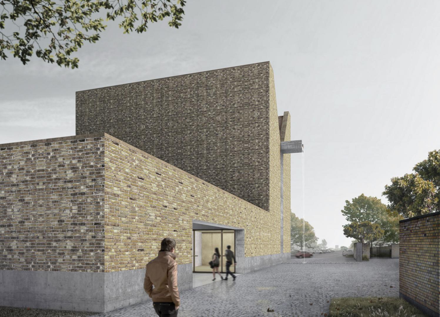 Hierzu wird gelber Backstein verwendet und die vorhandene Schmetterling - Überdachung des Vorplatzes in der Dachform der neuen Aussegnungshalle thematisiert.