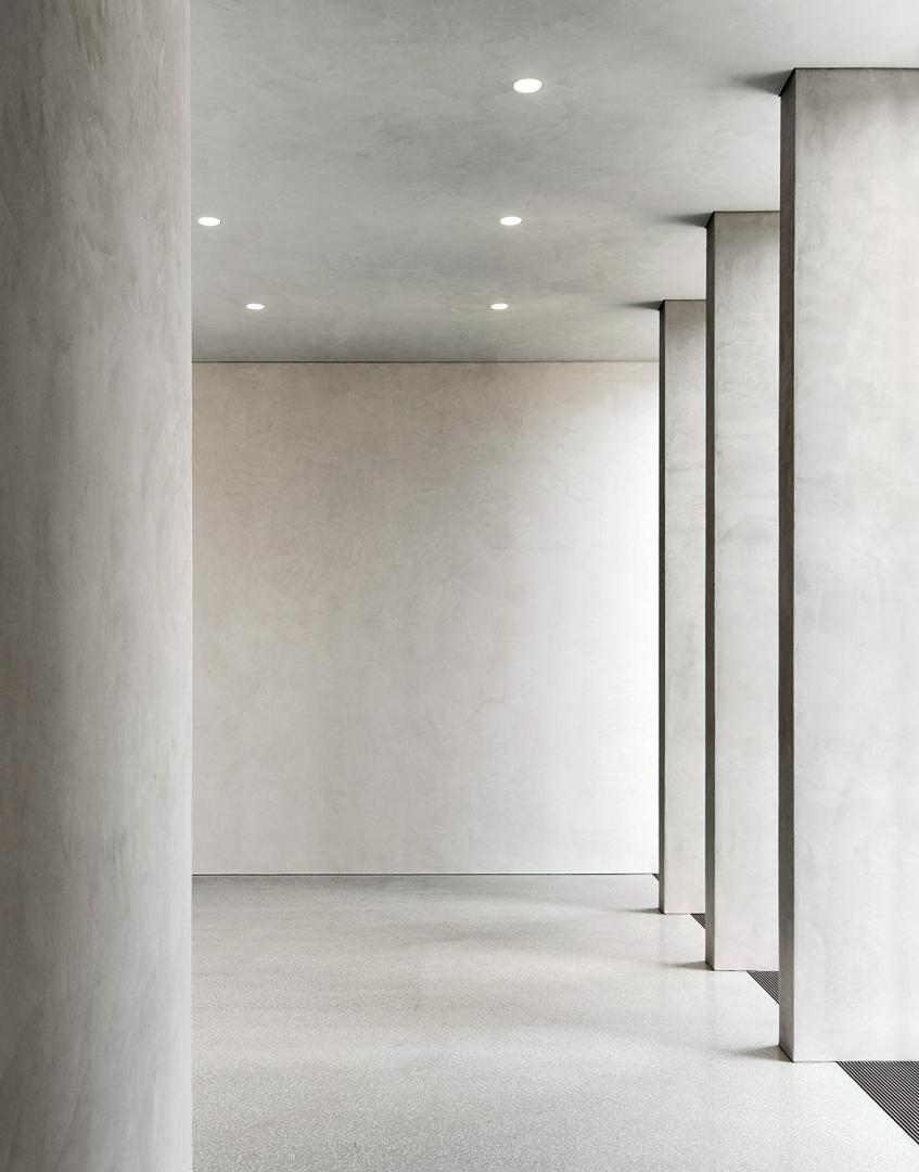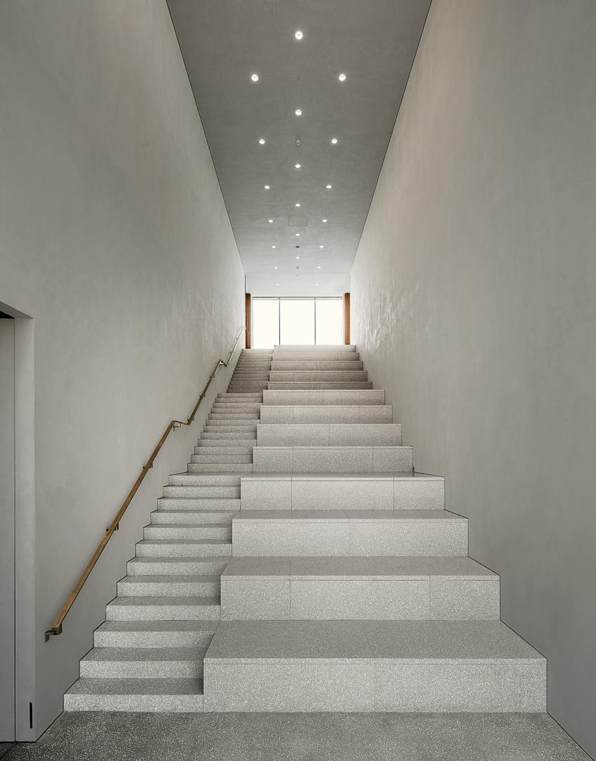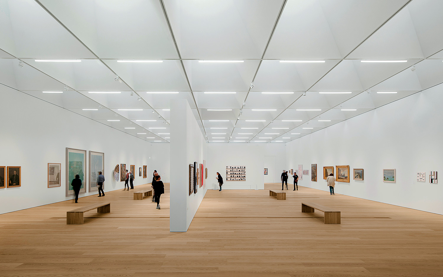 Das Obergeschoss wird durch das nach Norden ausgerichtete modulare Sheddach, das das Sonnenlicht filtert und ausrichtet, natürlich beleuchtet. In dieses Sheddach ist ein internes Jalousiesystem eingelassen, das eine sorgfältige Kontrolle der in die Räume einfallenden Lichtmenge ermöglicht und eine gedimmte Atmosphäre schafft, um optimale Bedingungen für die Kunstwerke zu schaffen.