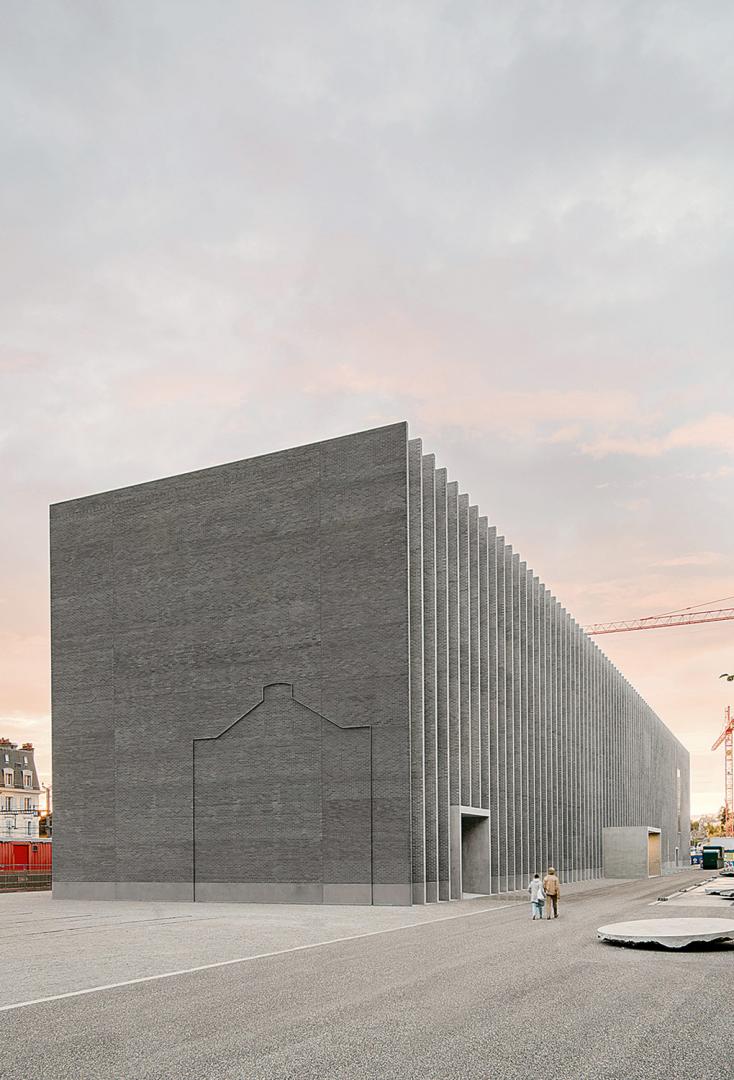 Die Backsteinfassaden evozieren die Industriegeschichte des Ortes und geben dem Baublock Textur und ein lebhaftes Muster. Auf dem Platz durchbricht der Rhythmus der Vertikaljalousien die Massivität des Baublocks und gibt die Öffnungen frei. Nachts dienen diese Jalousien als Leinwand, um das aus dem Museum kommende Innenlicht zu streuen.