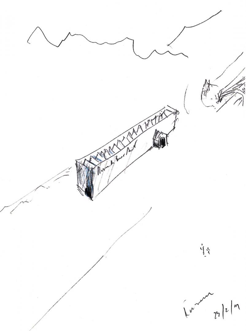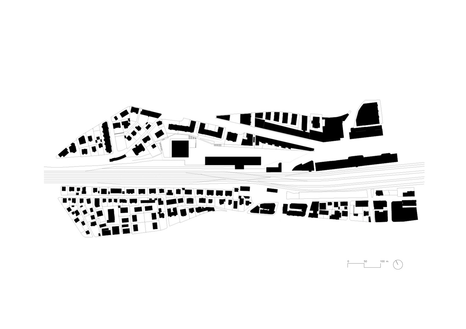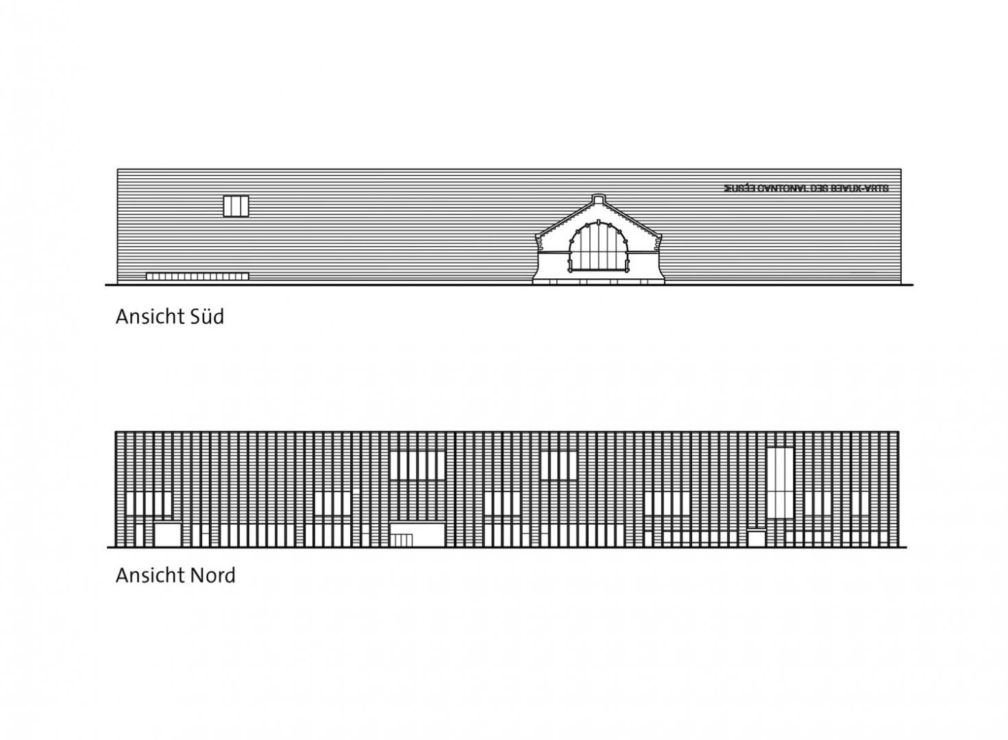 Der Entwurf bewahrt einen Teil der ursprünglichen Halle und überträgt sie als ein zentrales Element des Projekts. Das alte Bogenfenster wird von der Bahn aus gesehen zum Hauptprotagonisten der Gebäudefassade und entfaltet im Foyer seine Rolle als wesentlicher strukturierender Bestandteil der Raumfolge in dem Neubau.