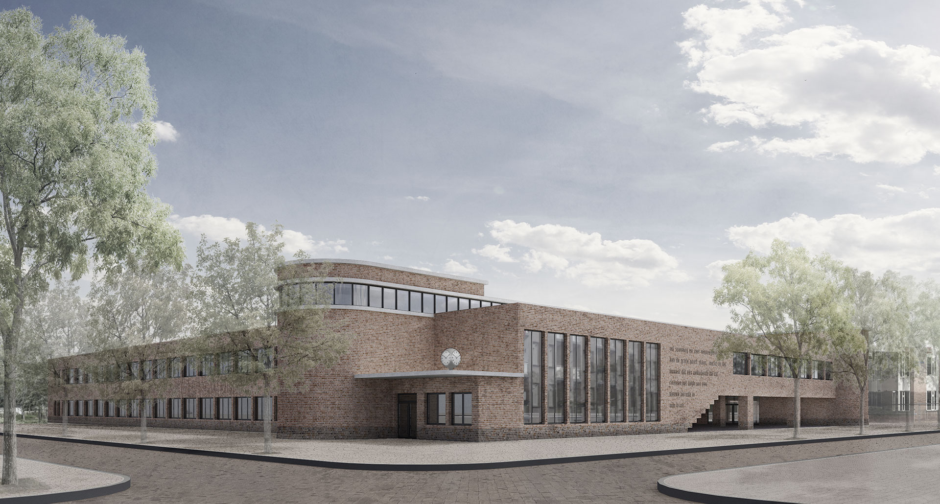 Eine vor allem entwerferische Inspiration war die Lehre der Amsterdamer Schule. Hierbei sind unter anderem die Architekten Willem Marinus Dudok sowie Michel de Klerk zu nennen. Es ging nicht um das Nachahmen dieser beispielhaften Architekten, sondern um eine zeitgemäße Umsetzung der Ideale der Amsterdamer Schule. Programm: Der Haupteingang befindet sich in einem großflächig überdachten Bereich an der Alkmaarstraat. Dieser Bereich ist auch als überdachter Pausenhof bei Regenwetter nutzbar. Der Besuchereingang führt ebenfalls in die Aula. Diese ist zweigeschossig und verfügt über eine Sitztreppe.