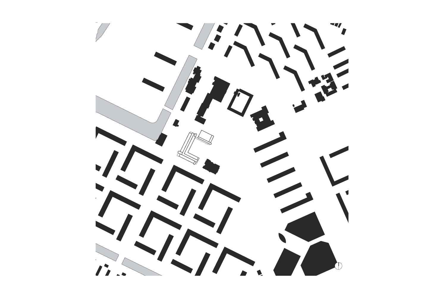 Durch eine U-förmige Anordnung grenzen sie das Grundstück zu beiden Straßenseiten hin ab und schaffen gleichzeitig eine ruhige Hofsituation. Die Erschließung erfolgt über Mittelgänge sowie außen liegende Treppenhäuser. Durch Anbindung an die umliegenden Grünflächen entsteht ein parkähnlicher Pausenhof.