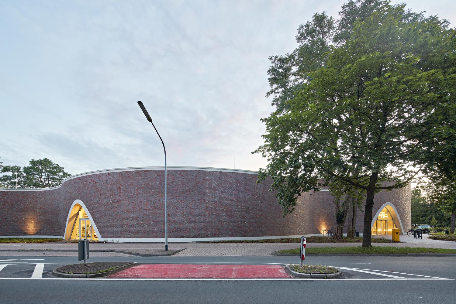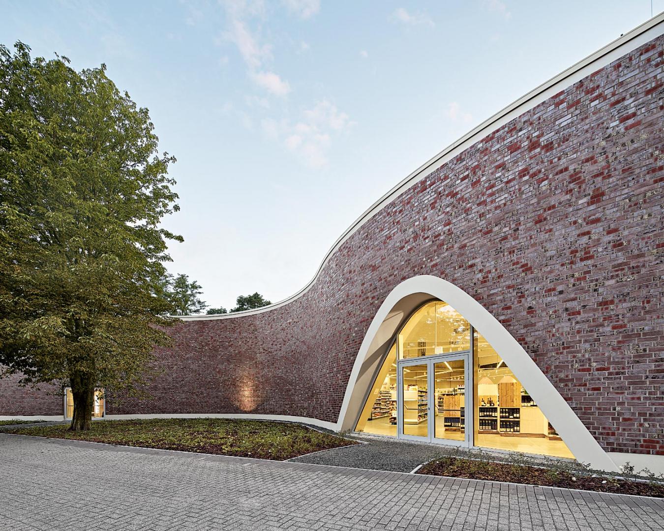 Der Neubau eines Vollversorgermarktes fügt sich organisch in sein Umfeld ein, weil er drei Gebäudekreise in einen gewachsenen Baumbestand integriert.