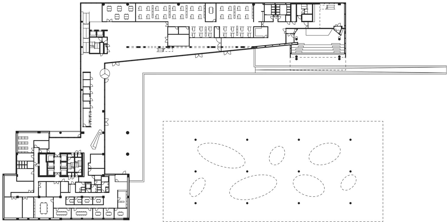In diesem Teil sind öffentlich zugängliche Bereiche wie eine Ausstellungsfläche, ein Auditorium, eine Mehrzweckhalle und eine Kinderbetreuungseinrichtung untergebracht. Unterhalb des L-förmigen Gebäudes befindet sich ein Platz, der ein vielgenutzter Knotenpunkt des öffentlichen Nahverkehrs mit verschiedenen Straßenbahnlinien, Bushaltestellen und Fahrradabstellmöglichkeiten ist. Auch eine Tiefgarage für Pendler ist vorhanden. Mit einigen geschickten Maßnahmen fand der siegreiche Entwurf Antworten auf verschiedene komplexe Herausforderungen im urbanen Raum. Die erste war die Verknüpfung des Bürokomplexes mit dem Umsteigeknotenpunkt für den öffentlichen Nahverkehr. Um zu verhindern, dass starker Verkehr die öffentliche Anziehungskraft des Turms beeinträchtigt, erfolgt der Eingang über einen „schwebenden“ Platz. Das Erdgeschoss wurde über den Verkehrsknotenpunkt gehoben.So entstand ein Freiraum von der Verkehrshektik, der gleichzeitig einen Aussichtspunkt schafft.
