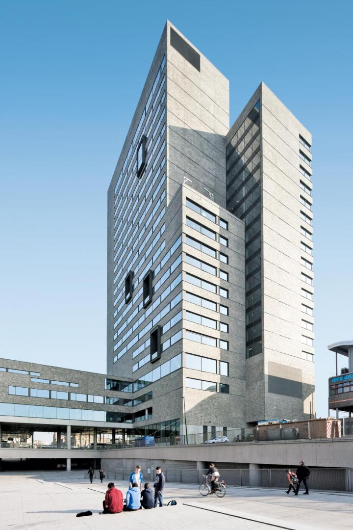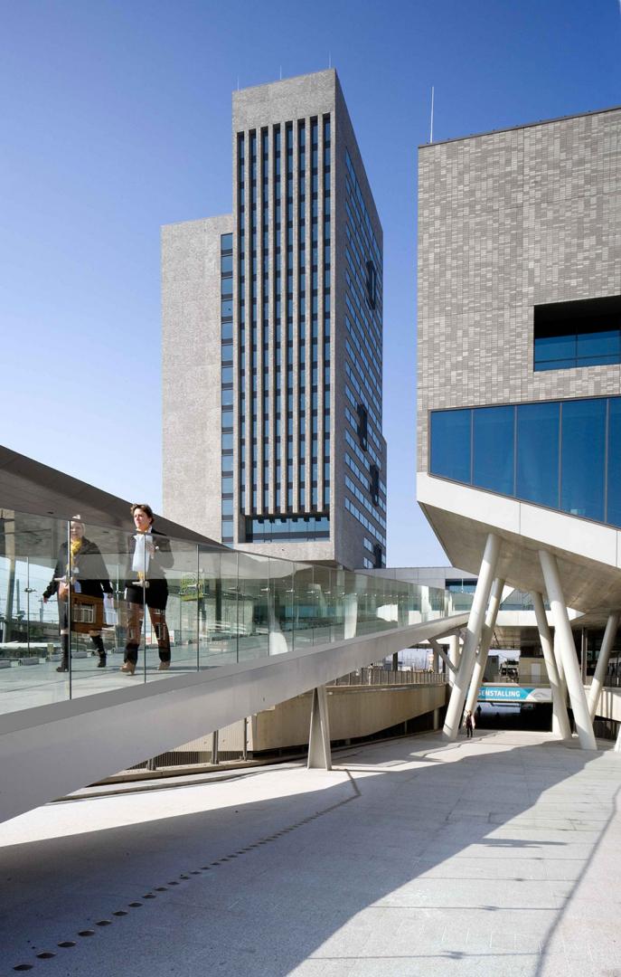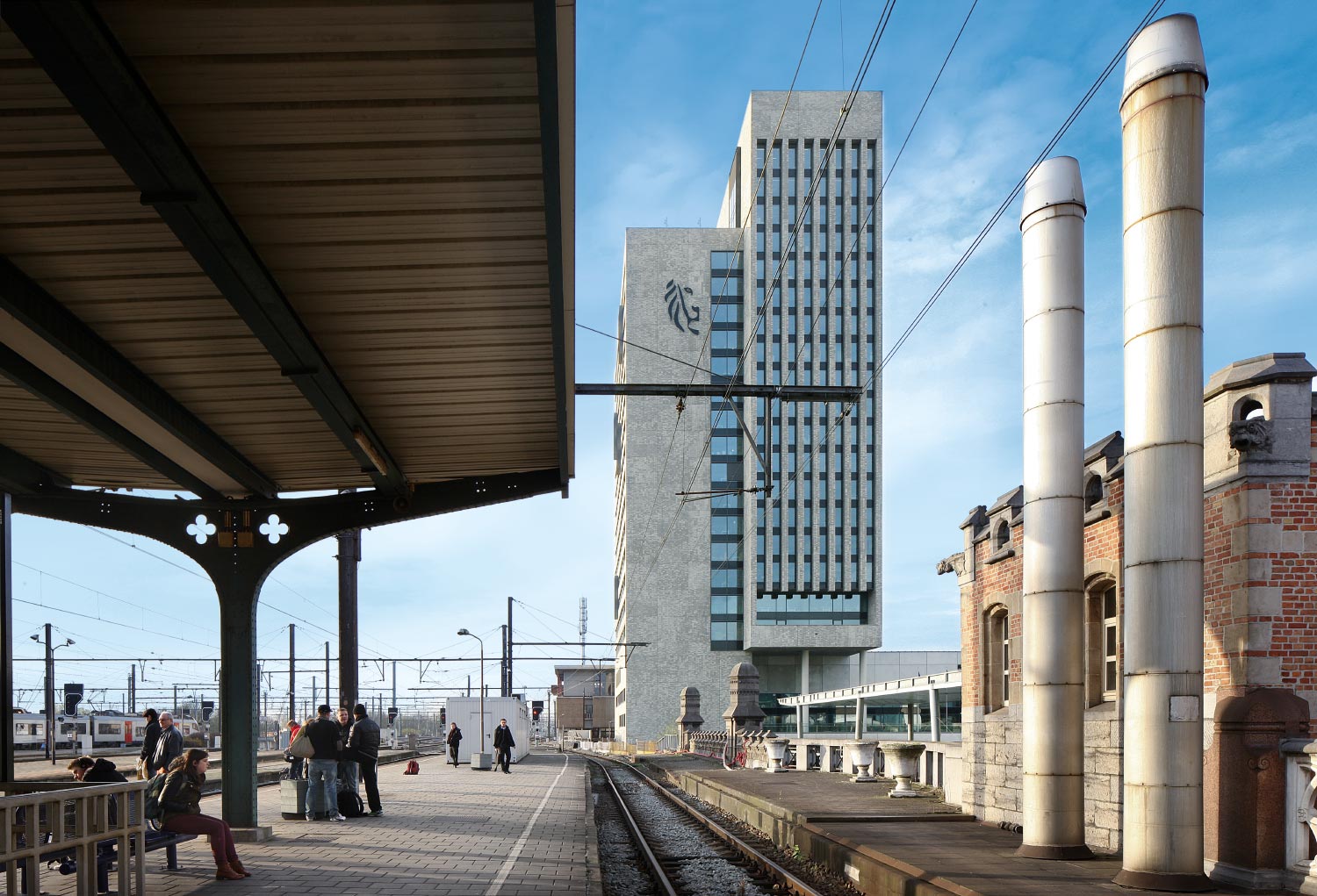 Die beeindruckende Rampe, die vom Bahnhofsplatz her ansteigt, weist den Weg zum Gebäudeeingang. Die zweite Herausforderung lag darin, das große Bauvorhaben behutsam in das fragile Stadtgefüge einzubinden. Insbesondere die Beziehung zur Wohnbebauung entlang der Koningin Fabiolalaan galt dabei als heikel. Um eine Verbindung zu den kleinteiligeren Gebäuden des Viertels zu schaffen, verlagerte der Entwurf einen Teil des geplanten Volumens vom Gebäuderiegel auf den Turm. Der Blick aus den Häusern entlang der Koningin Fabiolalaan richtet sich damit auf ein maßvolleres Bauwerk, während der Turm höher wurde und schmaler wirkt. Gefordert war zudem, den Turm in das weitere Stadtbild zu integrieren. Das Verwaltungszentrum fügt der historischen Ansicht der „drei Türme“ von Gent eine weitere Spitze hinzu. Der neue Turm verfügt über eine Backsteinfassade und schafft über dieses Material eine Beziehung zu den Materialien der historischen Stadt.