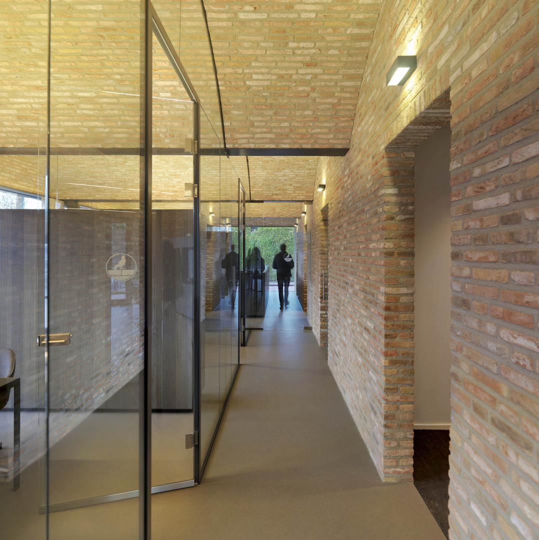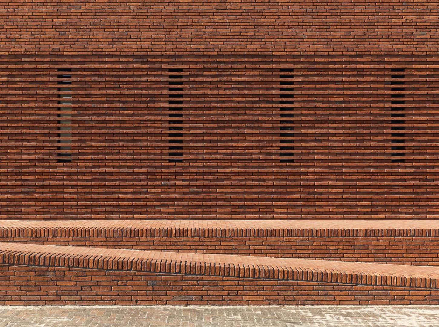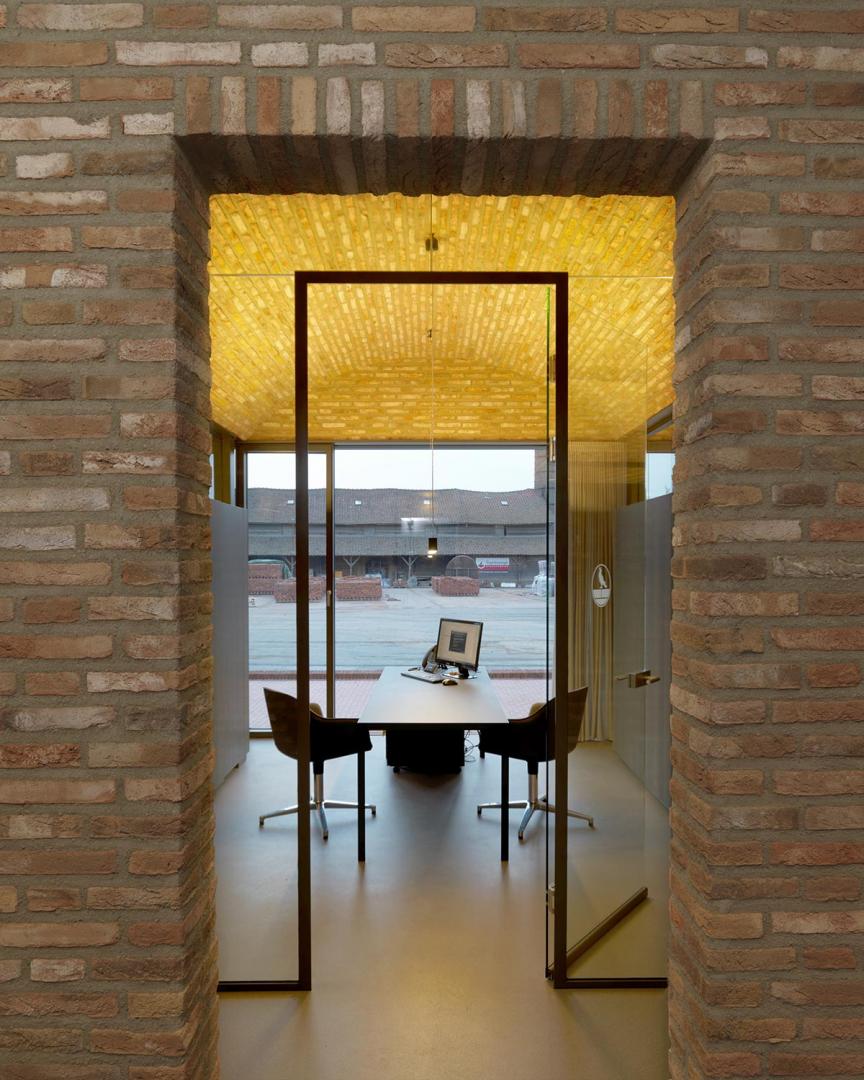 Vogelensangh, eine Backsteinmanufaktur mit reicher Historie und die einzige Ziegelei in der Region, die noch mit einem traditionellen Kohlebrand-Ofen produziert, beauftragte Bedaux de Brouwer Architecten damit, einen zeitgemäßen Pavillon zu entwerfen. Heraus kam ein Entwurf, der sowohl in seinem Inneren wie auch in seinem Äußeren die zeitlose Schönheit der von Hand hergestellten Backsteine feiert. Der Pavillon dient sowohl als Empfangsbereich als auch als Büro und ergänzt die benachbarte Fabrik, in der seit 1919 Ziegel hergestellt werden. Seine Gestalt reflektiert die Reinheit des hier produzierten Backsteins. Der Pavillon, der sich als verlängerter Baukörper mit einem recht geschlossenen Backstein-Eingang darstellt, thront auf einem Sockel. Die Backsteine des Gebäudes wurden absichtlich in einem einfachen Mauerverband verlegt, der sich auf die einfache Art und Weise bezieht, wie Steine in der Ziegelei gestapelt werden.