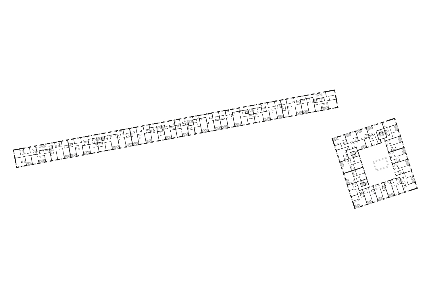 Markant ist für beide Baufelder die disziplinierte Fassadengestaltung, die durch Arkaden eine ganz eigene Eleganz erhält. Beide Gebäude sind symmetrisch aufgebaut und auf jeweils ein Fensterformat reduziert.