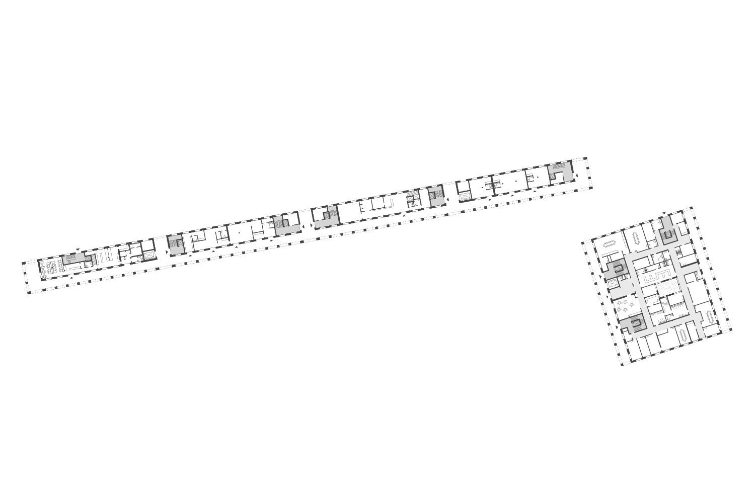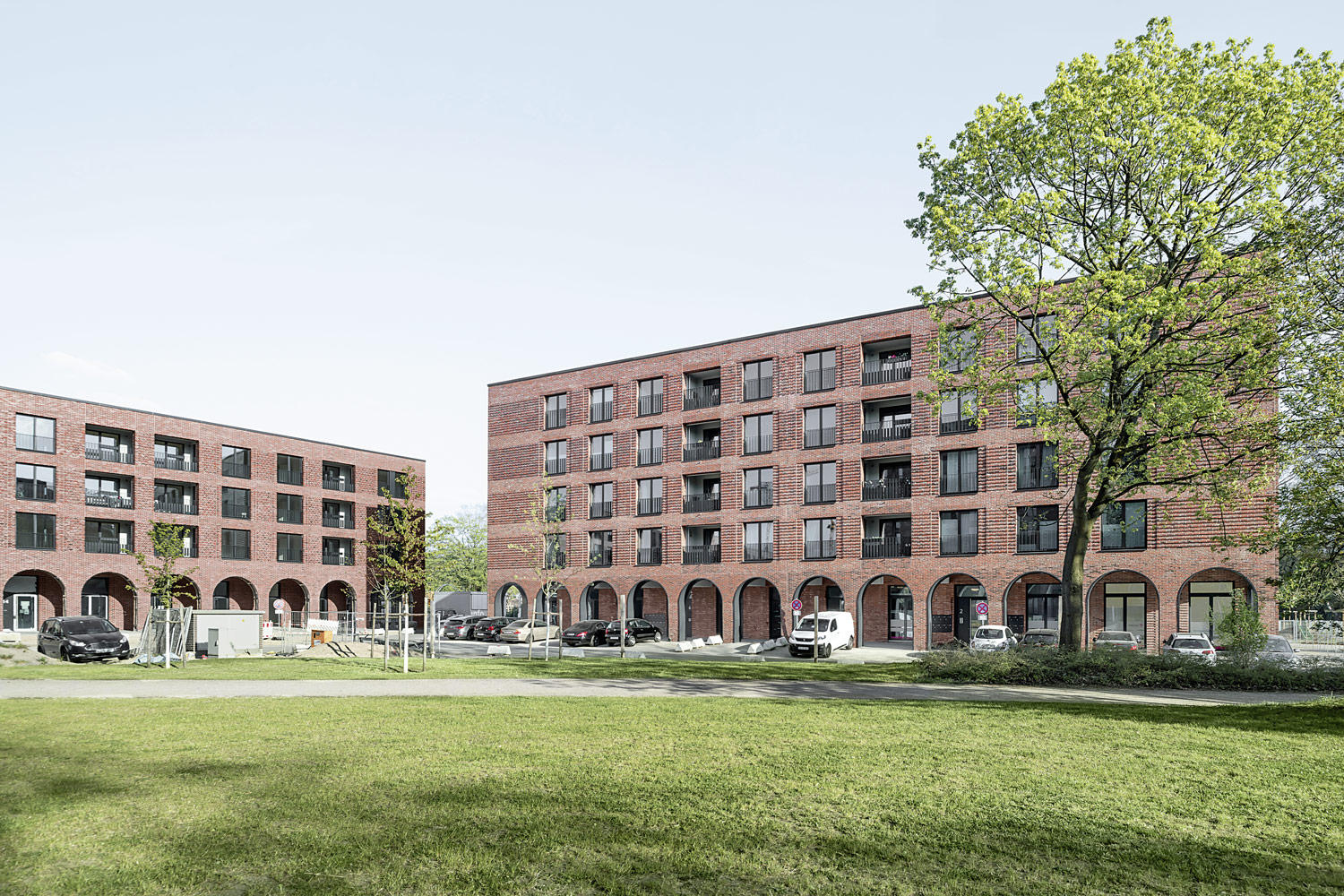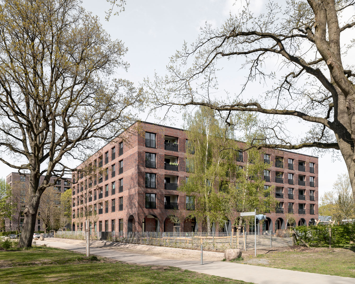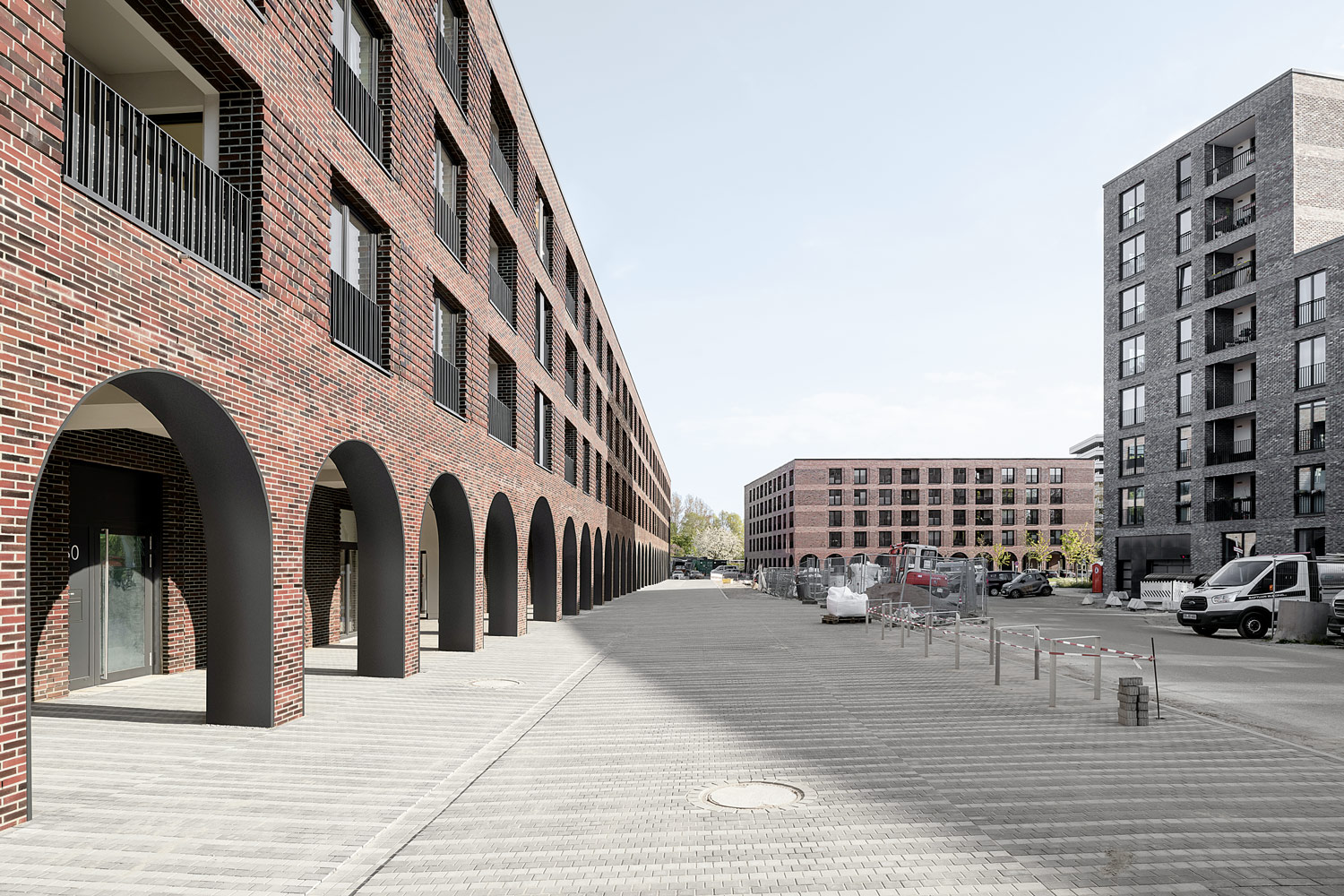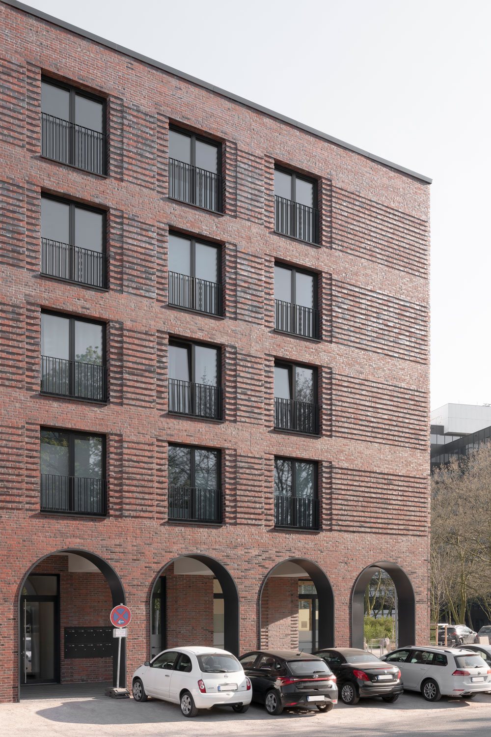 Die Detaillierung der Klinkerfassaden ist auf beiden Baufeldern ähnlich, wobei durch spezifische Proportionen und die jeweilige Ornamentik der Fensterleibungen die Eigenheiten der Gebäude betont werden: Beim langgestreckten Baukörper wird die Horizontalität herausgearbeitet, während das kompaktere Volumen des südlichen Baufelds durch eine vertikalere Gliederung in sich ruht.