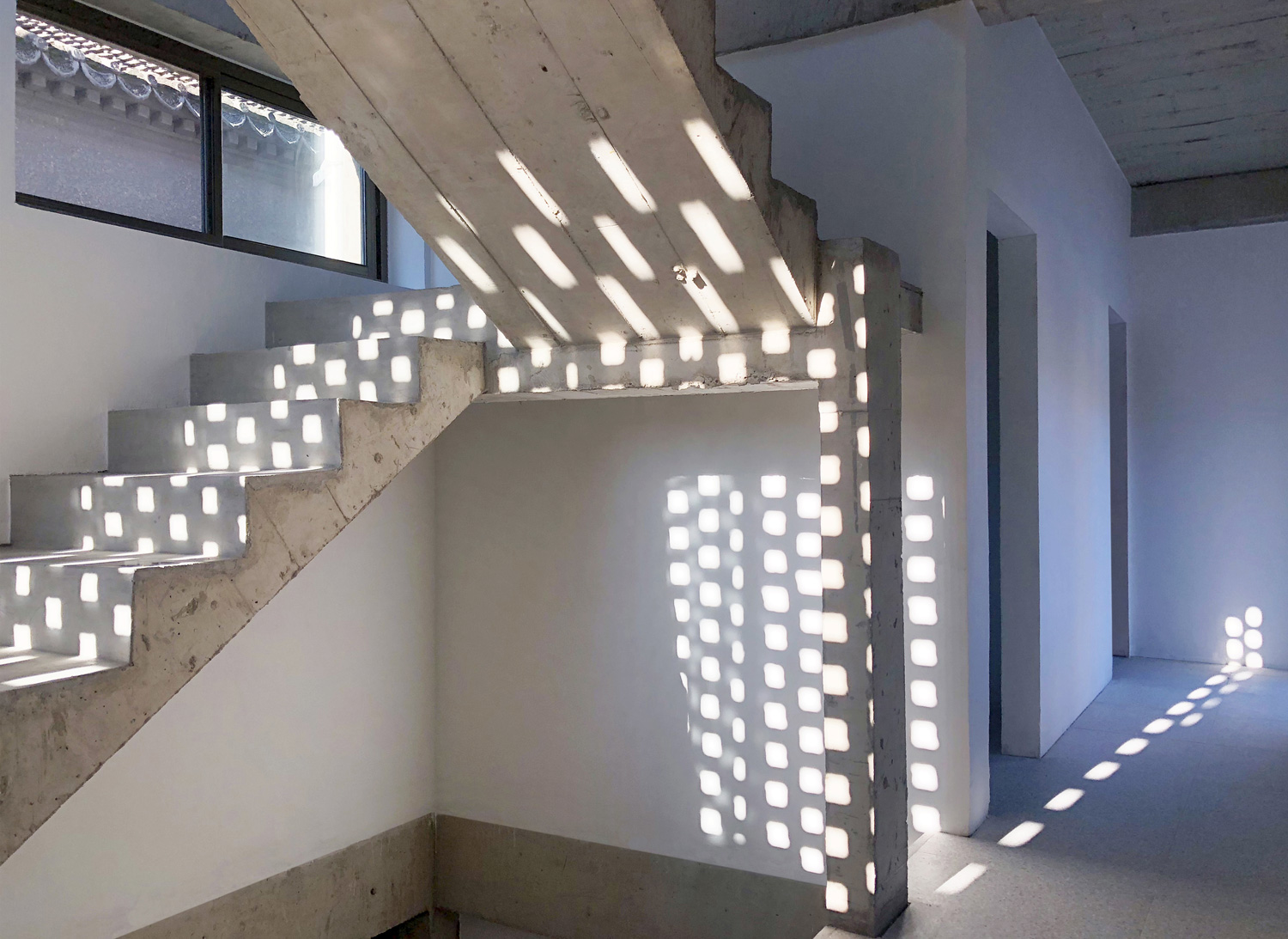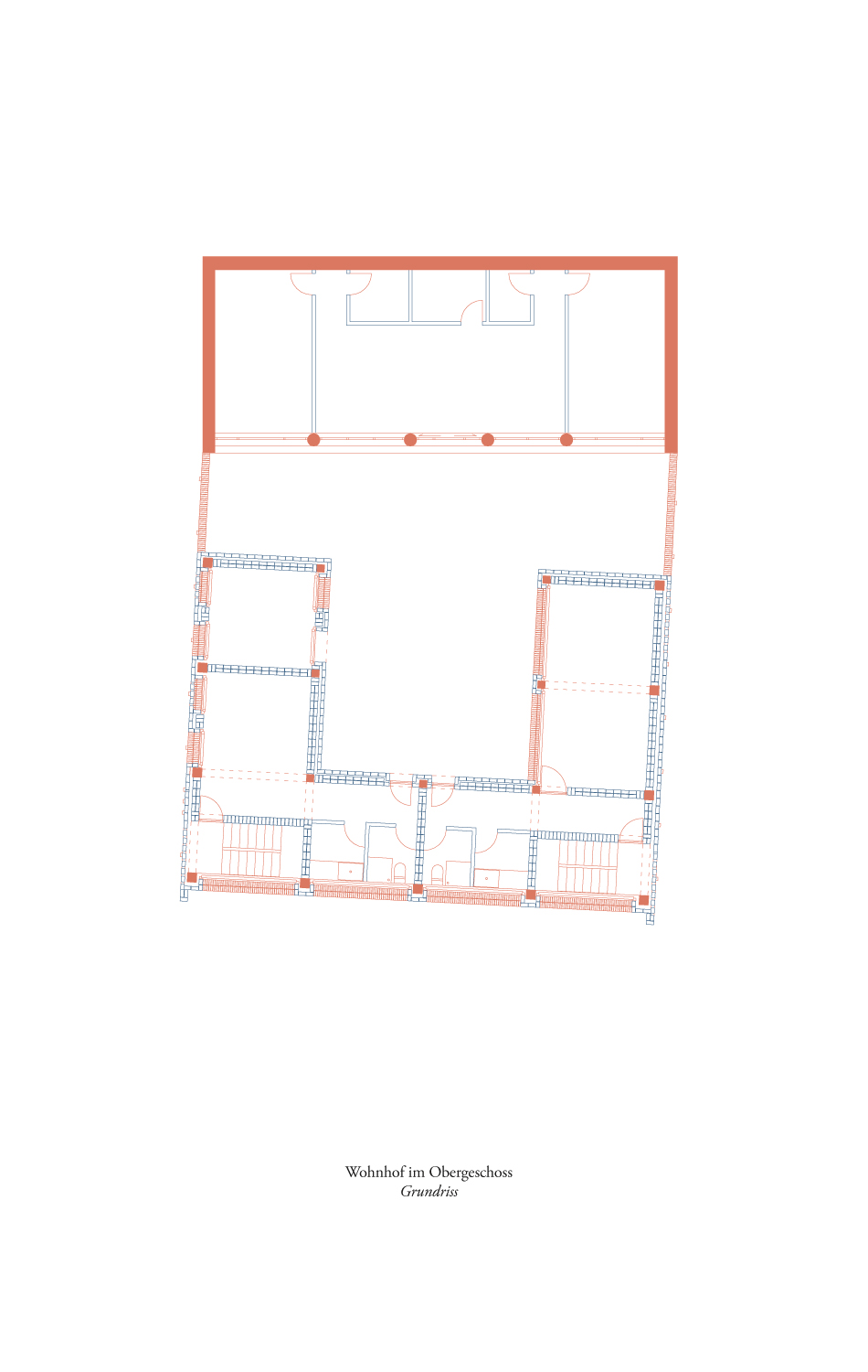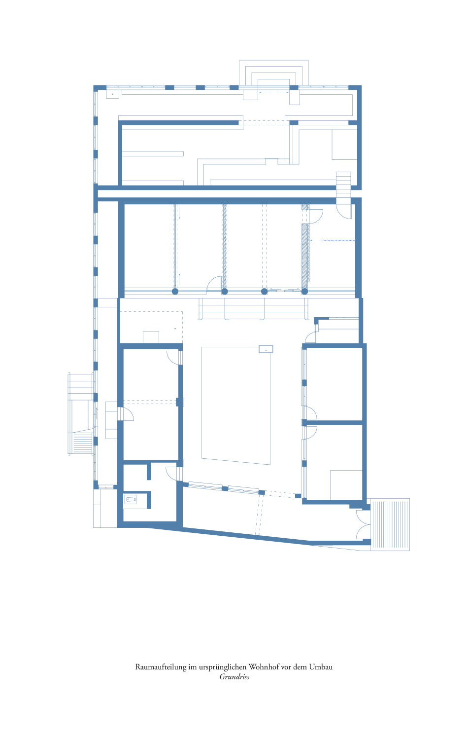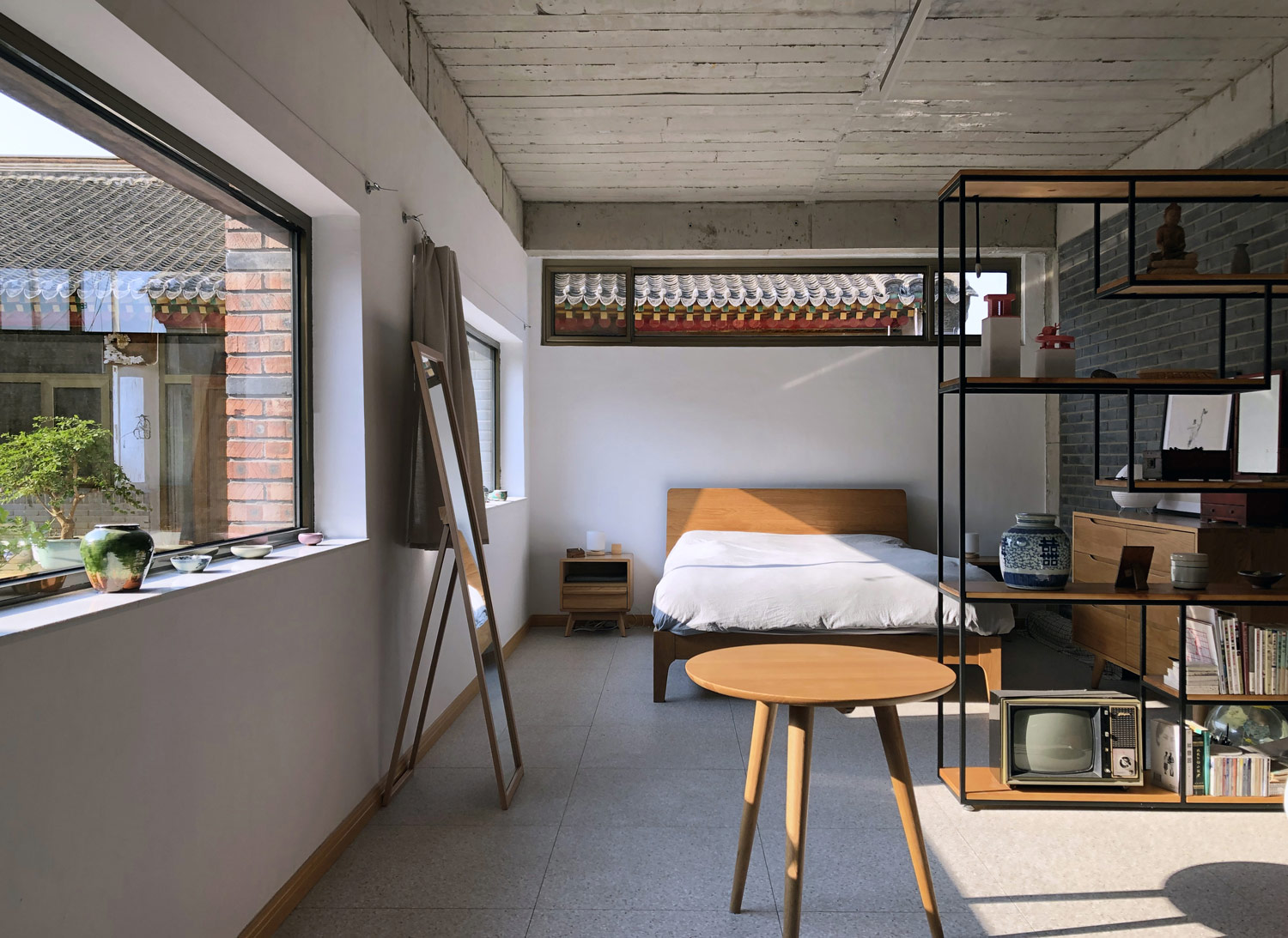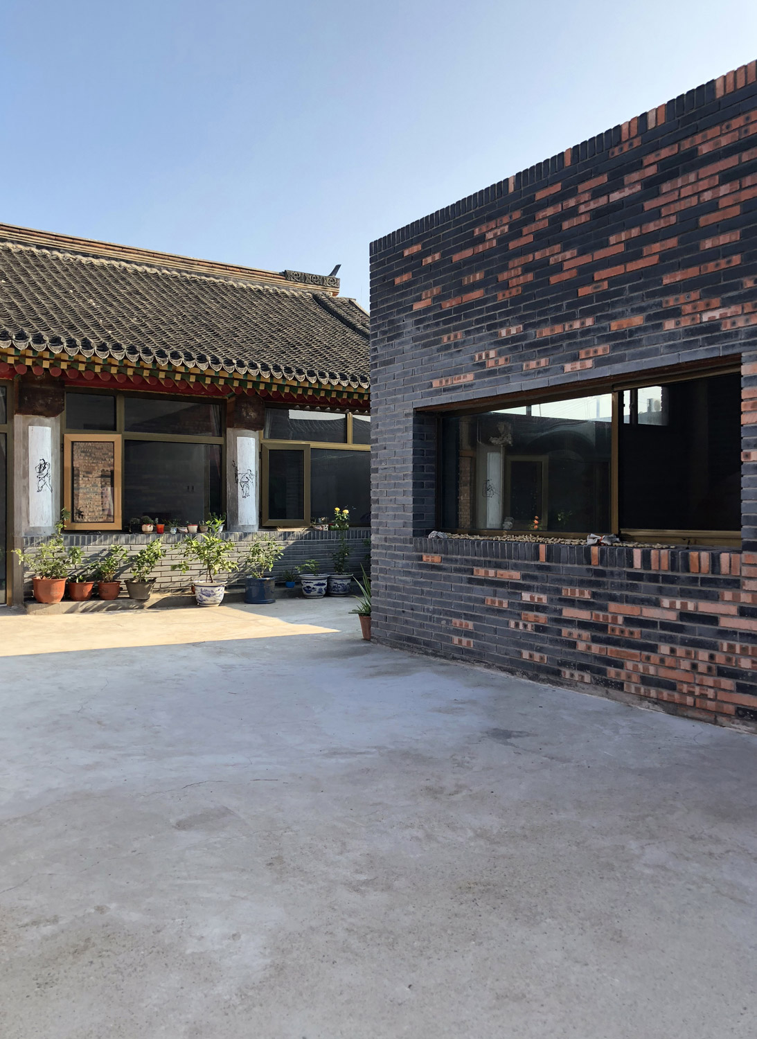 Eine der wichtigsten Eigenschaften des chinesischen Wohnhofes ist seine Flexibilität zur Anpassung, Erweiterung und Transformation. Der Neubau, der an das erhaltene Hauptgebäude anschließt, ist so entworfen, dass der frühere Raum des Hofes angehoben wurde, um Platz für einen Laden im Erdgeschoss zu schaffen. Der ursprüngliche Boden im Erdgeschoss wurde abgesenkt und eine neue Bodenplatte in das bestehende Gebäude für das neue Obergeschoss gezogen. Die Raumaufteilung des neuen Grundrisses ist dem typischen Wohnhof in Nordchina nachempfunden, wobei während der Planung immer wieder Komplikationen wegen der Berücksichtigung der Prinzipien des Feng Shui und der lokalen Bautradition auftauchten. Besondere Aufmerksamkeit galt der Orientierung und dem Raster des Grundrisses sowie der Positionierung von Stützen und Wandöffnungen.