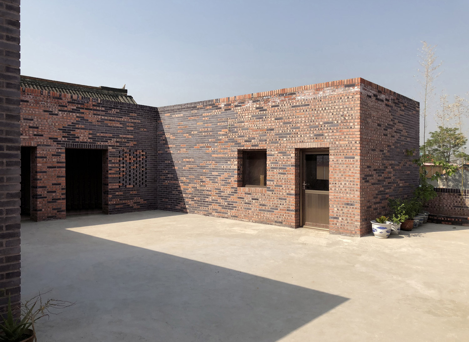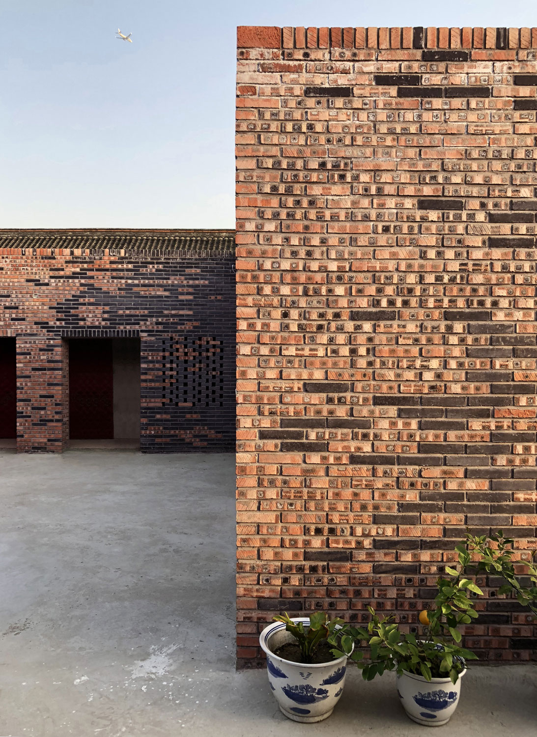 Das Gebäude ist auf einem Grundstück mit einer Nord-Süd-Achse gelegen, wobei das Hauptgebäude sich nach Süden öffnet. Der Eingang befindet sich – typisch für traditionelle chinesische Landhäuser – in der südöstlichen Ecke. Deckenhöhen und Wandabstände mussten einer bestimmten Hierarchie folgen. Der blaue Ziegelstein prägt das historische Peking bis heute und ist in der nordöstlichen Region von China vorherrschend, wird aber heutzutage immer weniger im Bau verwendet. Billigere rote Ziegel werden heute überwiegend in selbstgebauten Landhäusern verwendet. In dem Projekt ‚Pfirsichhaus’ wurden recycelte Ziegel aus der Umgebung wiedereingesetzt. Die Fassadengestaltung mit zwei verschiedenen Ziegelfarbtönen löst den Kontrast auf und schafft ein Gleichgewicht. Darüber hinaus verschmelzen sichtbare Brandspuren auf den roten Ziegeln die beiden Töne miteinander.