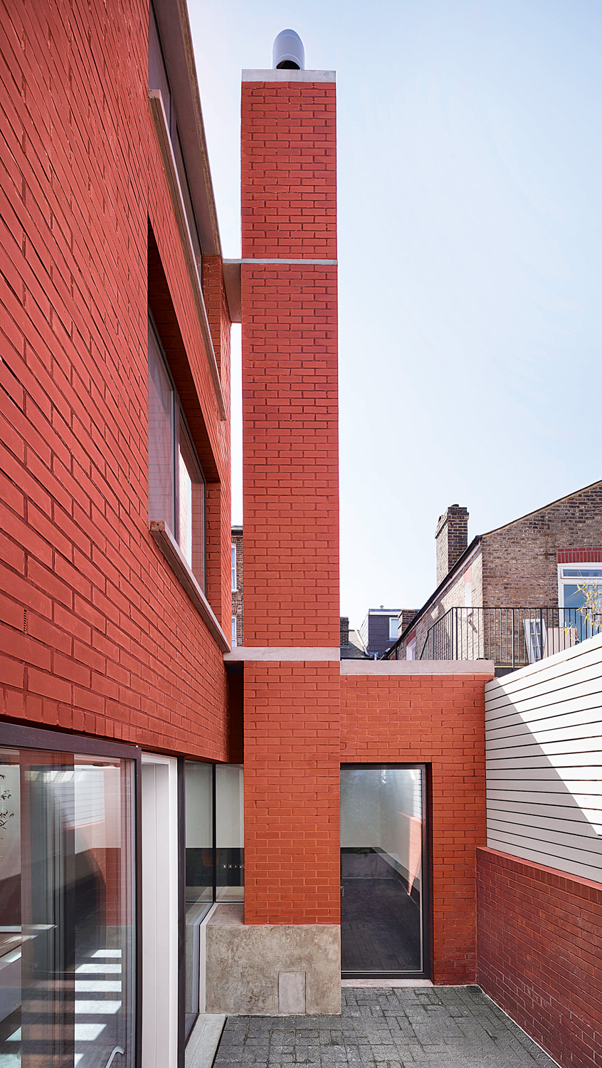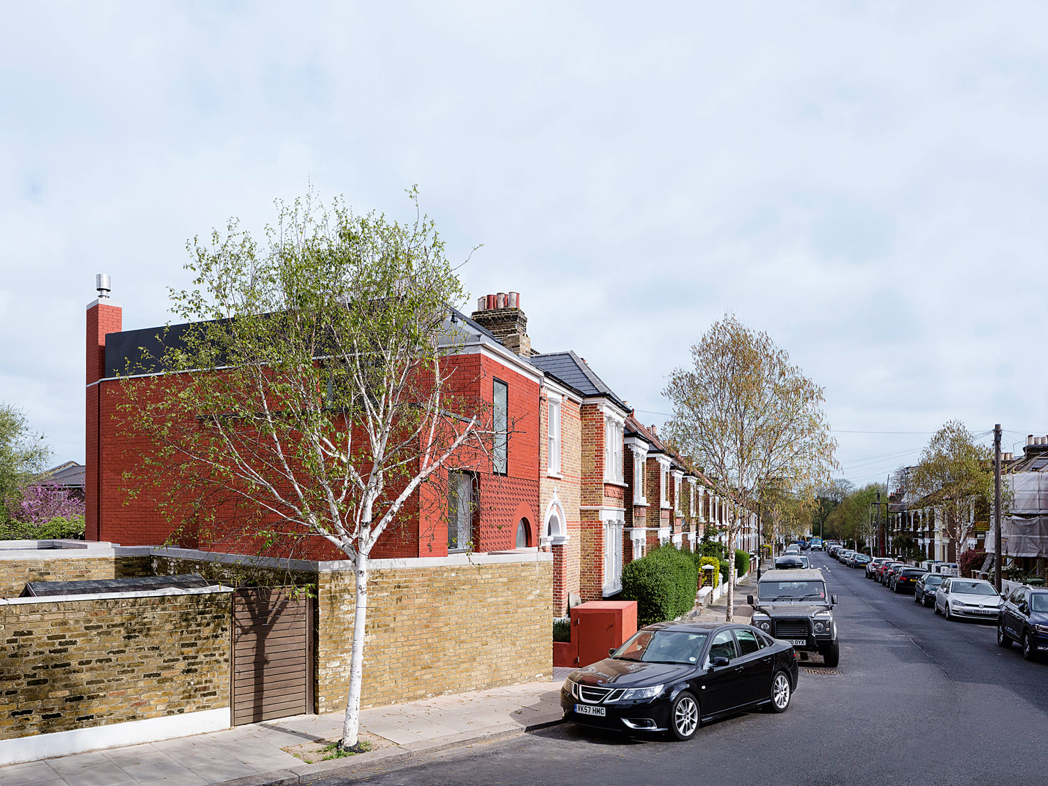 Indem es sich auf bestehende Formen und Muster bezieht, reiht sich das Red House respektvoll in die historisch gewachsene Häuserzeile ein und bildet mit Akzenten wie dem warmen Ziegelrot zugleich einen mutigen, individuellen Schlusspunkt.
