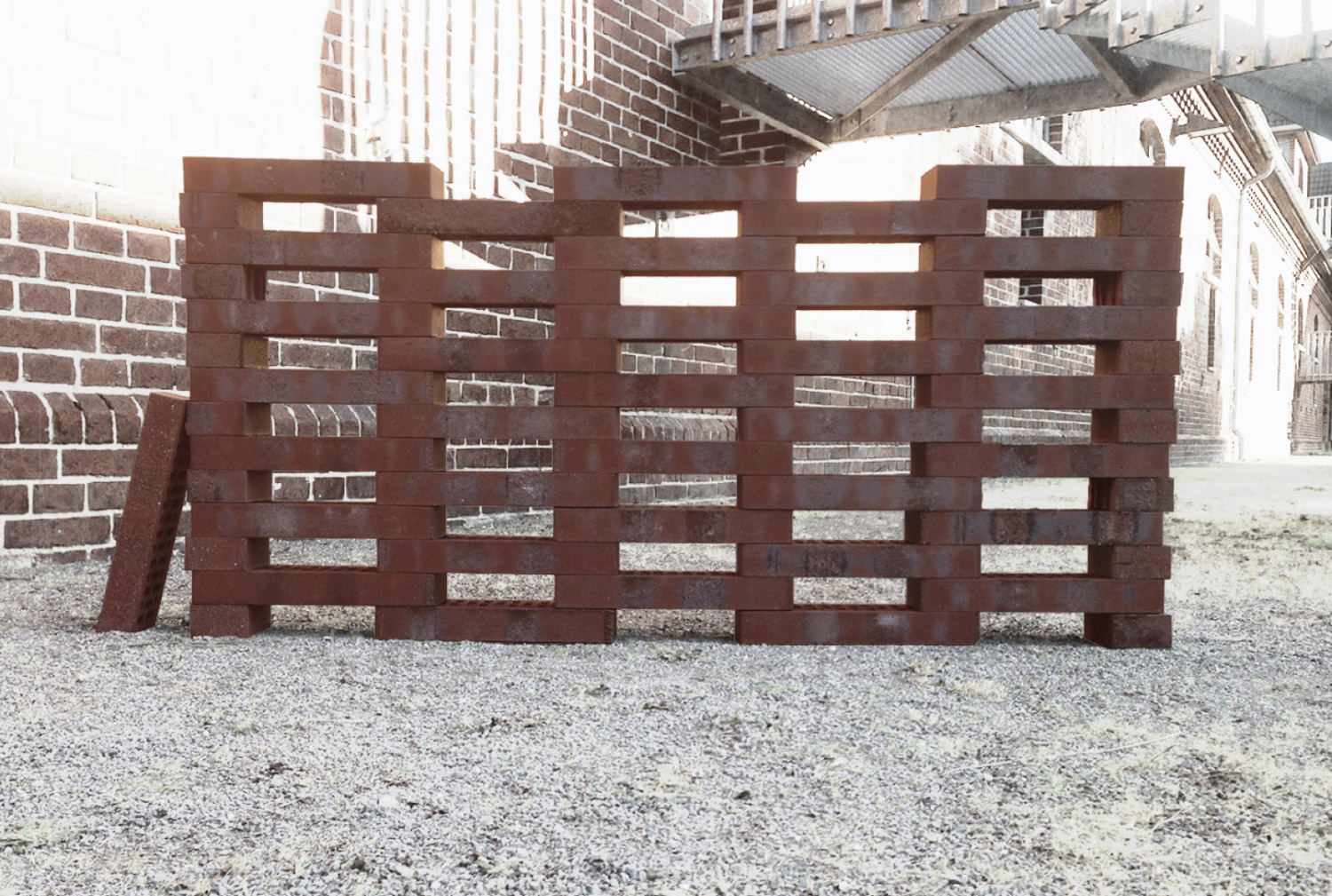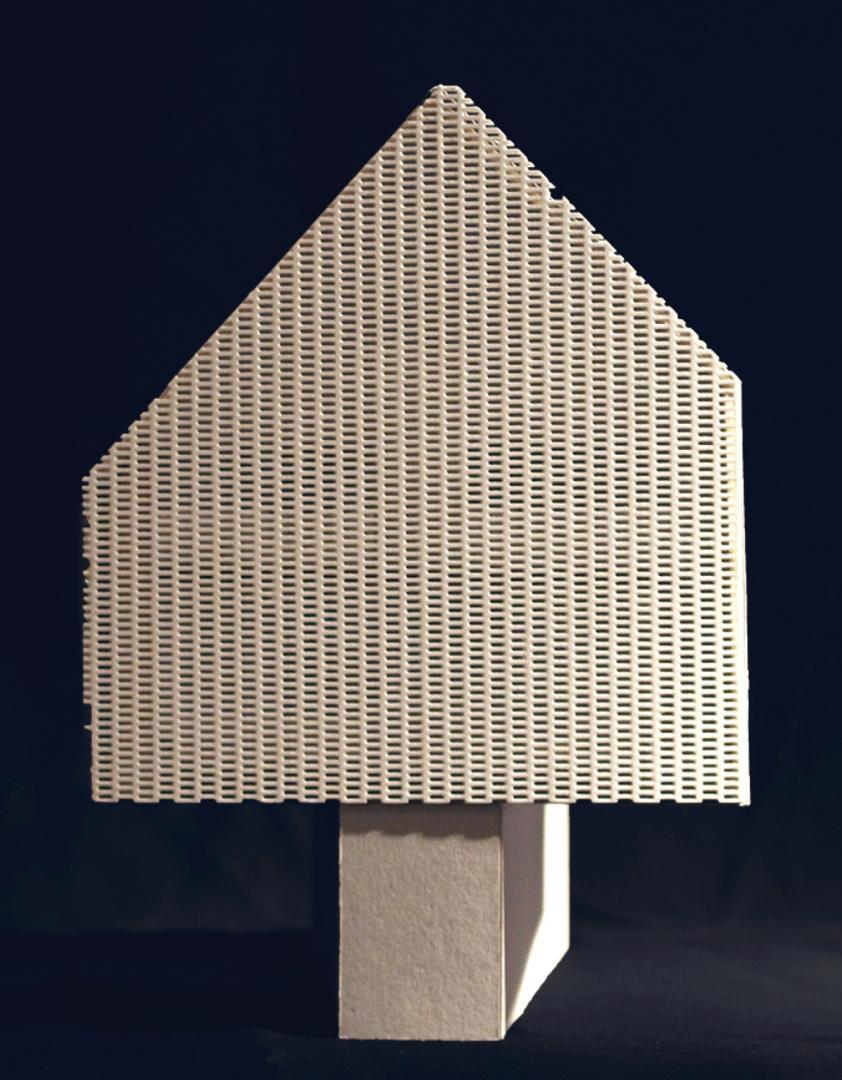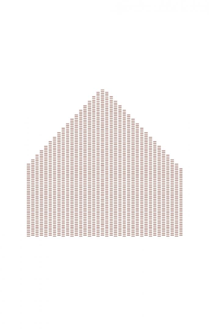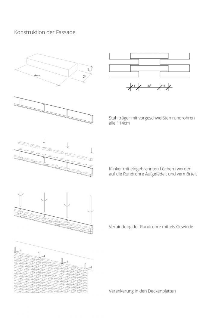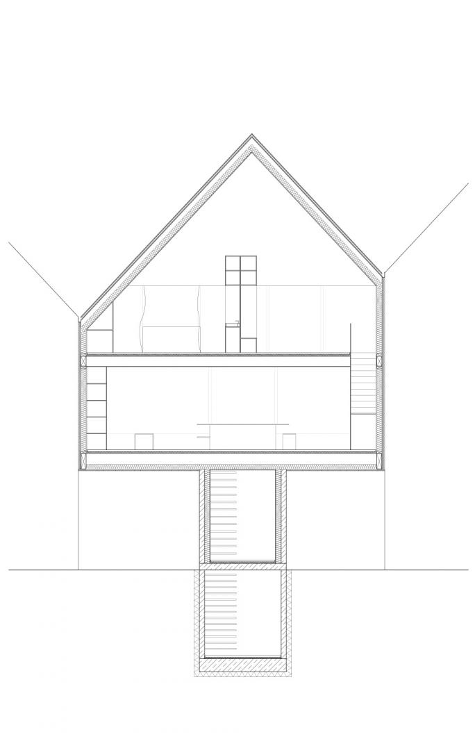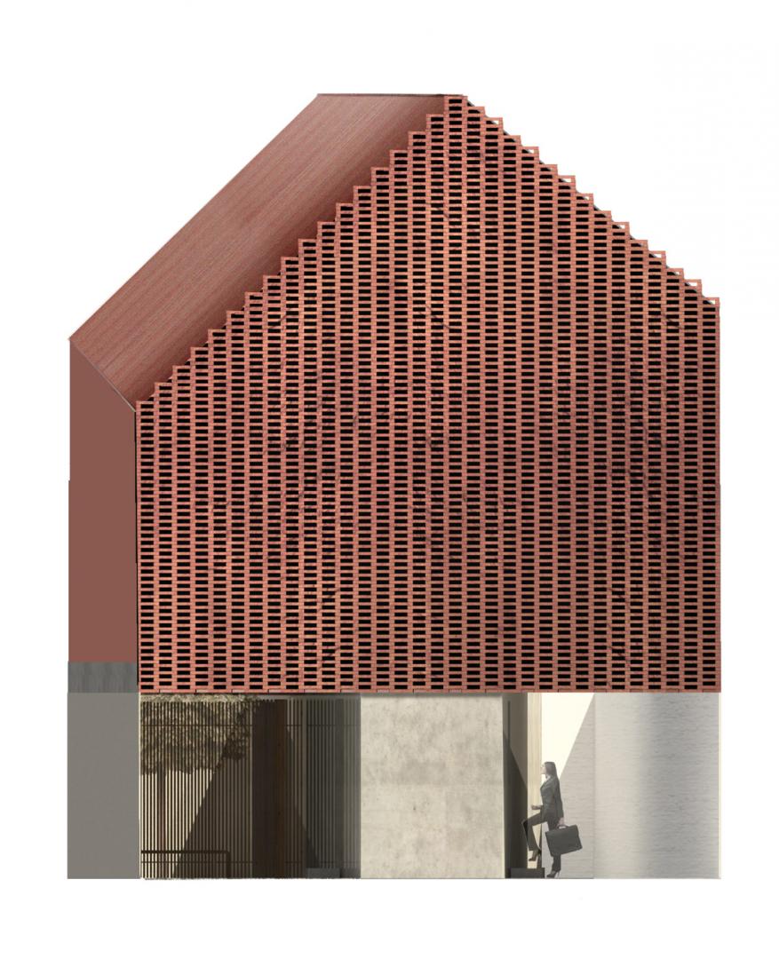 Jegliche Funktionen werden hinter einer doppelten Wand untergebracht, welche sich jeweils an den Brandwänden positionieren. Das erste Obergeschoss beinhaltet einen Wohn-, Koch- und Essbereich und bietet darüber hinaus einen Austritt auf die Dachterasse. Das zweite Obergeschoss ist für die private Nutzung ausgelegt und bietet Raum für Schlafen als auch für das Hobby. Eine perforierte Backsteinfassade grentzt den Innenraum an der Nordseite zur Straße ab. Sie bietet Sichtschutz und sorgt für einen diffusen Lichteinfall in den dahinterliegenden Zimmern.