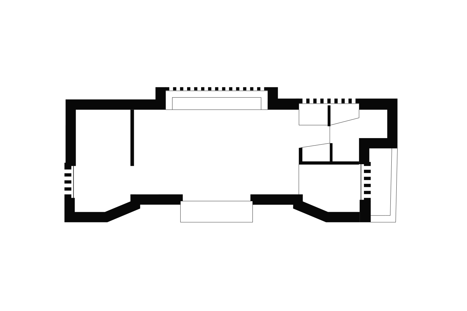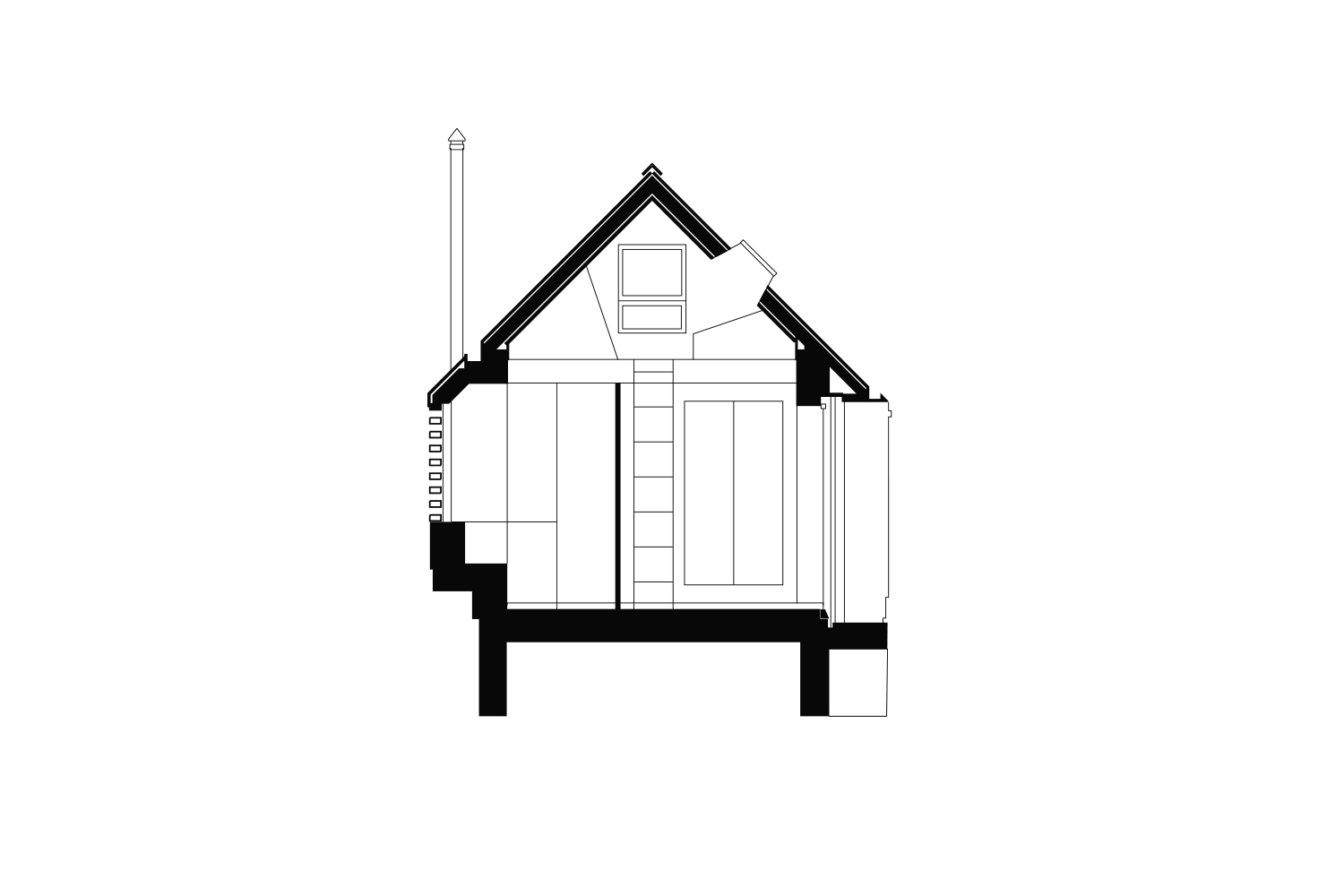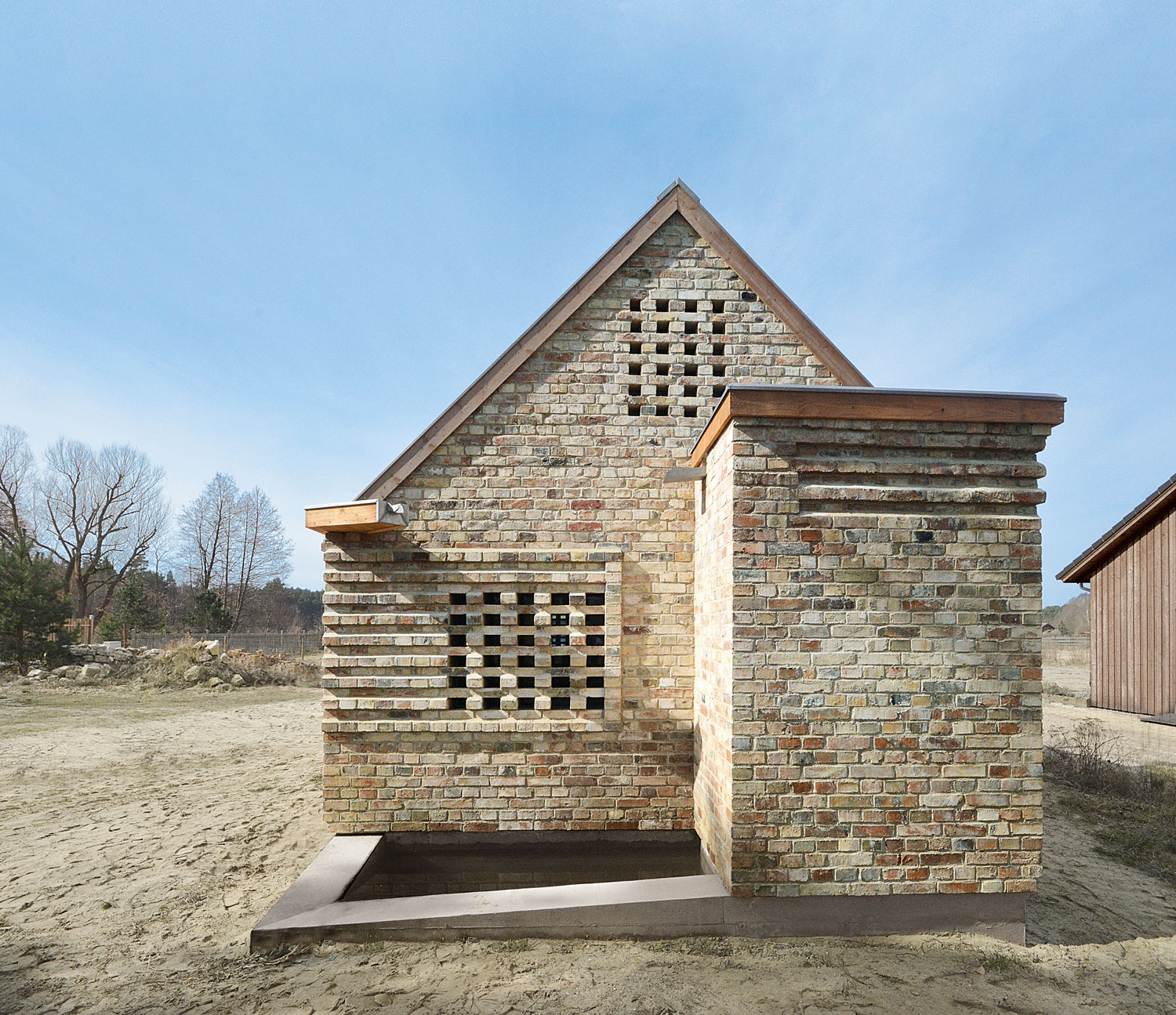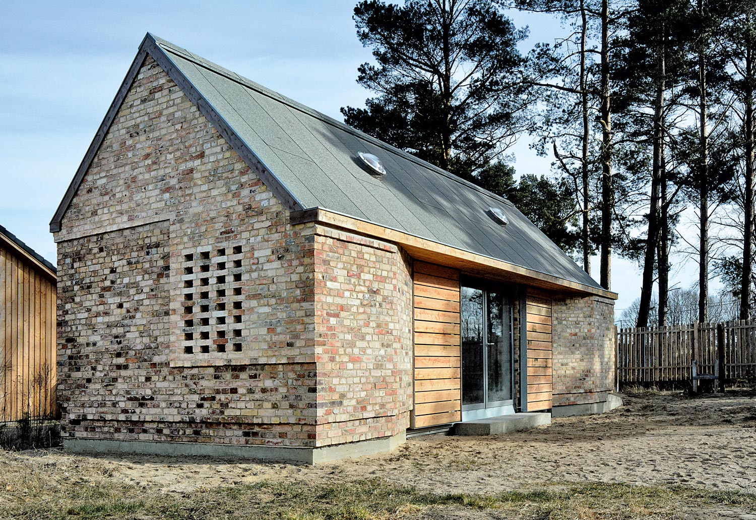 Das Bauwerk, das sich in Versätzen von der Beton-gründung über die Schichtung der unterschiedlich getönten Steine bis zur grau-grünlich beschieferten Dachpappe fortsetzt, erinnert an die gemauerten Feldscheunen der Region und greift gleichzeitig die Sedimentschichten des zwischen drei Gewässern liegenden Schwemmlands auf. Es entsteht eine Hausskulptur von großer Plastizität, in deren Versätzen sich Orte des Stehens, Sitzens und Liegens abzeichnen: Aus der Nordwand kragt die gemauerte Sitzbank als Erker mit spanischer Wand aus, nach Osten tritt die Dusche als Risalit-Körper neben das Regenwasserbecken. Anstelle von Fensteröffnungen ist das Mauerwerk als Sicht- sowie Einbruchschutz durchbrochen und hinterglast.
