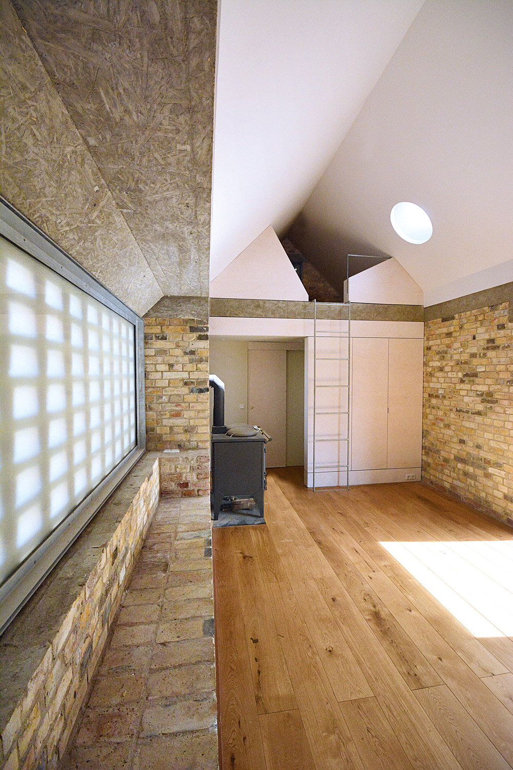 Der Innenraum bietet höchste Raumeffizienz: Schlafnischen, Kochecke und Bad sind als möbelartige Einbauten aus weiß geöltem Birkensperrholz konstruiert. Sie differenzieren den Einraum, ohne dessen Raumwirkung und das Durchwohnen zu beeinträchtigen. Eine Kinderempore über den Gästealkoven erschließt den Raum direkt unter dem Dachzelt, durch dessen runde Oberlichter über den Tag Sonnenflecken durch den Loftraum wandern. Auch die Technik ist reduziert: Ein Holzofen mit Wärmespeicher sorgt mit Holz aus dem nahegelegenen, eigenen Waldstück für Raum- und Kochwärme, das Regenwasser von den Dachflächen wird in einem offenen Becken gesammelt.