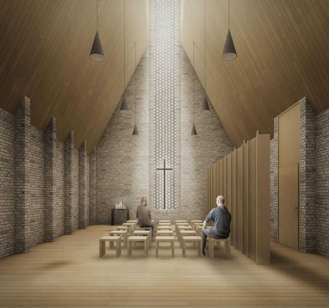 Beide Themen stellen eindrücklich die Frage nach der unbedingten Würde von Mensch und Schöpfung und ermöglichen Orientierung und Zugang zur eigenen Spiritualität. Der durch das Verdrehen des Bausteines „Kirchliche Arbeit“ geschaffene Turm versinnbildlicht Stärke und Präsenz durch sein monolithisches Erscheinungsbild. Der am monolithischen Turm, am Verbindungsbau und am Langhaus verwendete helle Ziegel wurde als Kontrast zu den dunklen Natursteinfassaden der NSArchitektur gewählt.