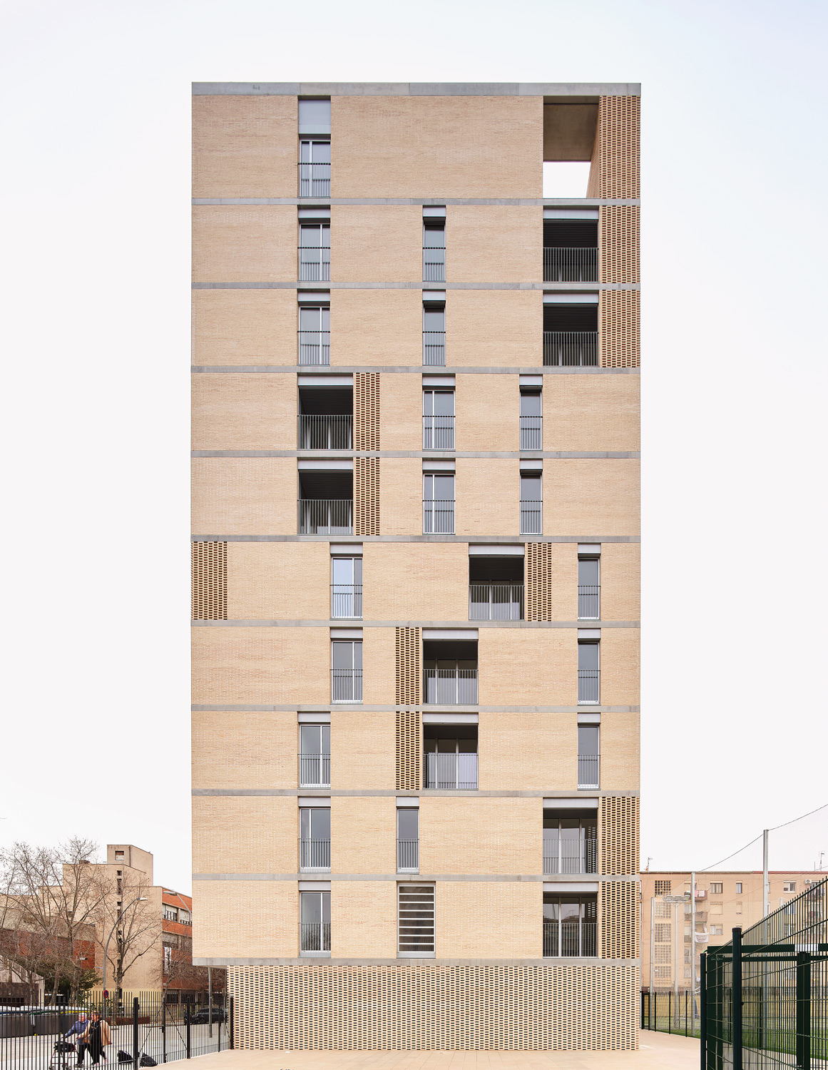 Once upon a time, small row houses lined the narrow streets of the Bon Pastor district. A feeling of good and trusting neighborliness and at the same time open structures characterized the residential flair. And it was precisely this concept that Peris+Toral based the design of the Social Atrium on. The mixed-use building combines social rental housing uses with a ground floor equipment programme, which houses a multi-purpose hall and changing rooms for the adjacent courts, as well as a car park with natural ventilation.