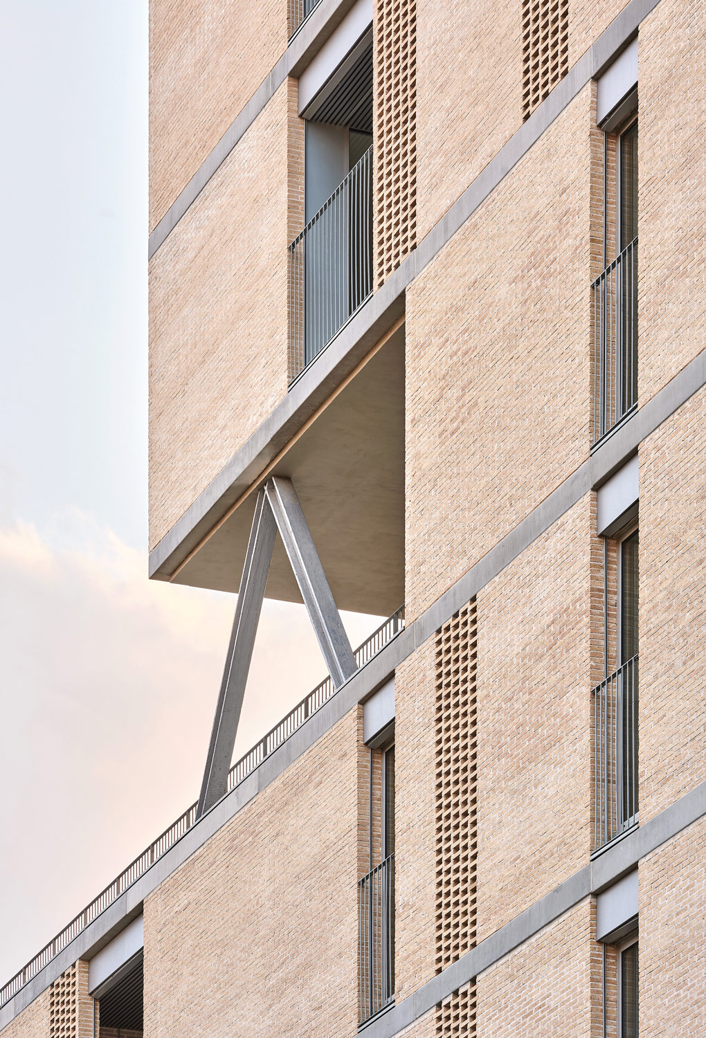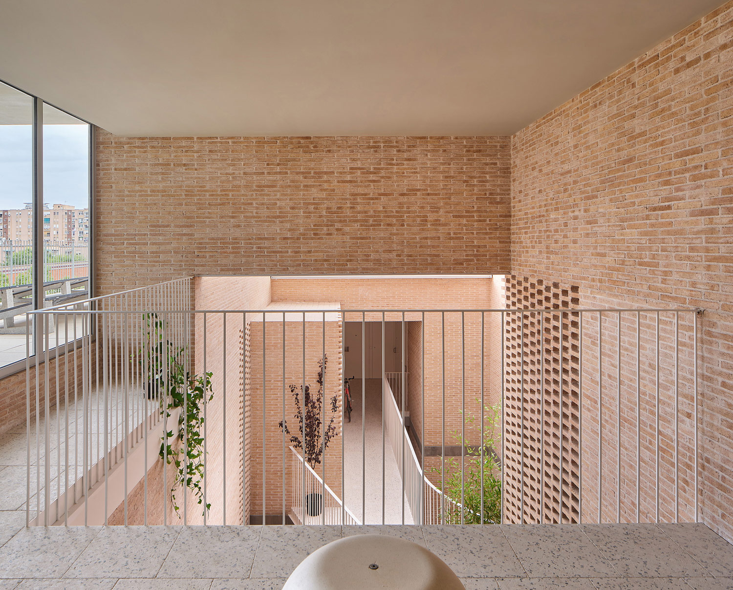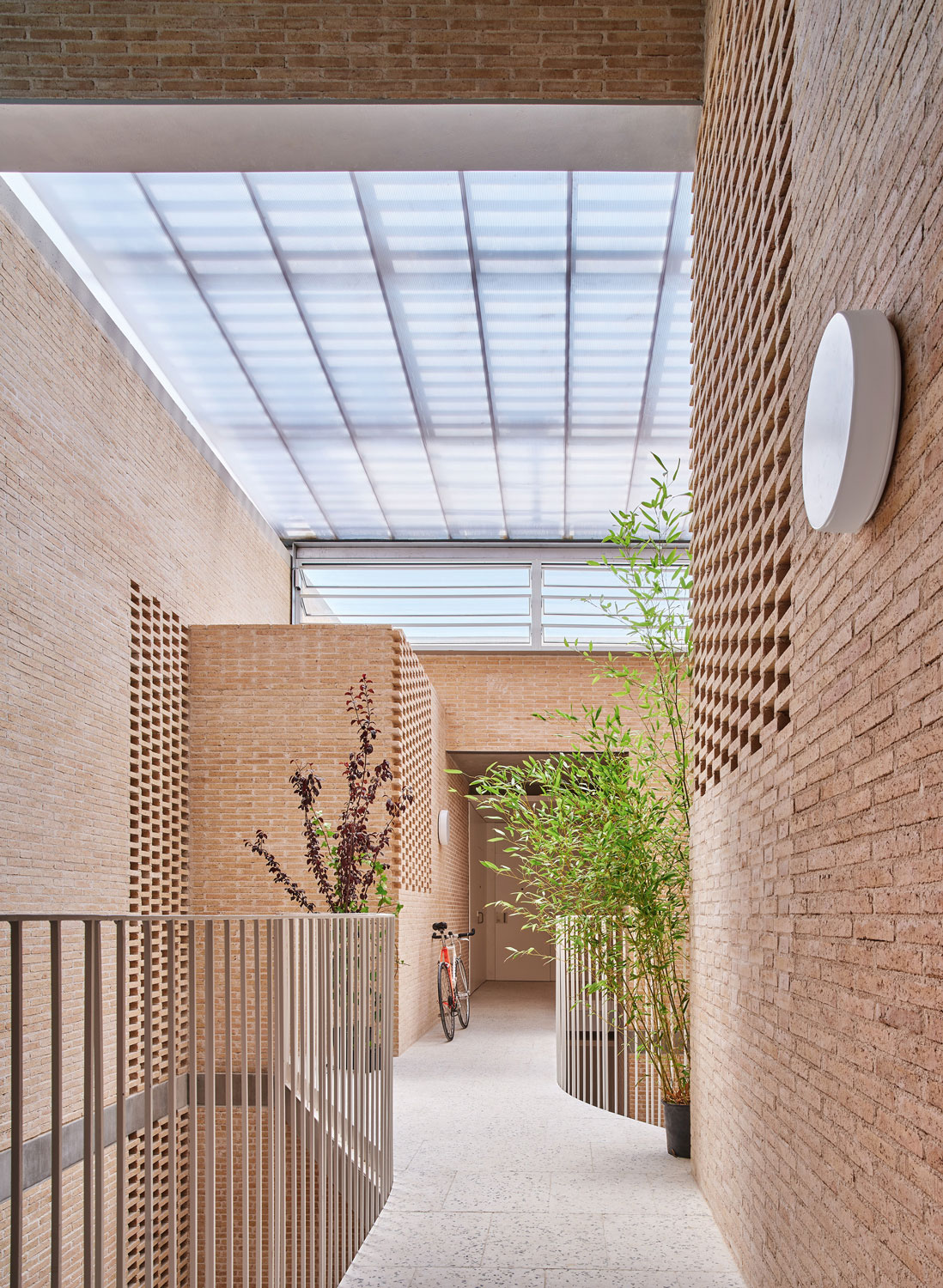 The materiality of biomass-fired hand brick gives inertia to the atrium and allows the rigging of lattices, which provide privacy, ventilation in the atrium and anti-intrusion mechanisms on the ground floor. The continuity of the material in the atrium generates an exteriorized atmosphere that qualifies the intermediate spaces.