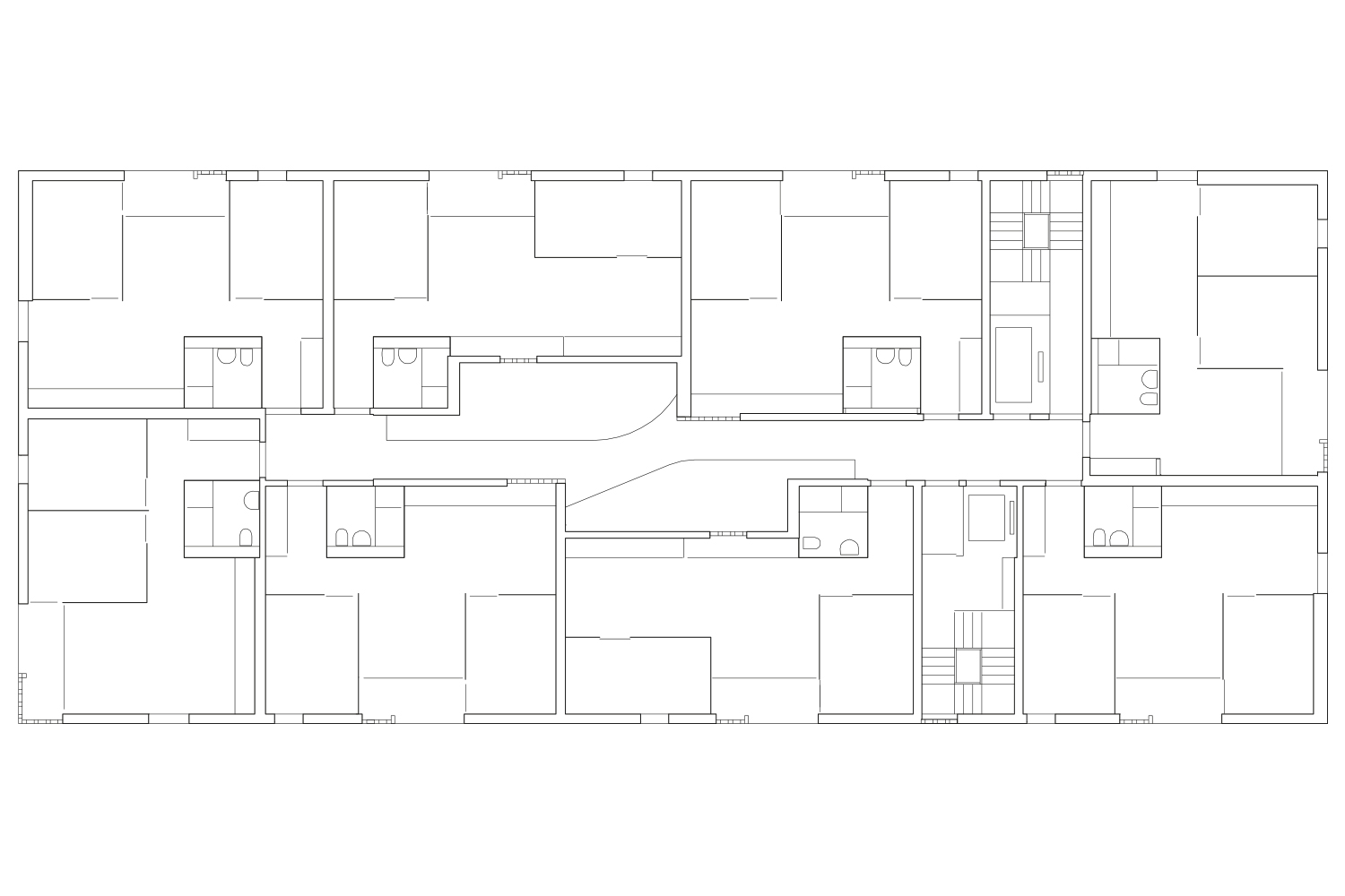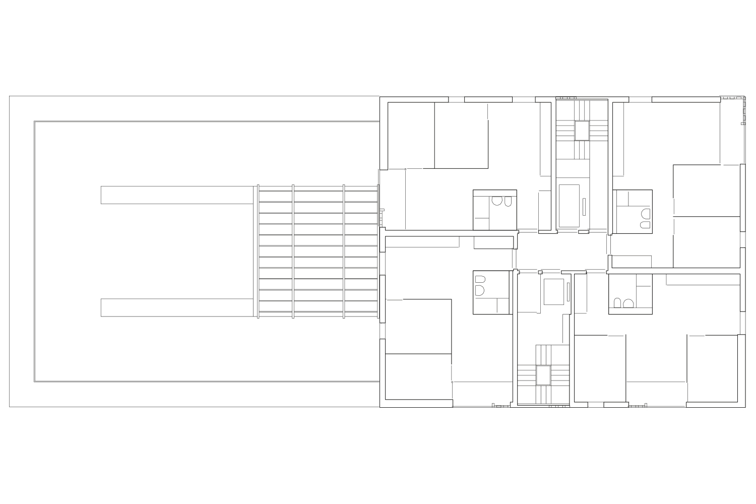 The 10-metre span structure allows a free floor plan where the bathroom and kitchen are grouped in the dividing wall to give flexibility to the rest of the floor plan and thus offer three possible layouts and three different ways of living. From the conventional layout that arranges the living room in the corner, separating the day and night areas, to a layout that groups the rooms in the corner, differentiating the kitchen-dining room area from the living room, preventing the functions of the distant spaces from interfering with each other. And an intermediate option where the living room occupies a central position to have two differentiated but visually connected spaces. These arrangements allow for cross ventilation through the day area.