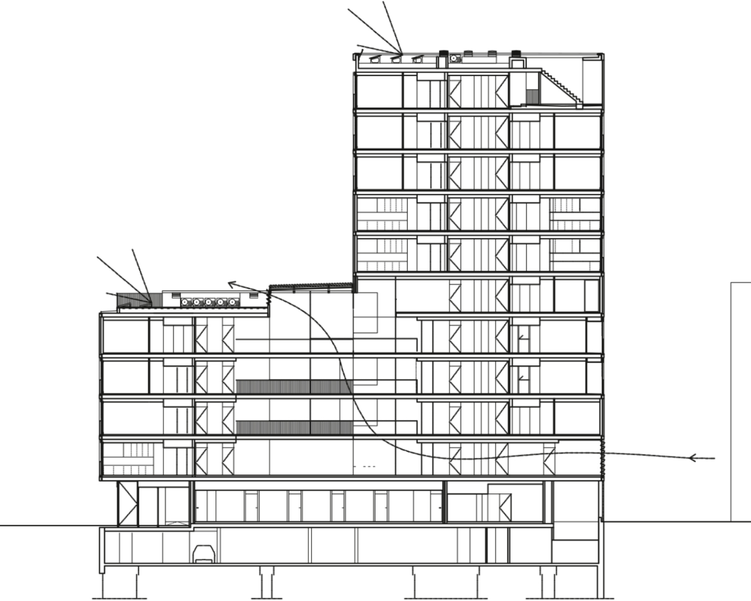 The volumetry determined by the planning combines an aggregation of four flats per landing on the six floors of the tower and a central walkway with eight flats on the first four floors, giving a total of 54 flats. A bioclimatic atrium at the center of gravity of the building illuminates, ventilates and qualifies the walkway, while ensuring cross ventilation of all dwellings. The atrium acts as a solar collector in winter, reducing the building's form factor, while in summer it acts as a solar chimney, increasing the dissipation surface. An air inlet on the first floor of the north façade allows the air in the atrium to be renewed. A terrace on the fifth floor and a viewing patio on the tenth floor extend and polarize the shared common areas of the building.