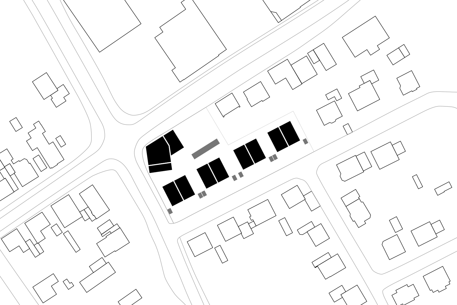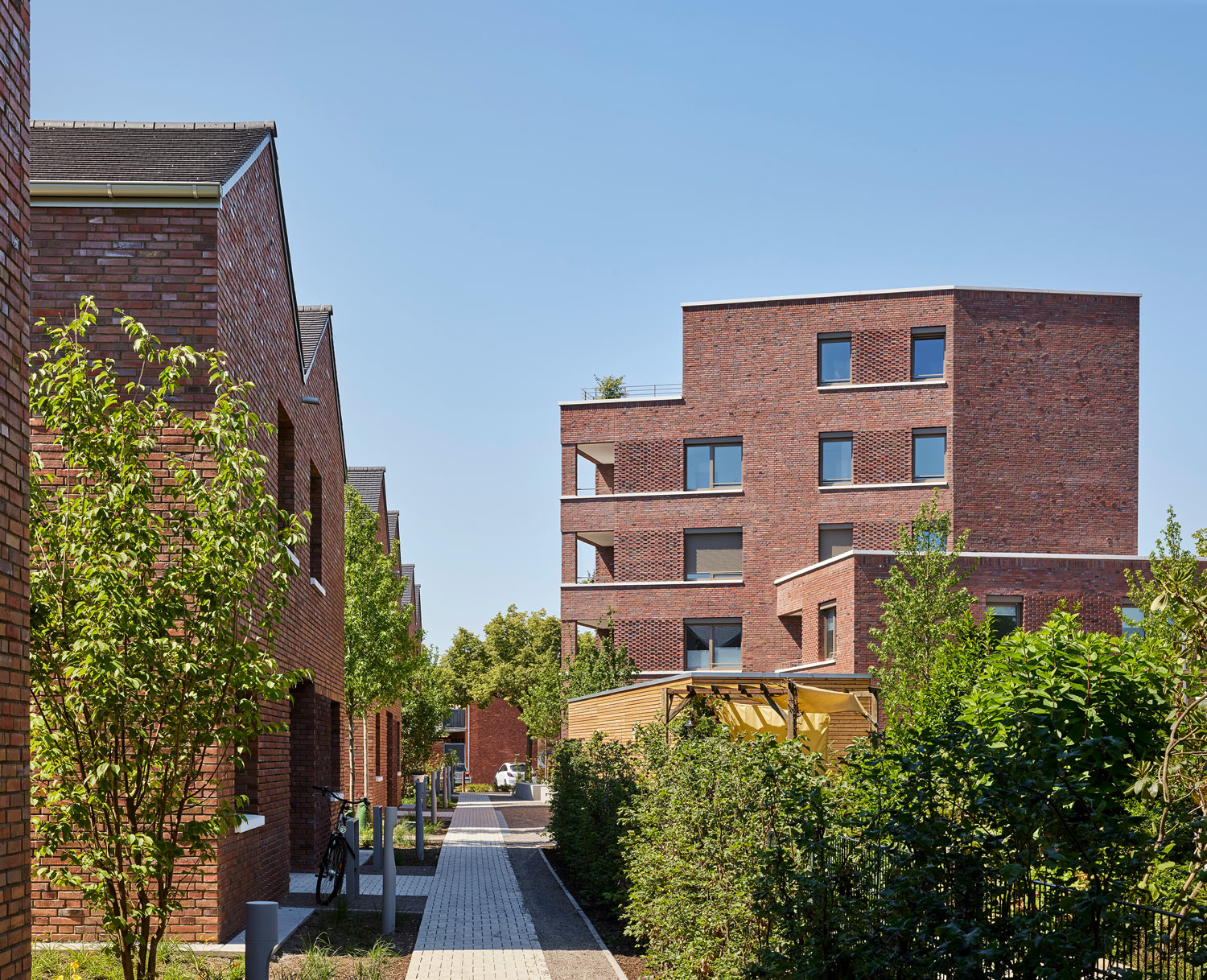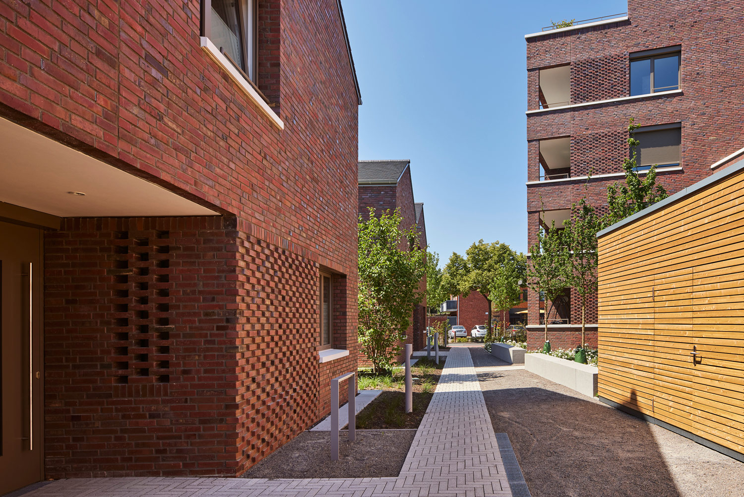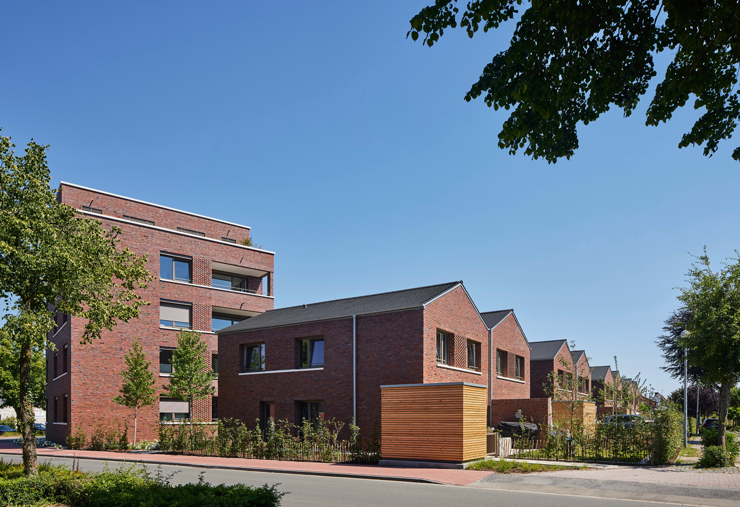 Im südlichen Teil des Grundstücks entstanden acht Mieteinheiten in vier zweigeschossigen Doppelhäusern mit einem flach geneigten Satteldach. Die traditionell wirkenden giebelständigen Doppelhäuser übernehmen die Gebäudekubatur der bestehenden Wohnbebauung und fügen sich städtebaulich logisch ein. Durch den typisch westfälischen roten Klinker und dem Dach mit dunkler Biberschwanzdeckung entsteht mit dem Bestand ein harmonisches Ensemble. Die Neubauten passen sich dem genius loci an, bilden neue städtebauliche Räume und definieren somit den Ort neu, sodass eine Identifikation der Bewohner mit dem Ort gegeben ist.