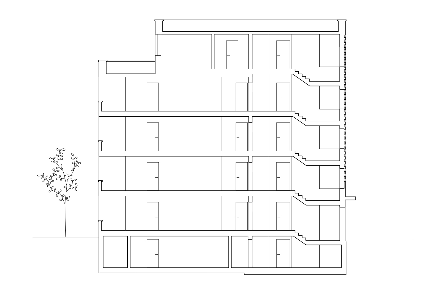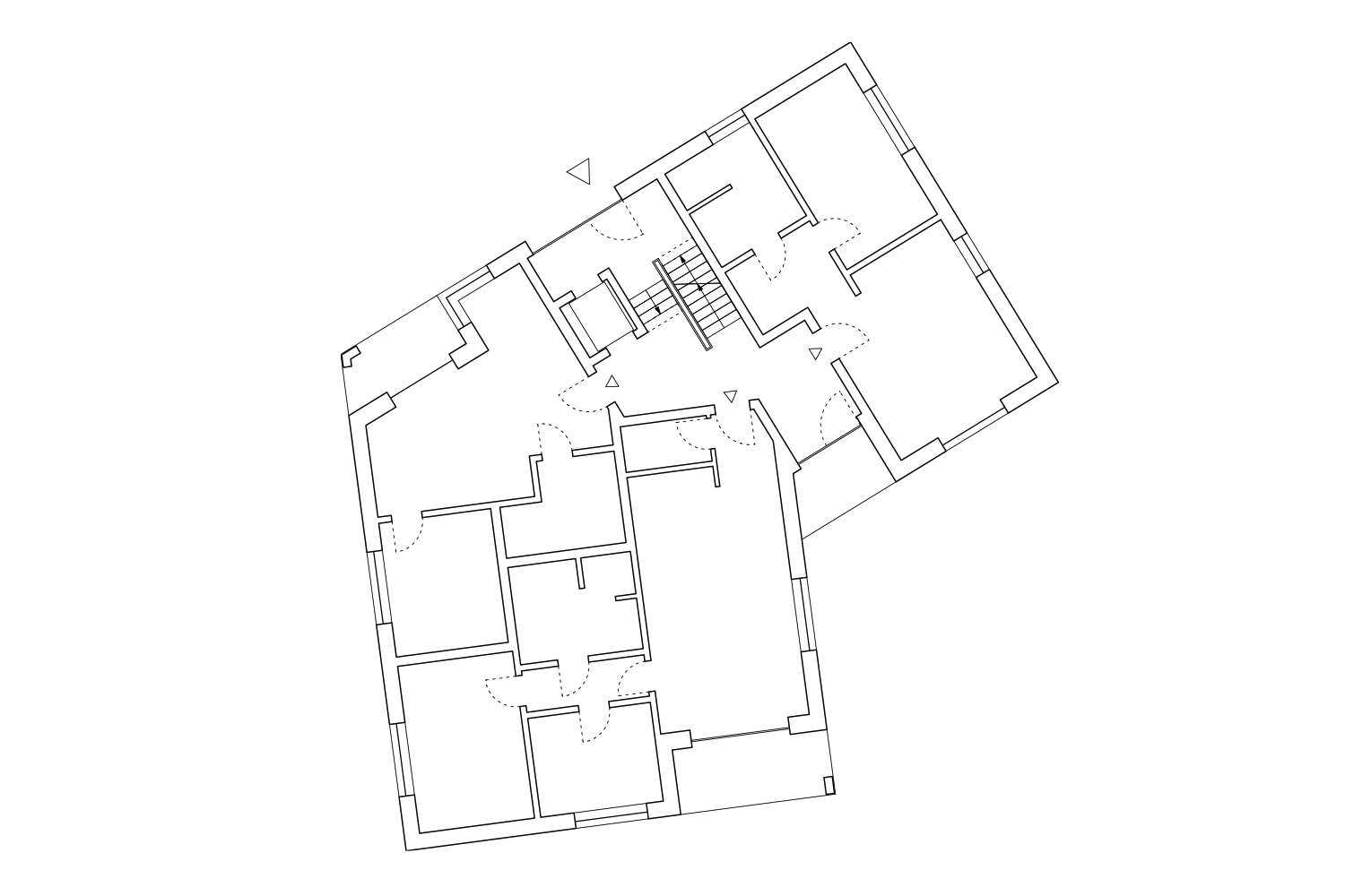 Im nördlichen Bereich zur Kreuzung entstand ein moderner fünfgeschossiger Baukörper, der sich durch seine polygonale Kubatur und Höhenstaffelung spielerisch in die Nachbarbebauung einfügt und den Kreuzungsbereich selbstbewusst städtebaulich neu definiert, fasst und belebt. Um der sozialen Verantwortung gerecht zu werden, wurde auf jedem Regelgeschoss eine öffentlich geförderte Wohnung realisiert. Die Wohnungen verfügen entweder über eine Terrasse oder eine Loggia, die teilweise über Eck geführt ist und somit das Gebäude mit der Umgebung verzahnt.
