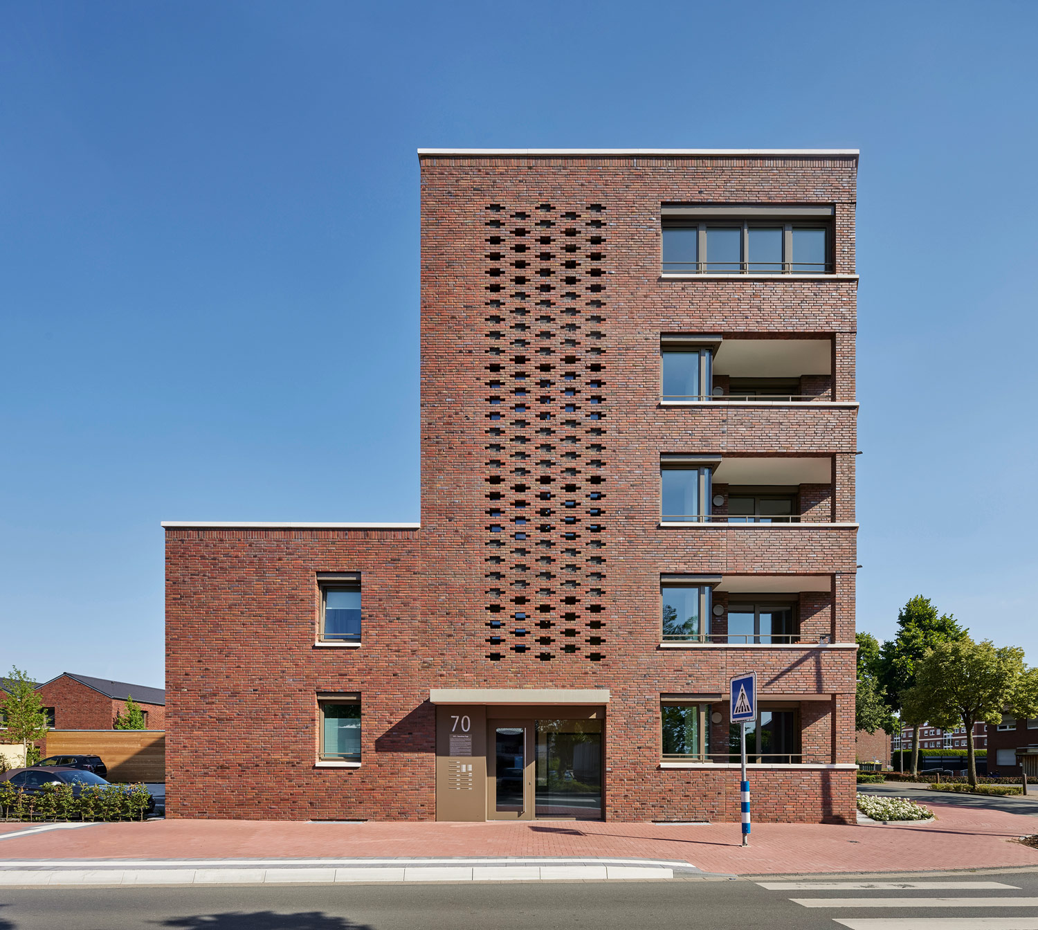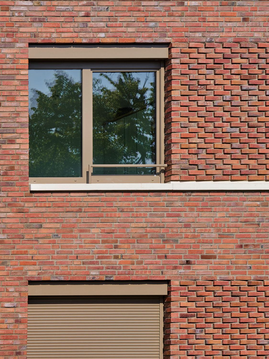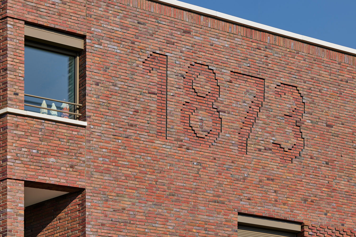 Durch die differenzierte Ausformulierung der Fassaden aus einem warmen roten, im Ringofen hergestellten Torfbrandklinker mit hellen Sichtbetonelementen und gepulverten Aluminiumelementen erhalten die Gebäude bei der gleichen Materialität in der Fassade einen ganz eigenen Charakter. Der detailreiche und expressive Umgang mit den Ornamentflächen, unterschiedlichen Mauerwerksverbänden sowie den kleinen Rücksprüngen erzeugt auf den Fassaden ein raffiniertes Licht- und Schattenspiel. Die tiefen Fensterlaibungen der großen Brüstungsfenster mit Absturzsicherungen vor den Öffnungsflügeln unterstreichen die fein detaillierte und handwerklich anspruchsvolle Fassadengestaltung, die die Bauherren sich neben dem Gründungsjahr auf der Hauptfassade des Mehrfamilienhauses für das Bauvorhaben gewünscht hatten.